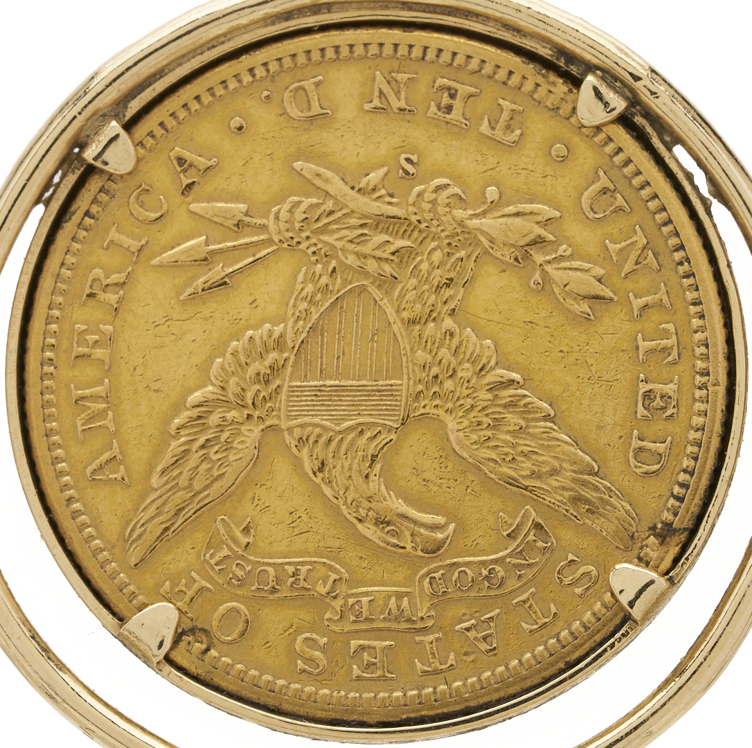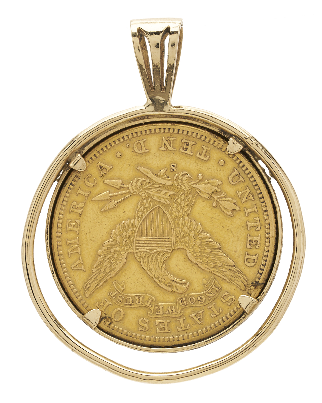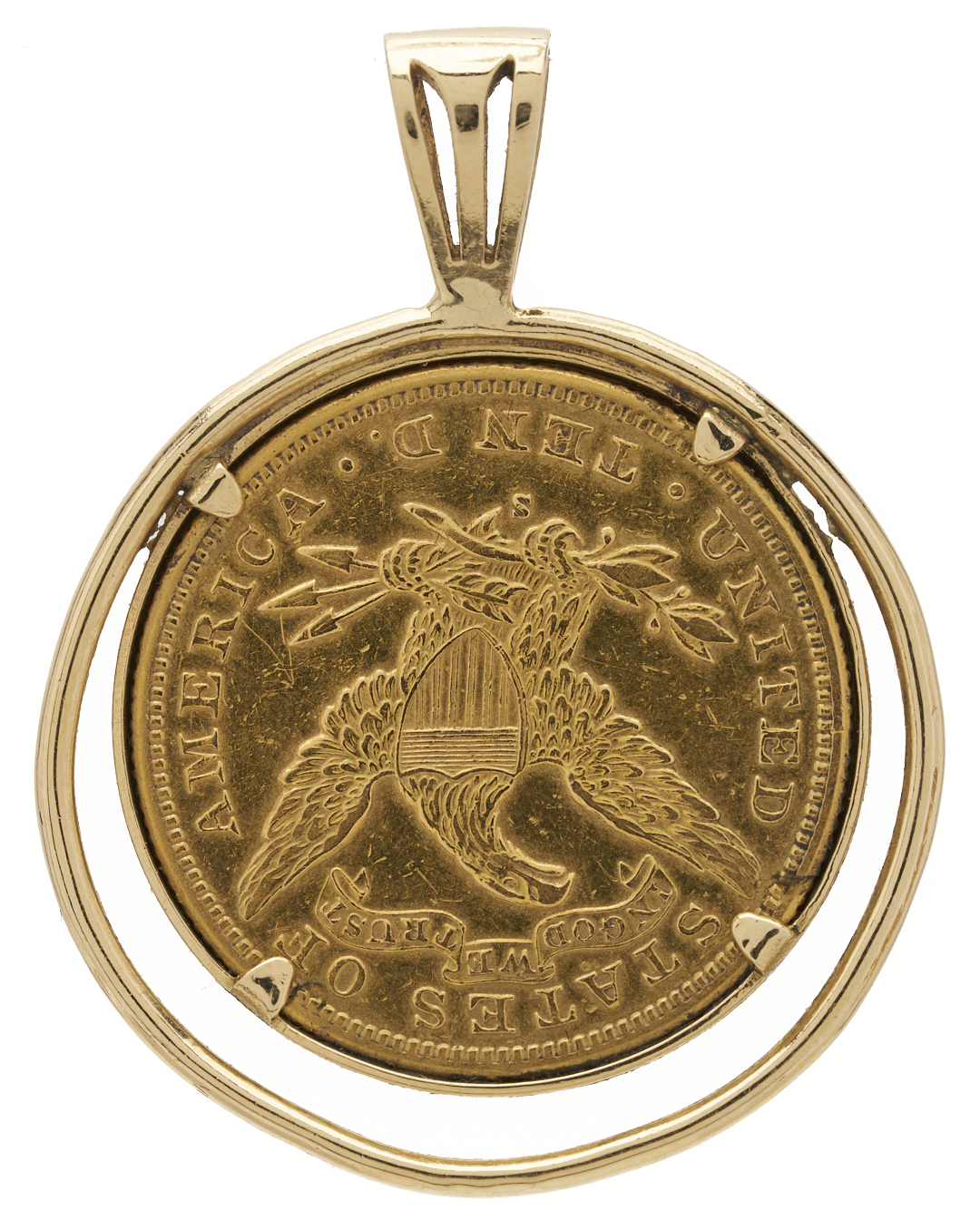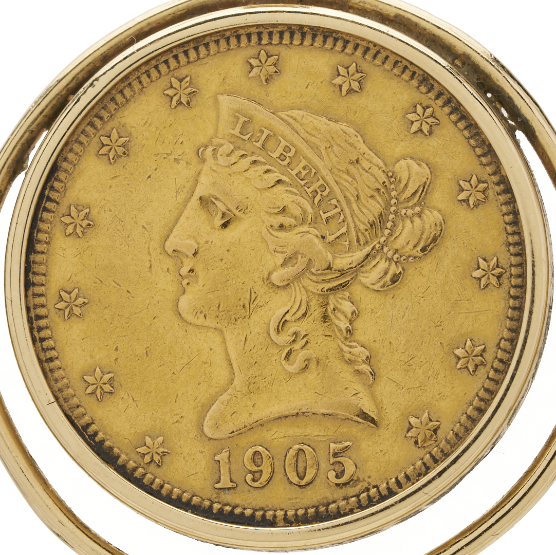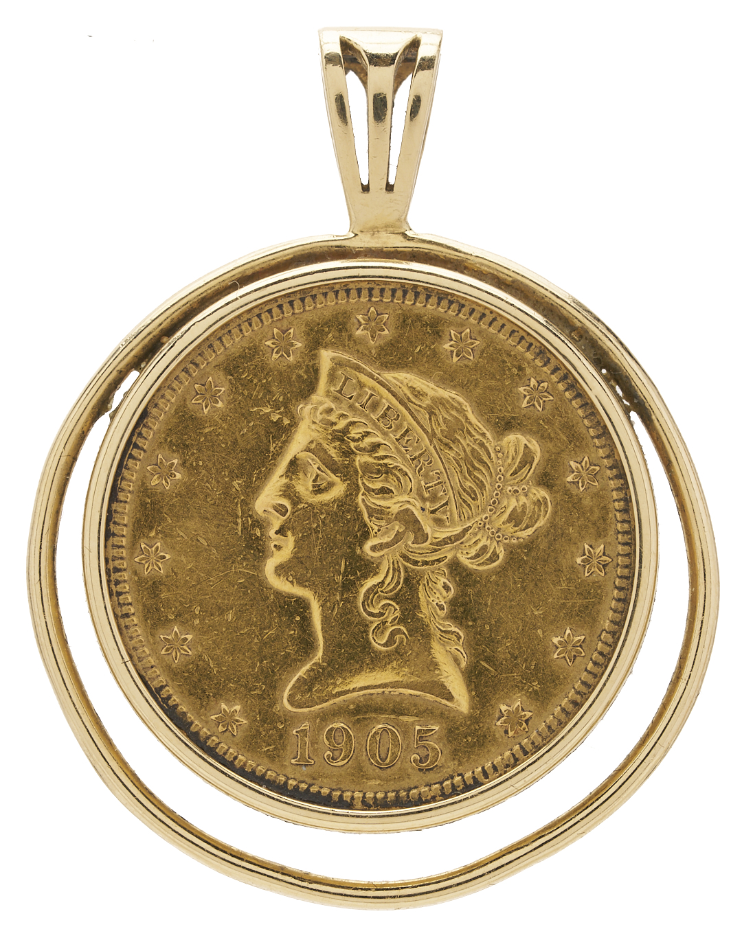 14K yellow gold pendant containing one (1) 1905-S $10 Liberty series eagle gold coin. The pendant XRF tests 14K gold and the coin XRF tests 90% gold. The pendant is 1 1/2 in. x 1 1/4 in. and has a gross weight of 21.89 grams.