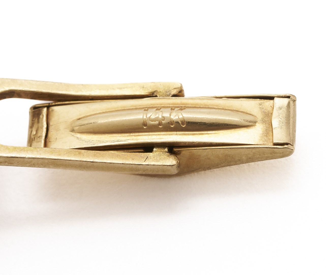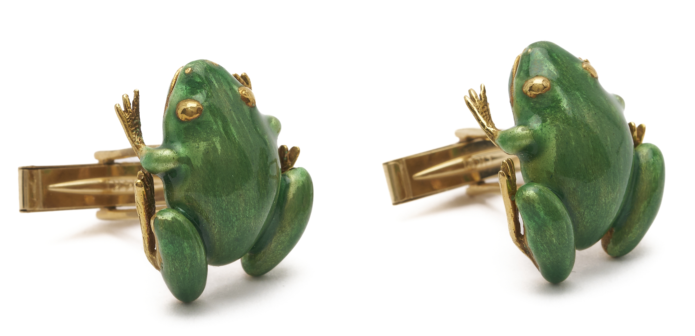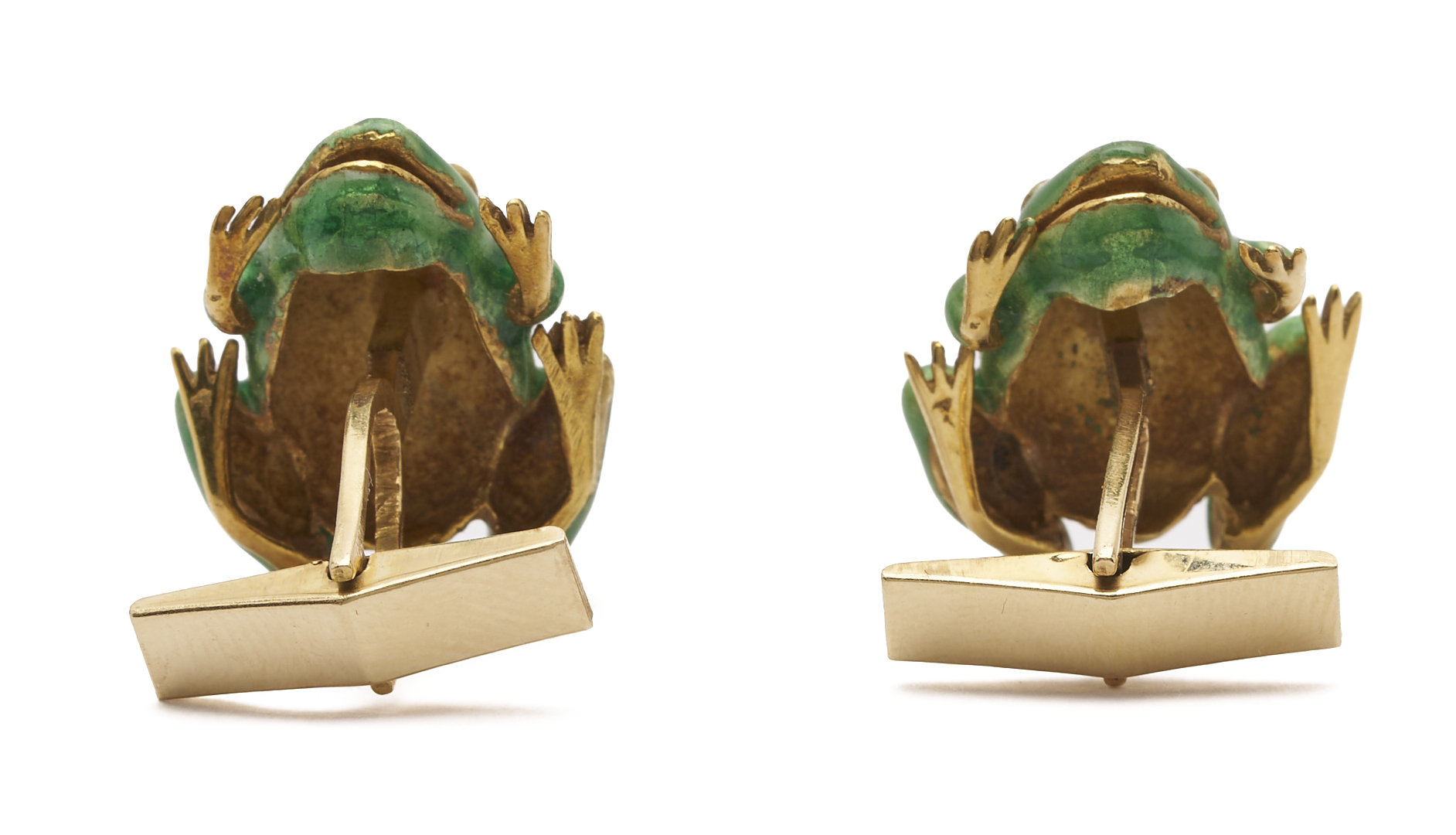 1st item: 14K yellow gold frog cufflinks. The cufflinks are marked “14K” and XRF test 14K gold. The cufflinks are 3/4 in. x 5/8 in. and have a gross weight of 17.36 grams. 2nd item: Ladies’ 14K yellow gold beach ball cufflinks. The cufflinks are marked “14K” and XRF test 14K gold. The cufflinks are 3/8 in. x 3/8 in. and have a gross weight of 12.74 grams. The gross weight of the lot is 30.1 grams.