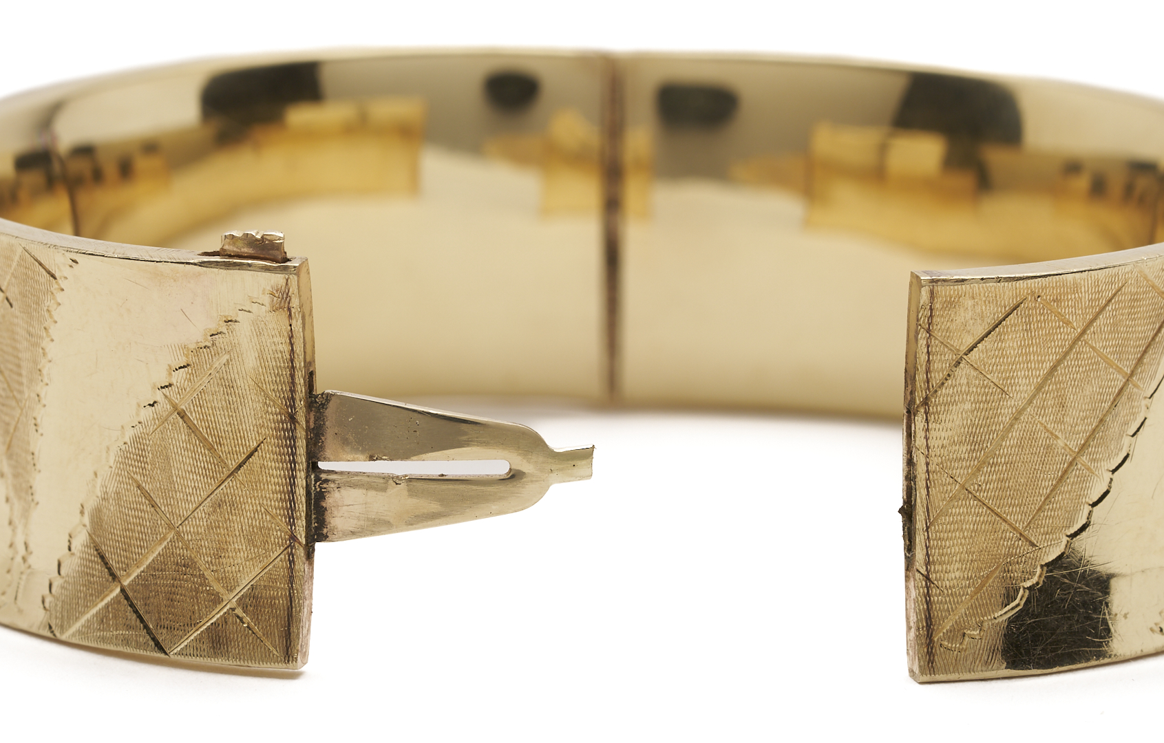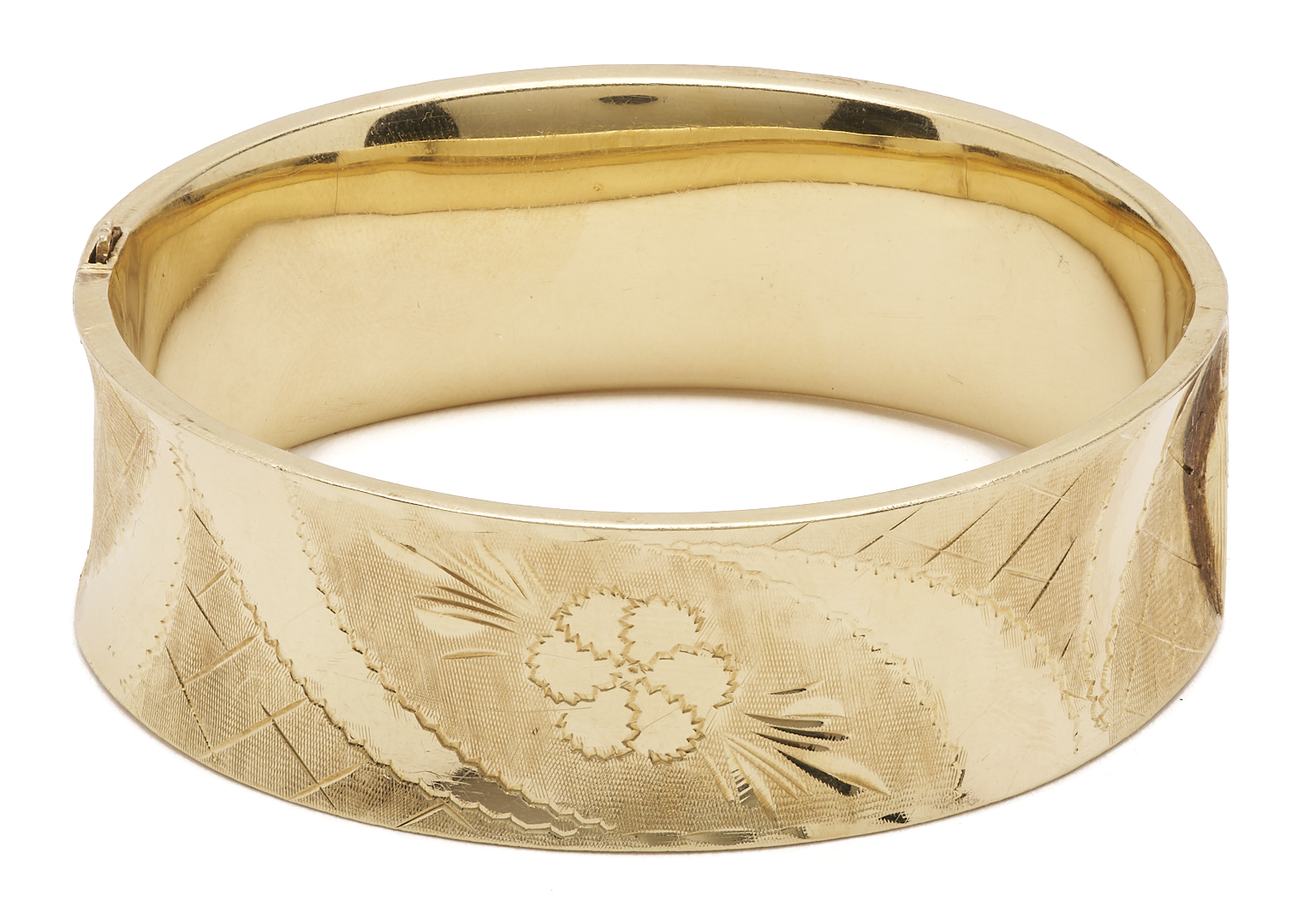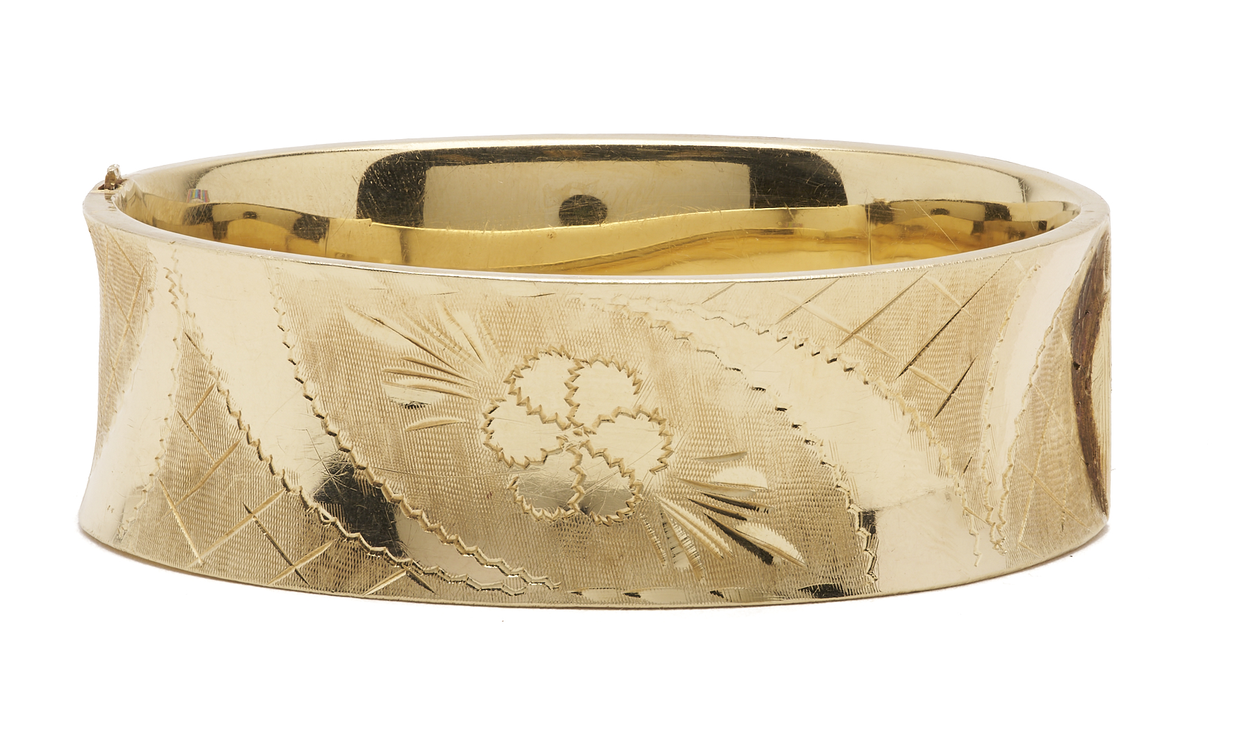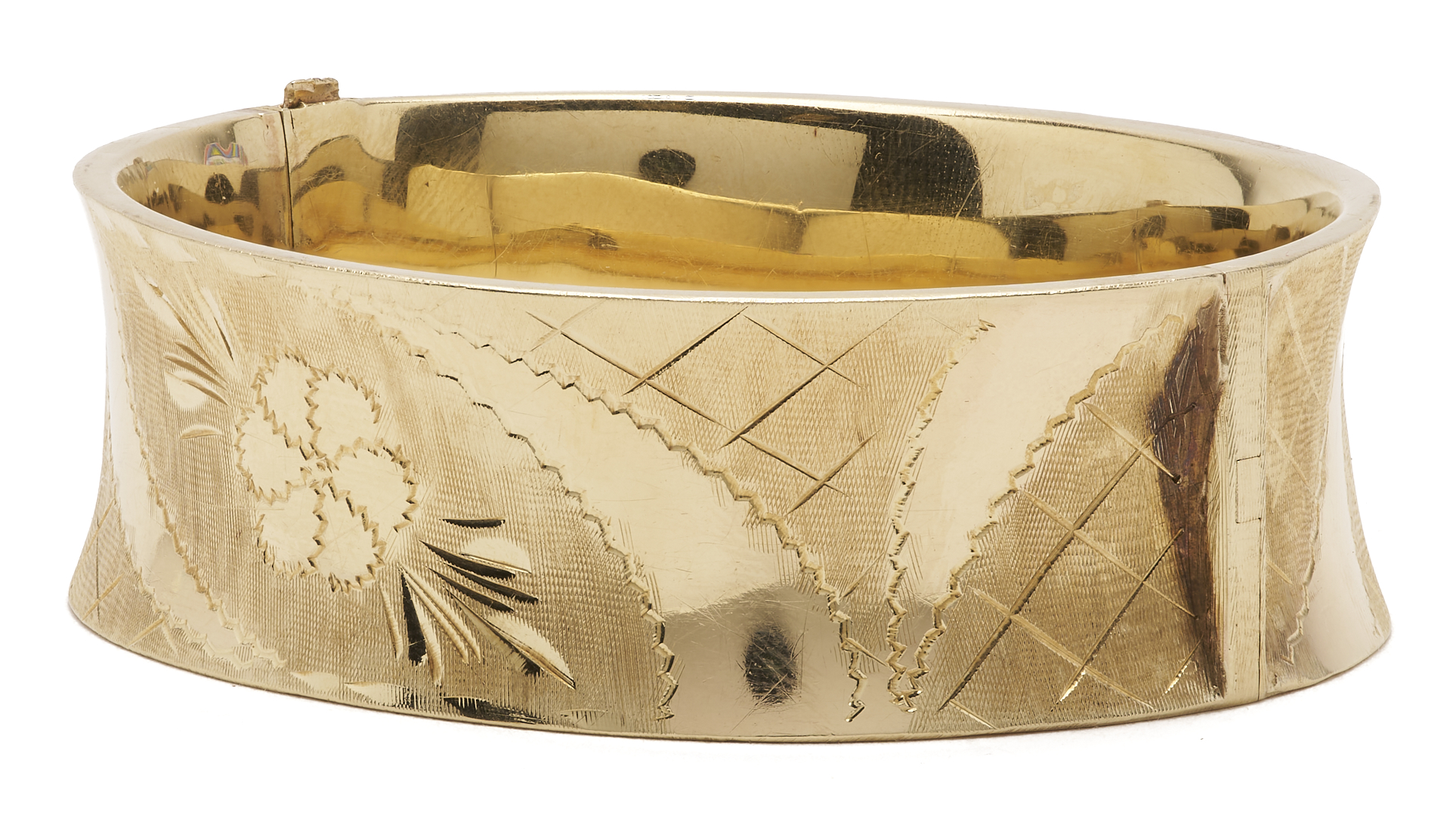 Ladies’ 14K yellow gold bracelet. The bracelet XRF tests 14K gold. The bracelet is 7 in. circumference x 3/4 in. wide and has a weight of 29.55 grams.