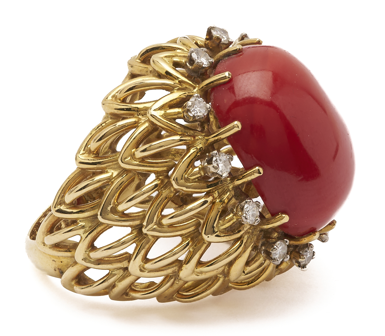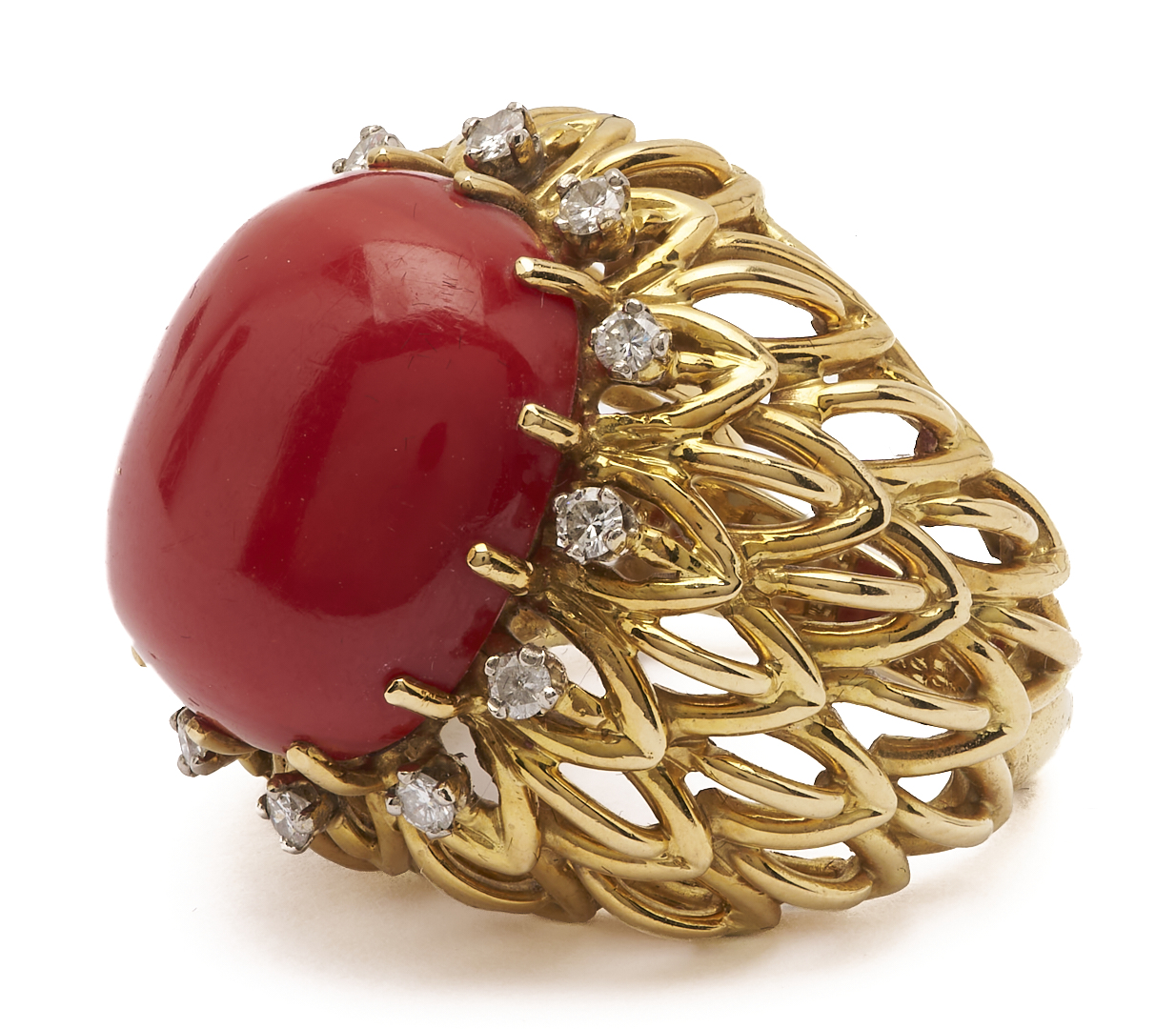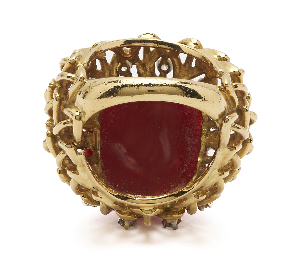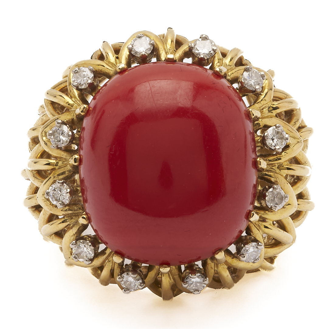 Ladies’ 18K yellow gold cocktail ring featuring one (1) natural cabochon coral accented by twelve (12) round brilliant cut melee diamonds. The ring is marked “750” and XRF tests 18K gold. The ring is size 6 1/2 and has a gross weight of 23.48 grams.