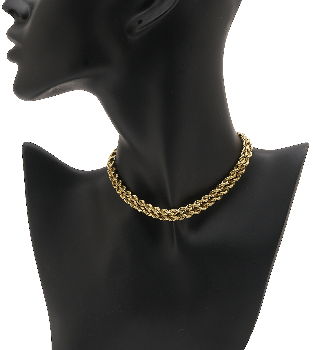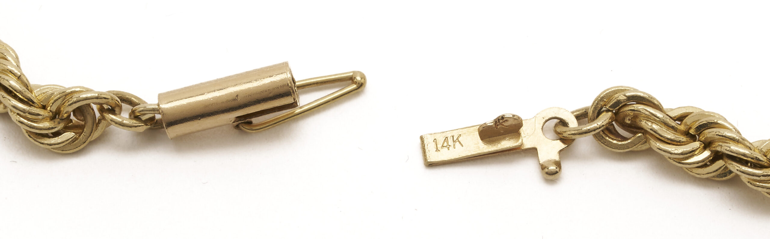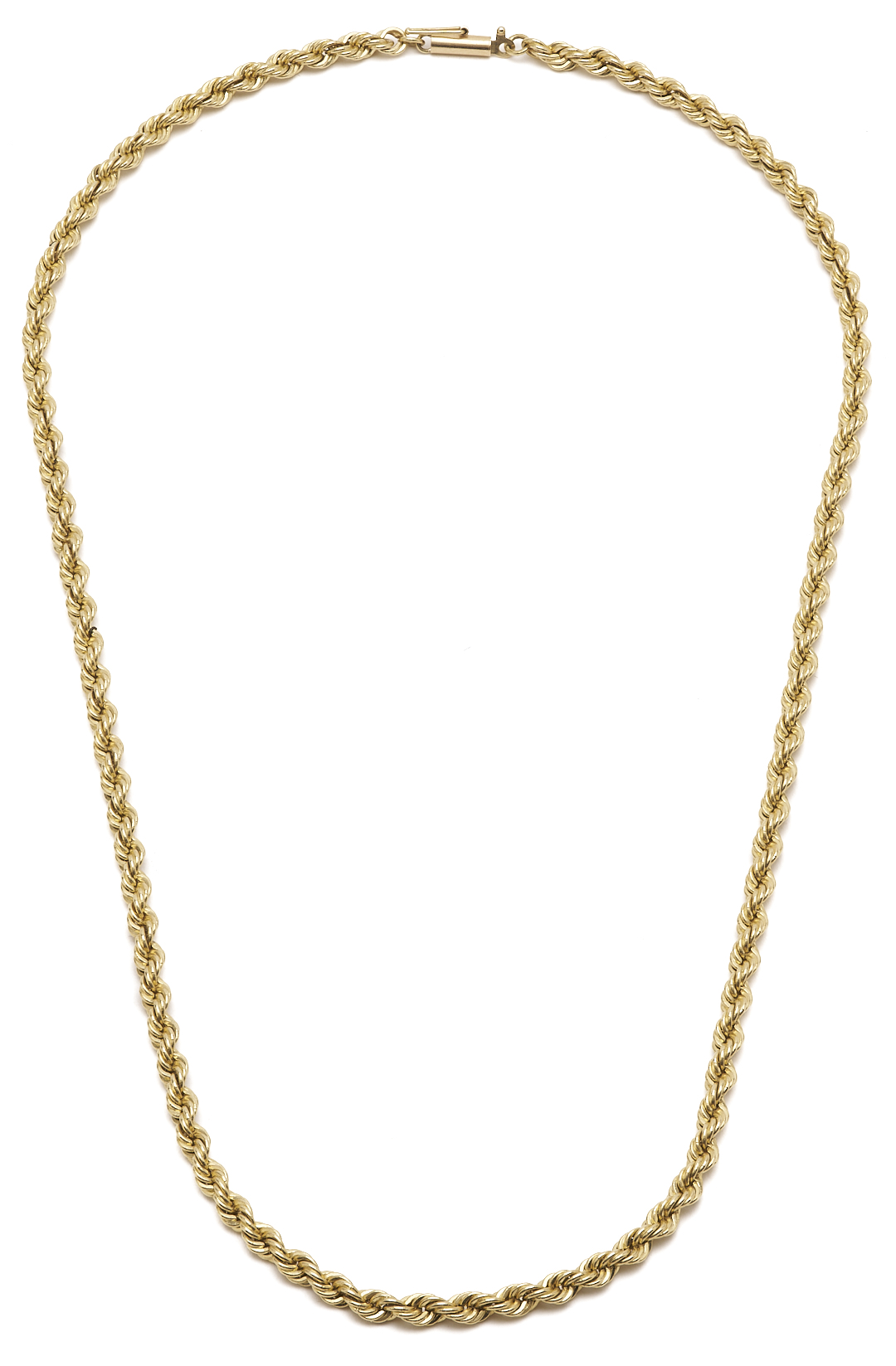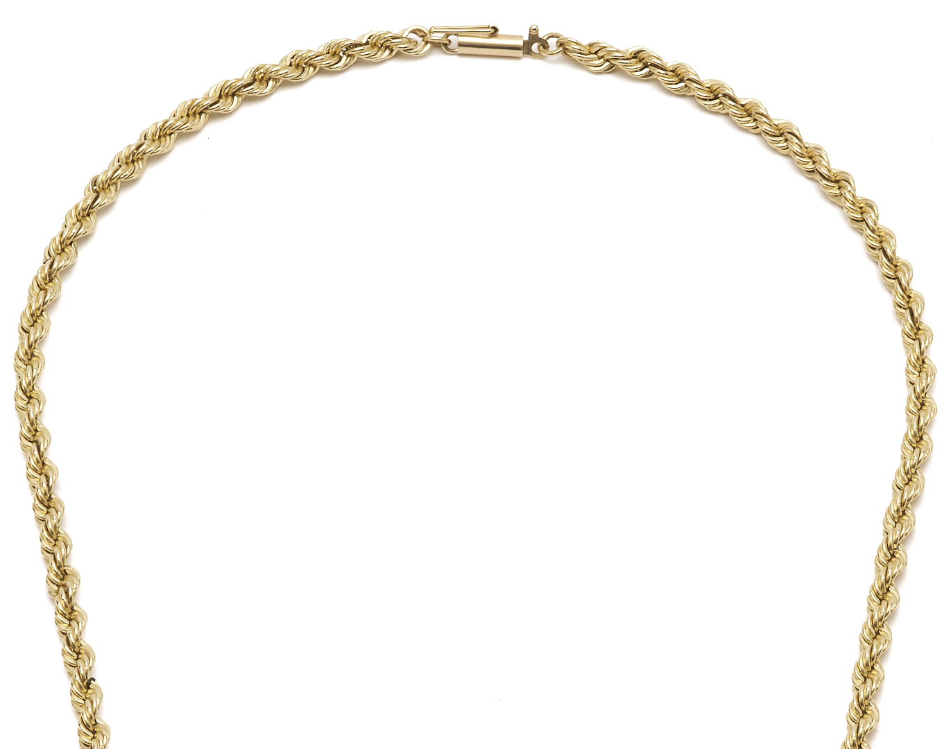 14K yellow gold 4mm rope chain necklace. The necklace is marked “14K” and XRF tests 14K gold. The necklace is 20 in. L. and has a weight of 29.53 grams.