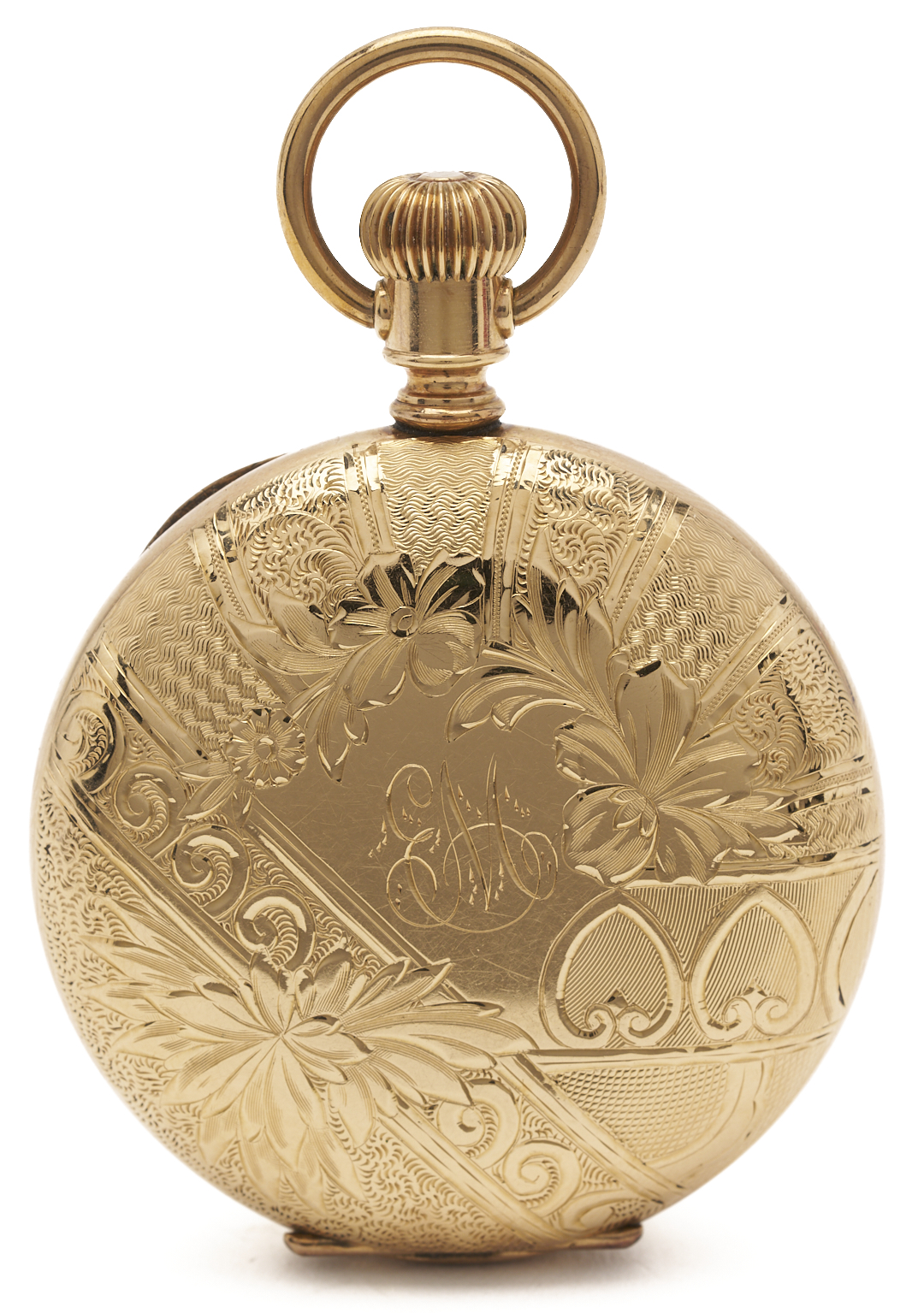 Waltham model 1889 size 6s pocket watch. The watch is in a 14K yellow gold hunting case containing an engraved house and mountain vignette. The case is marked “14K” and XRF tests 14K gold. The serial number is 83374 and was produced in 1891. Gross weight of the watch is 62.14 grams.