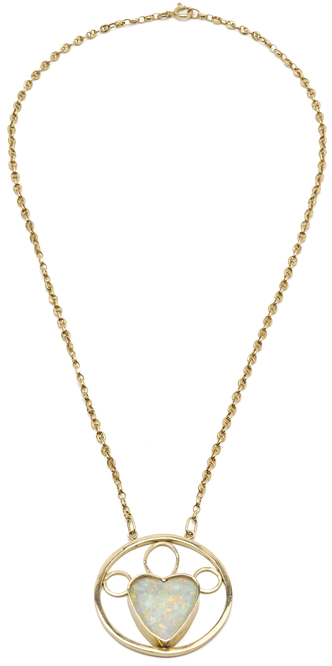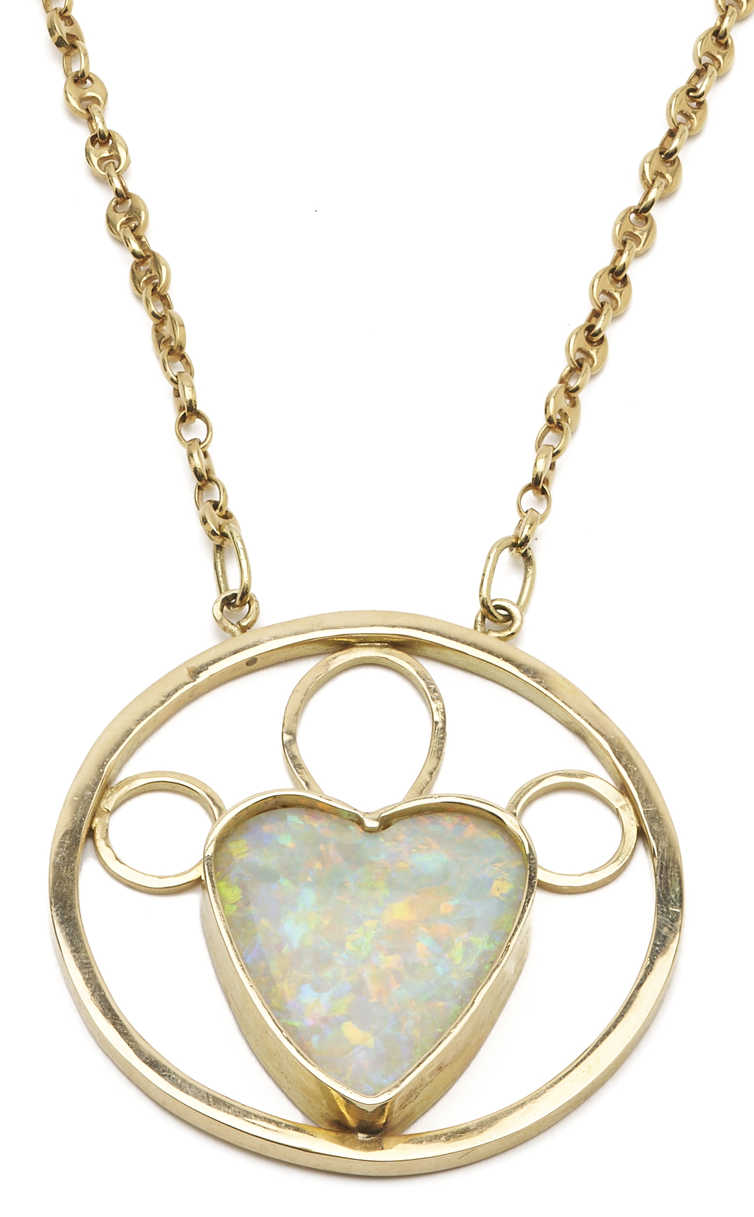 Ladies’ 14K yellow gold necklace featuring one (1) natural heart shaped Australian opal with strong blue/green/red play of color approximately 8.40 carats in size. The necklace is marked “14K Italy 585 84” and XRF tests 14K gold. The necklace is 20 in. L. and has a gross weight of 24.57 grams.