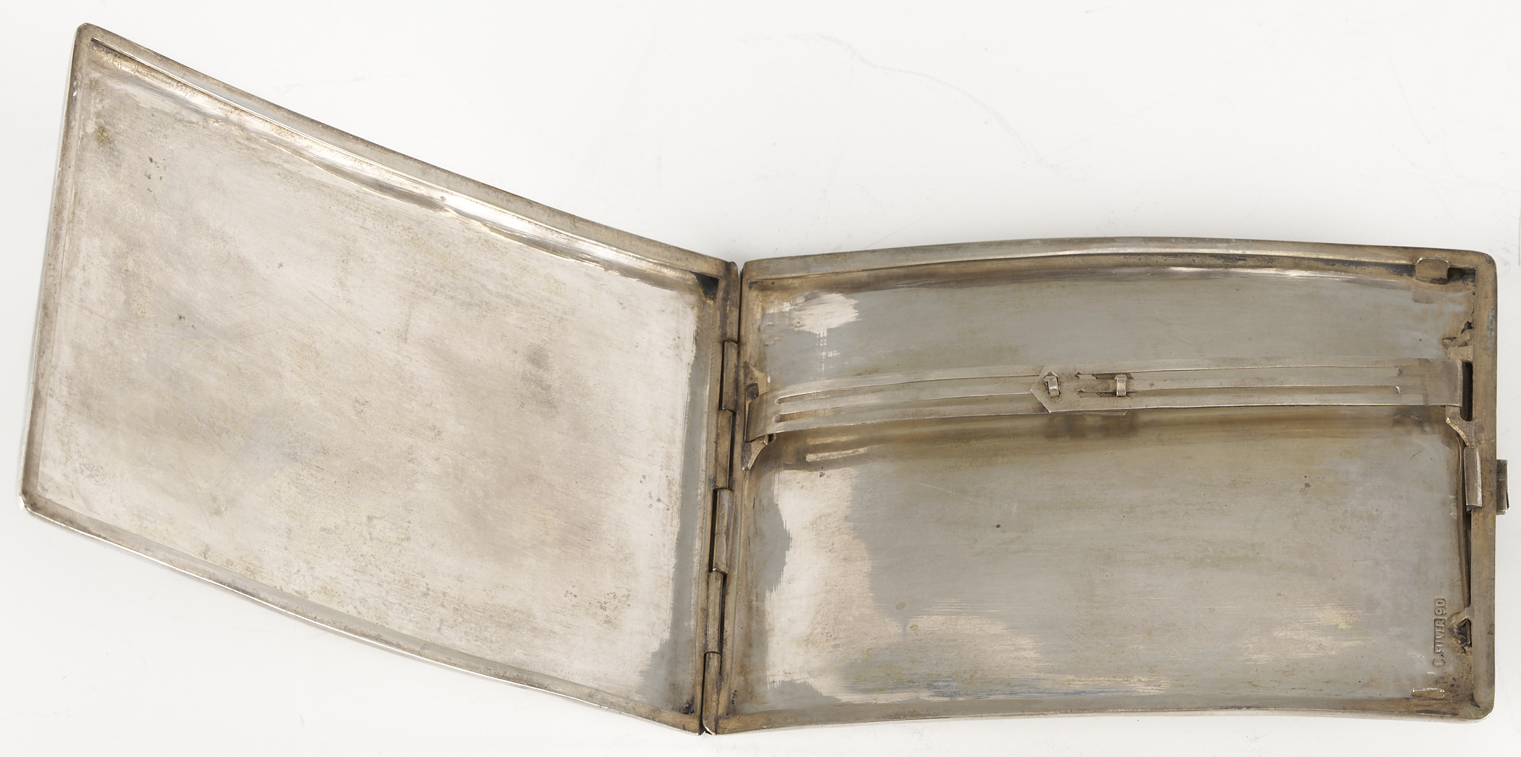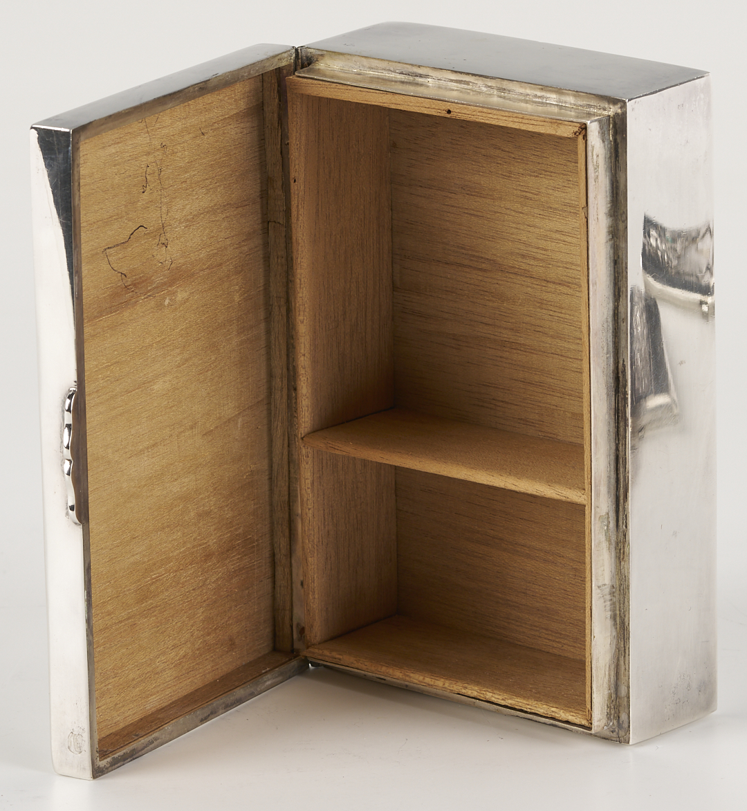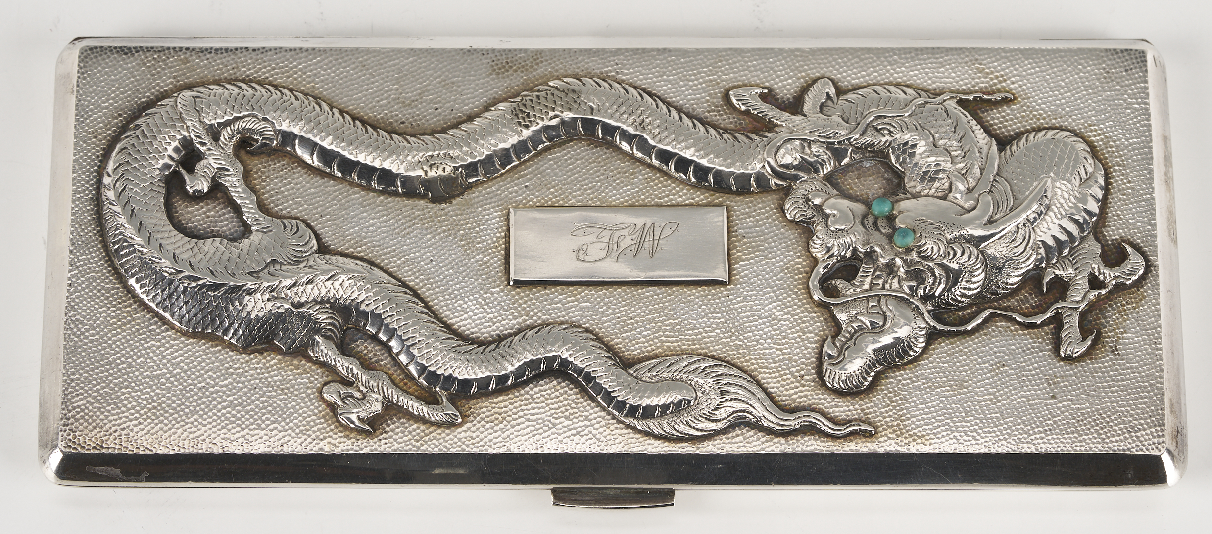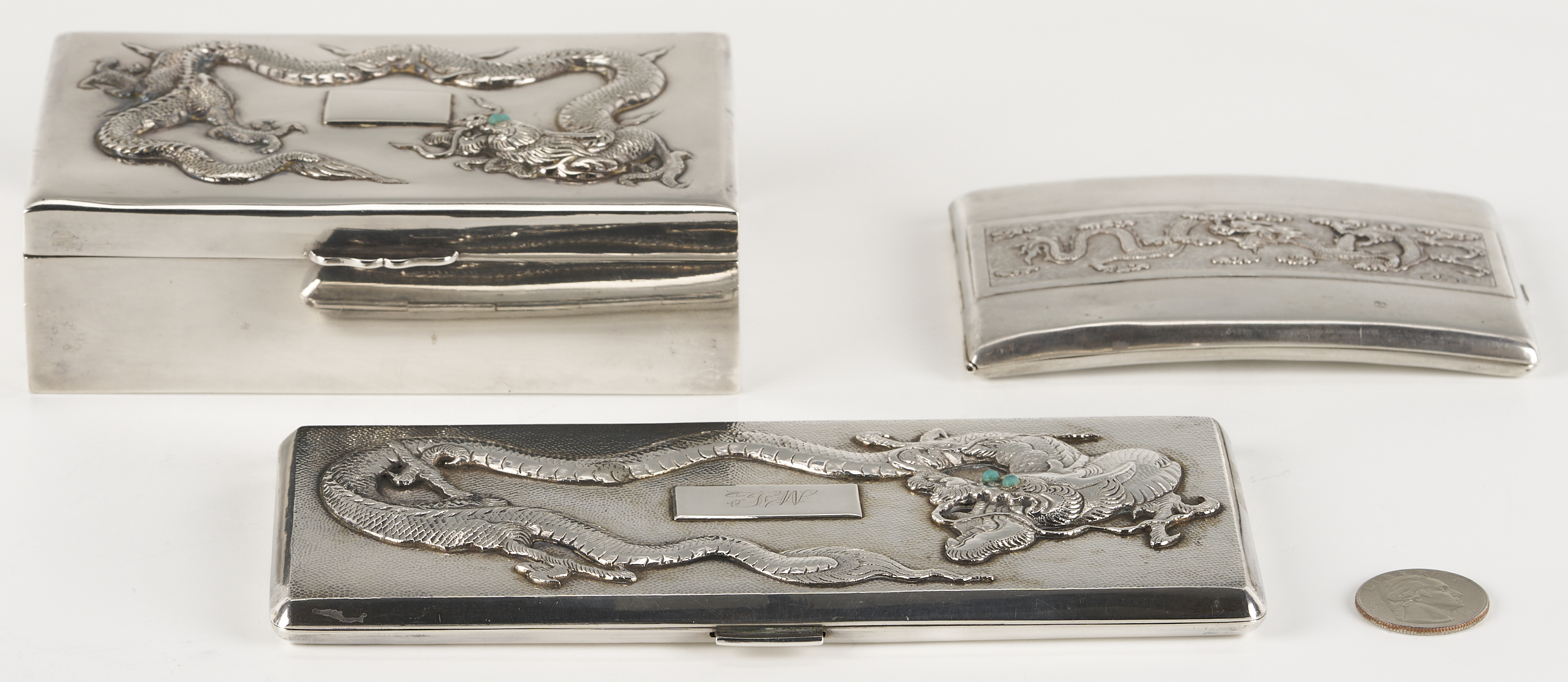 Three (3) Chinese silver boxes with raised dragon decoration, including two cigarette cases stamped “silver” and “90,” and one trinket box with wood interior, stamped “Sterling/Made in Hong Kong.” The trinket box and long cigarette case feature inset turquoise dragon eyes. Cigarette cases: 7 in. x 3 in. x 3/4 in. Trinket Box: 5 1/2 in. x 3 1/2 in. x 1 1/3 in. Combined weighable silver: 11.74 oz (does not include trinket box). Early to mid 20th century.