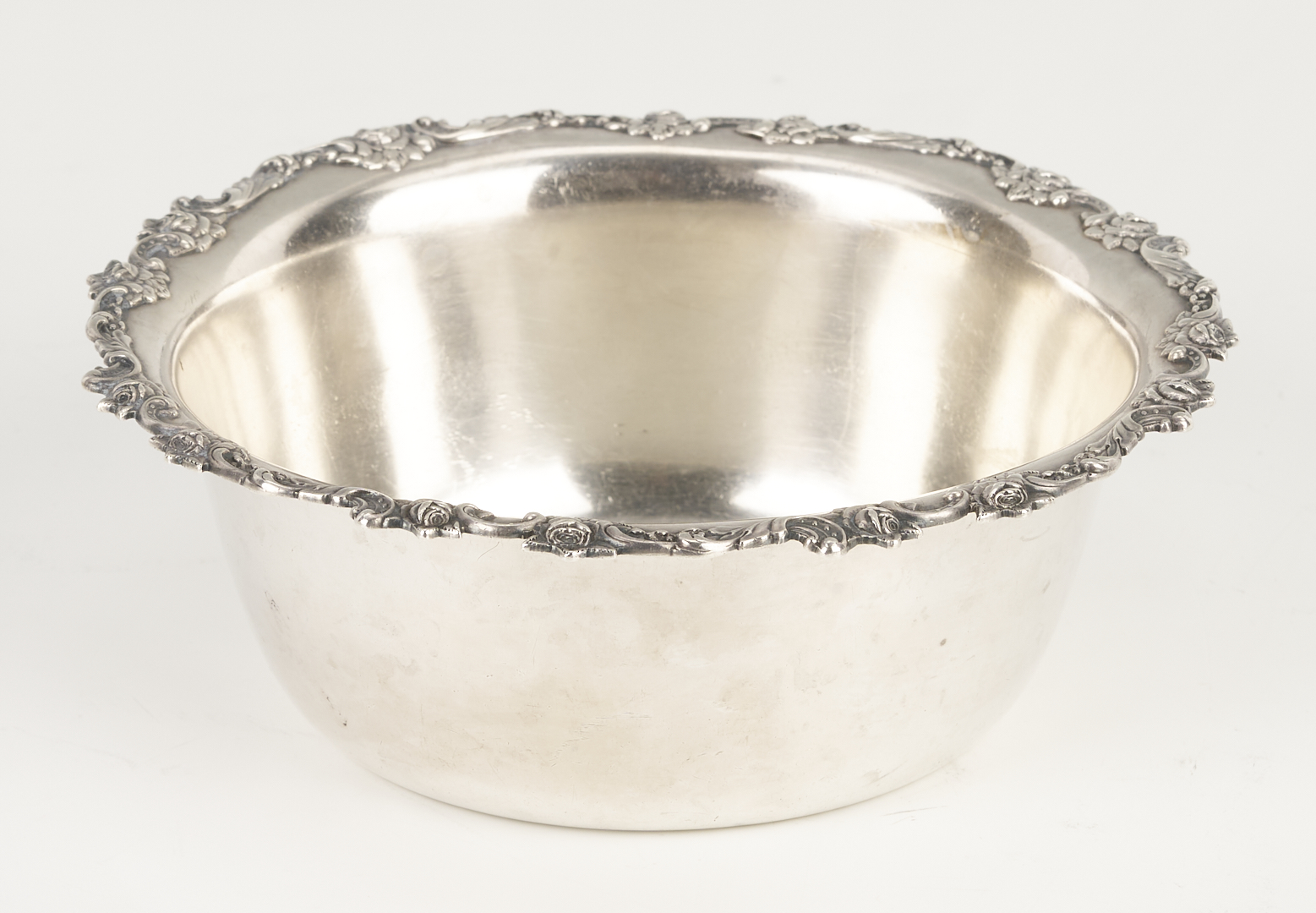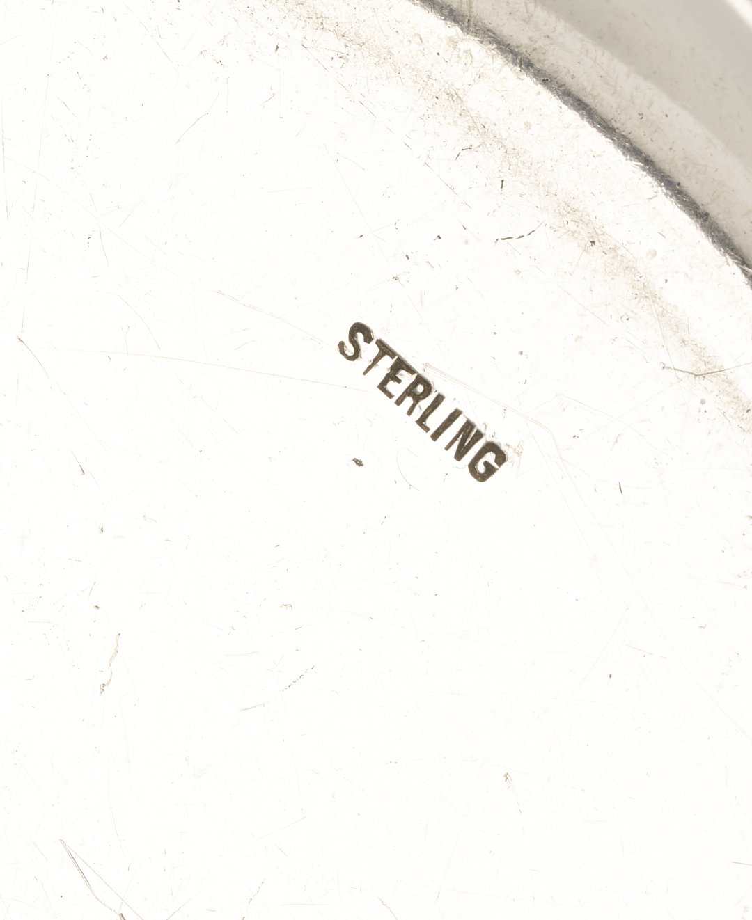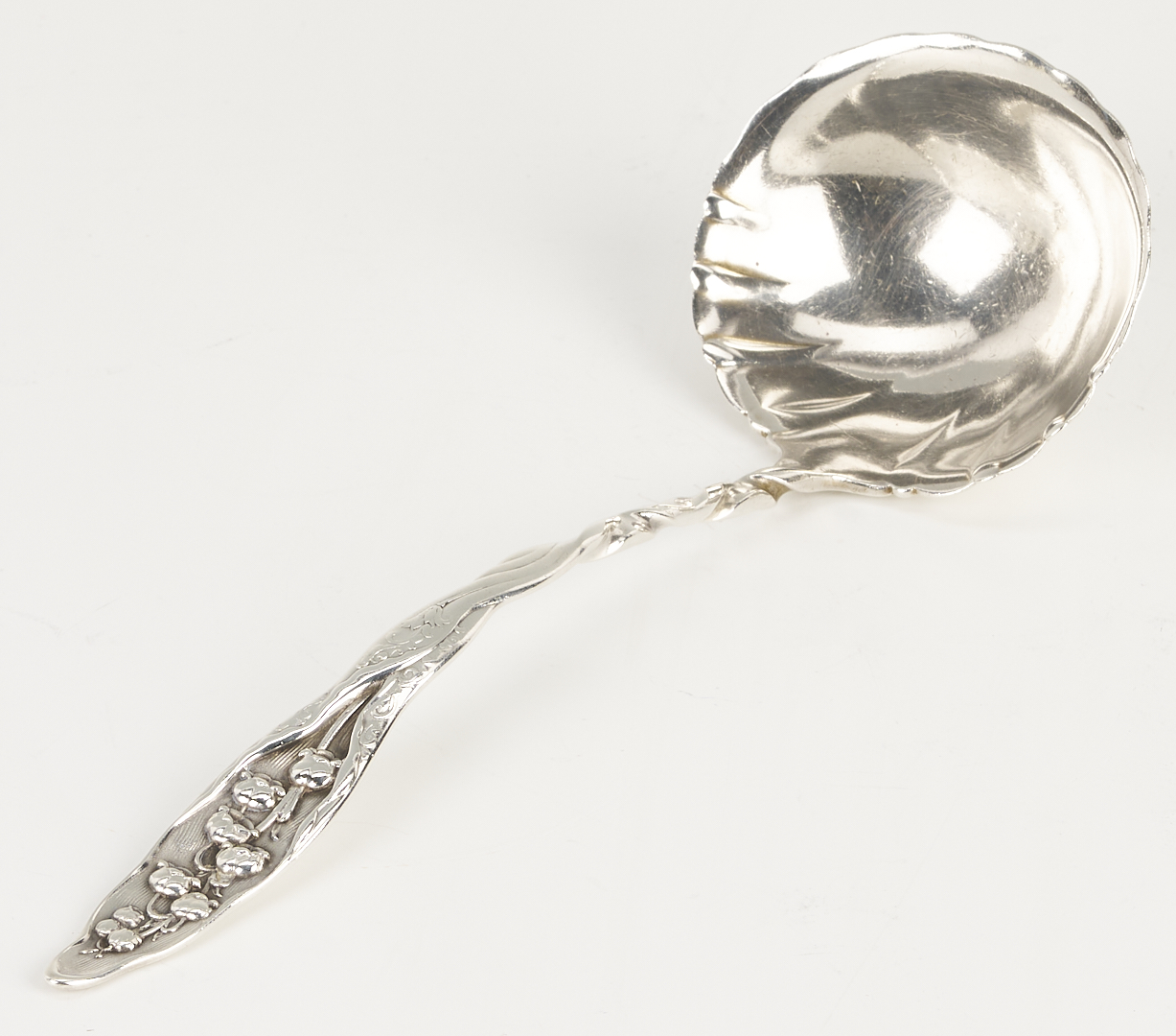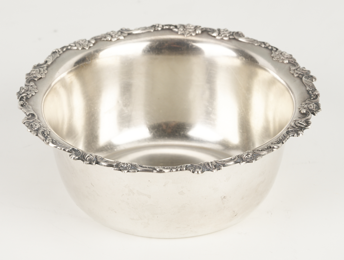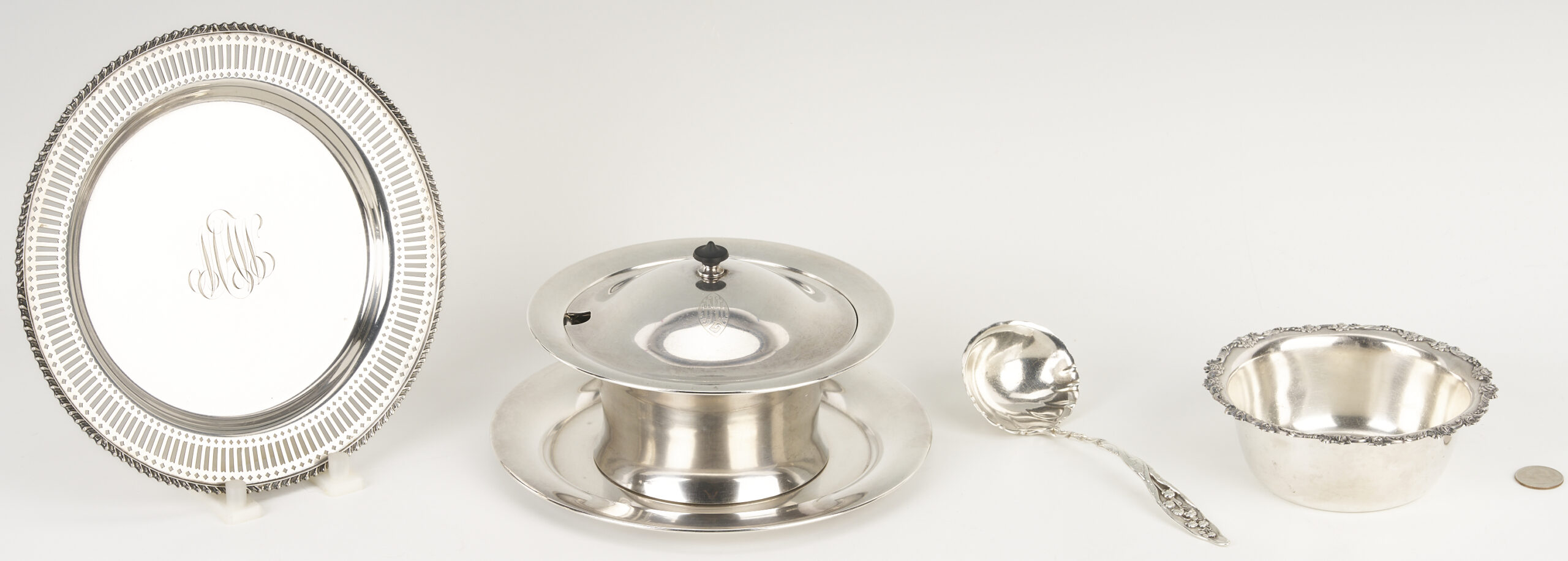 Four (4) sterling silver hollowware table items, including 1 Towle Sterling Silver round sauce serving dish with attached underplate; 1 associated Whiting Lily of the Valley pattern gravy ladle; 1 small deep bowl marked “sterling” with floral scroll rim (5 1/2 in. diameter); and 1 Towle sterling plate with reticulated rim, 9 in. diameter. Combined weight: 43.87 oz troy.
