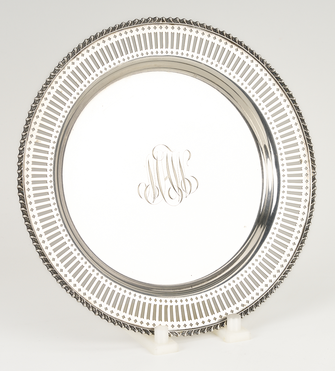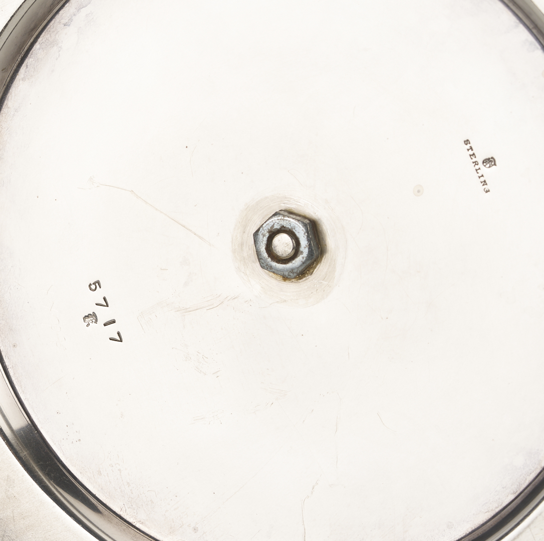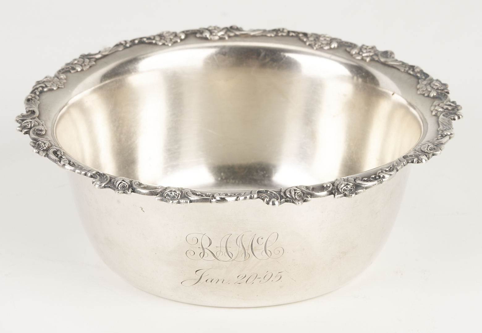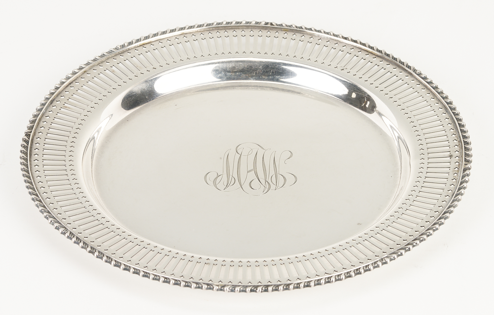 Four (4) sterling silver hollowware table items, including 1 Towle Sterling Silver round sauce serving dish with attached underplate; 1 associated Whiting Lily of the Valley pattern gravy ladle; 1 small deep bowl marked “sterling” with floral scroll rim (5 1/2 in. diameter); and 1 Towle sterling plate with reticulated rim, 9 in. diameter. Combined weight: 43.87 oz troy.