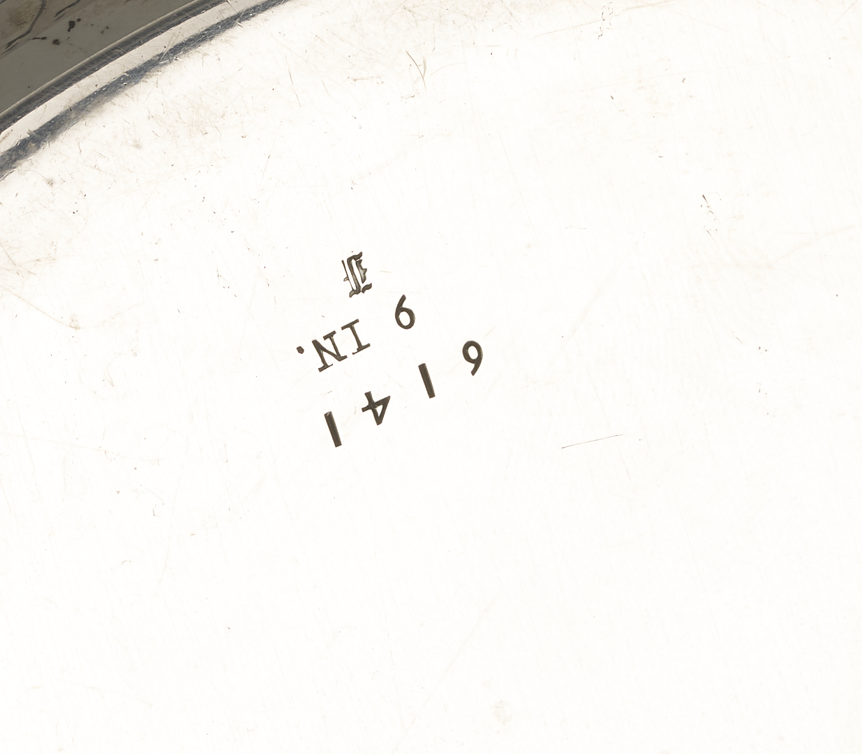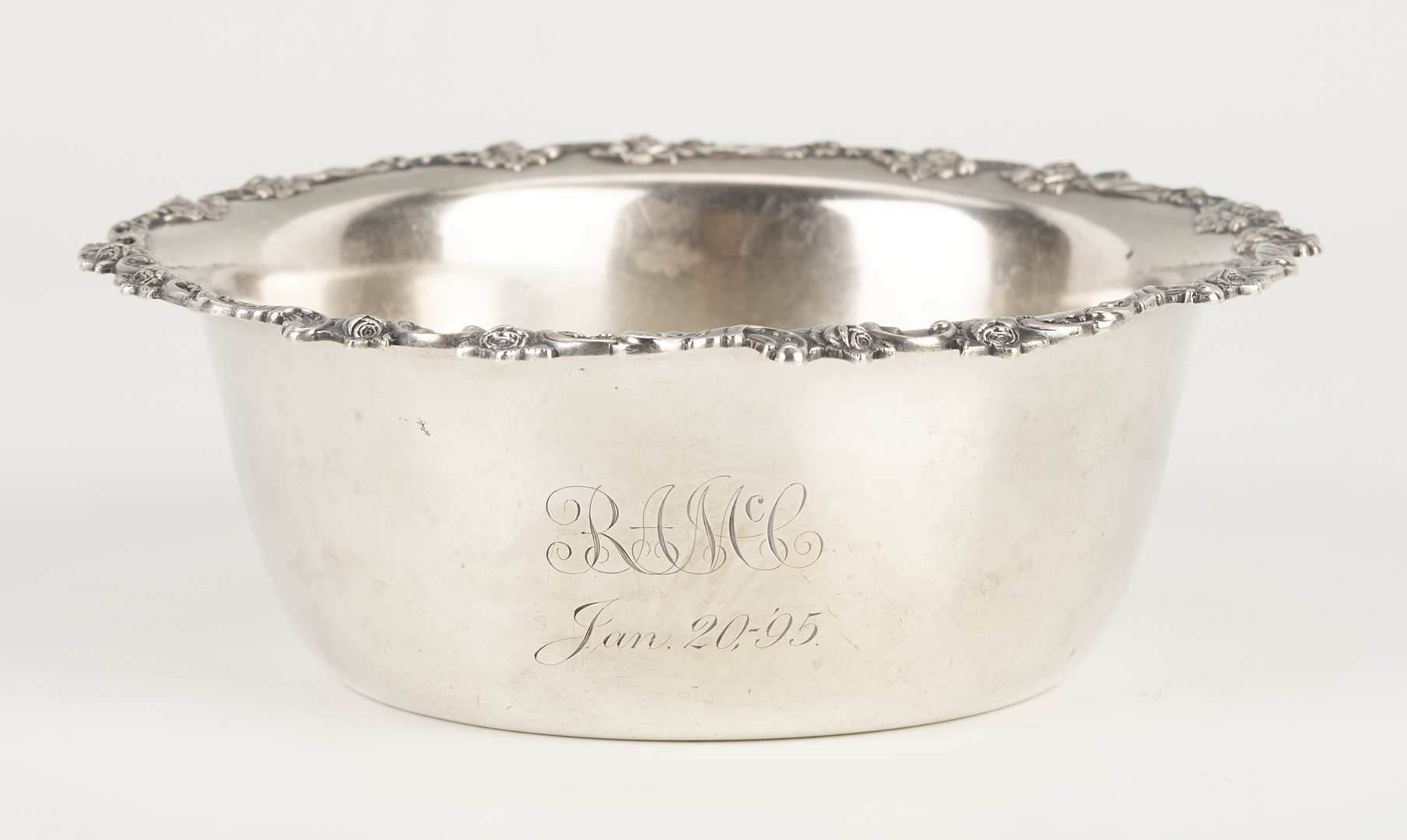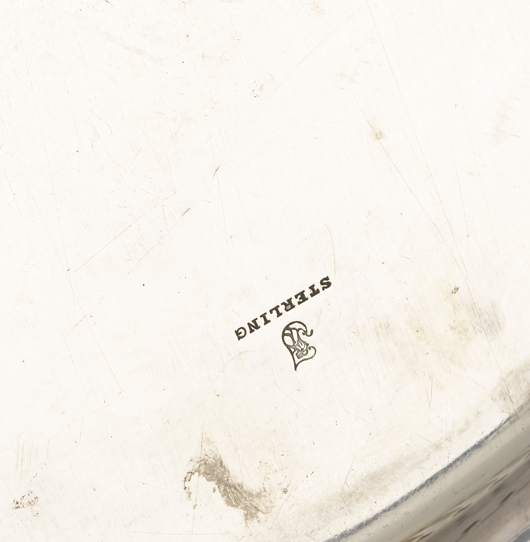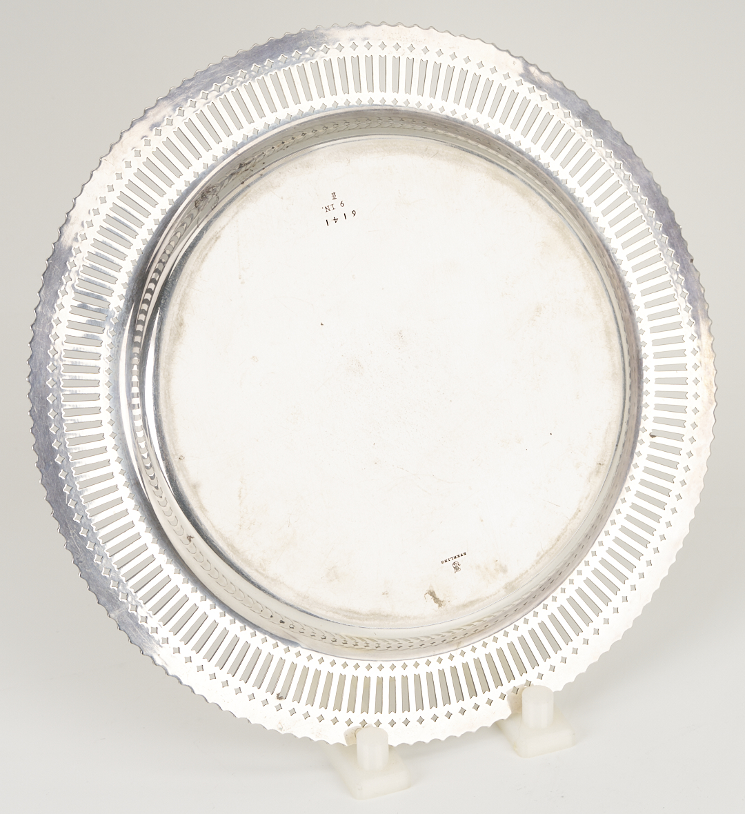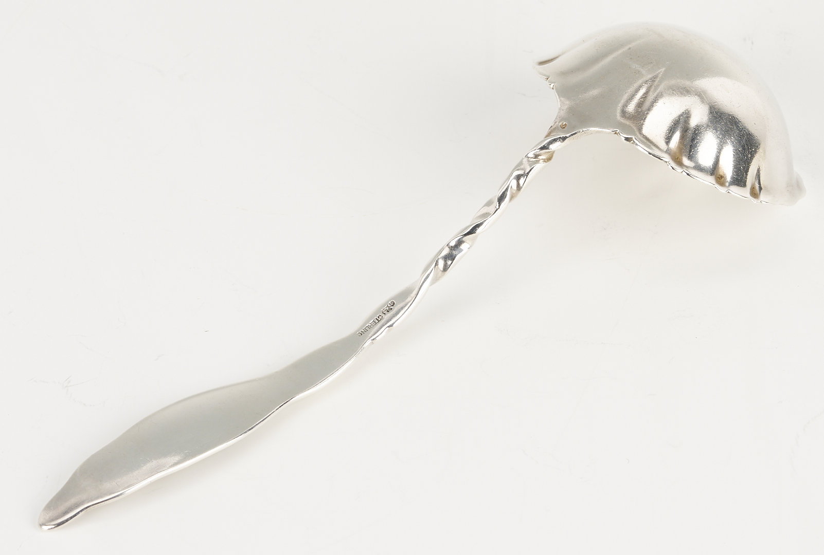 Four (4) sterling silver hollowware table items, including 1 Towle Sterling Silver round sauce serving dish with attached underplate; 1 associated Whiting Lily of the Valley pattern gravy ladle; 1 small deep bowl marked “sterling” with floral scroll rim (5 1/2 in. diameter); and 1 Towle sterling plate with reticulated rim, 9 in. diameter. Combined weight: 43.87 oz troy.
