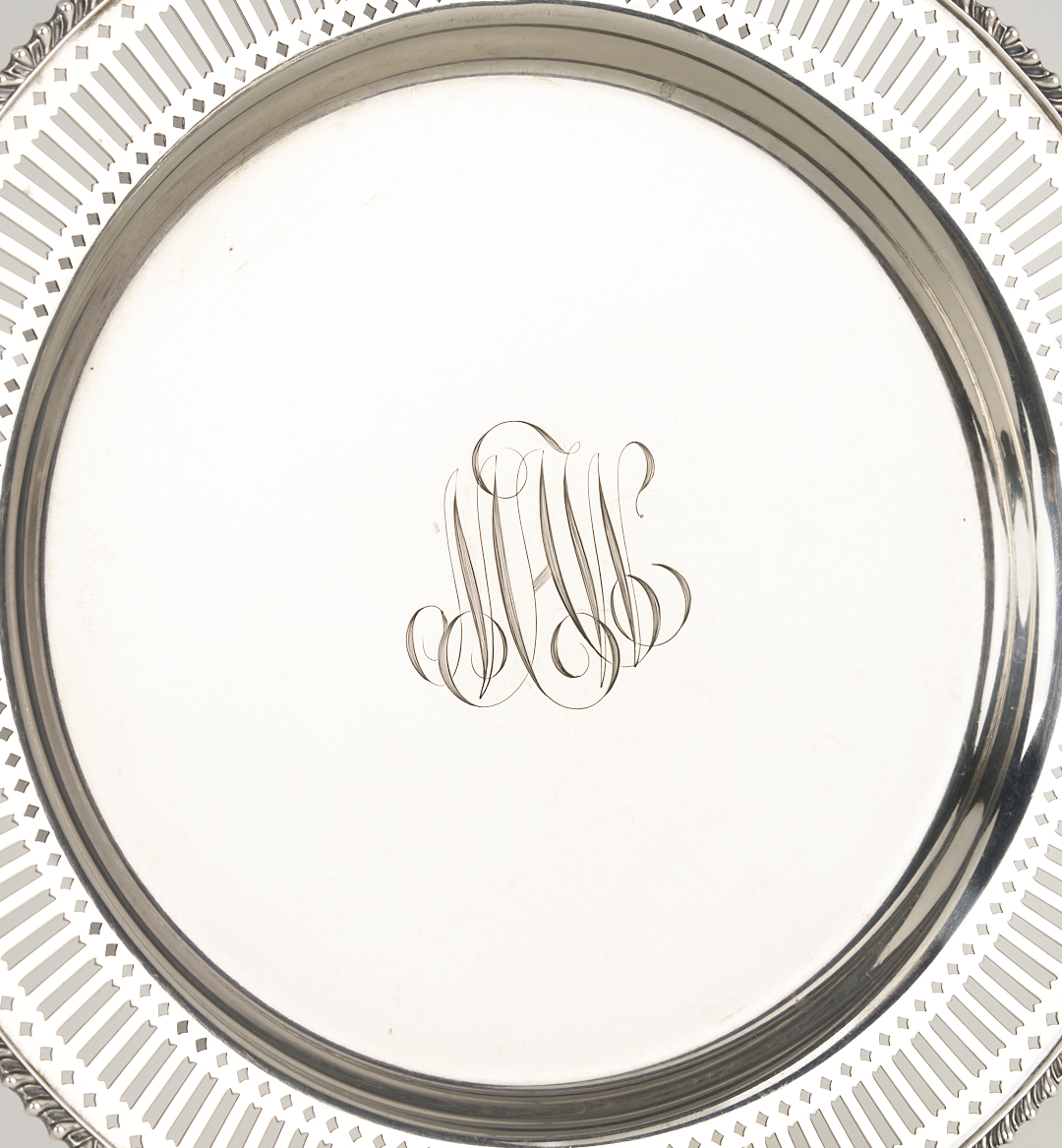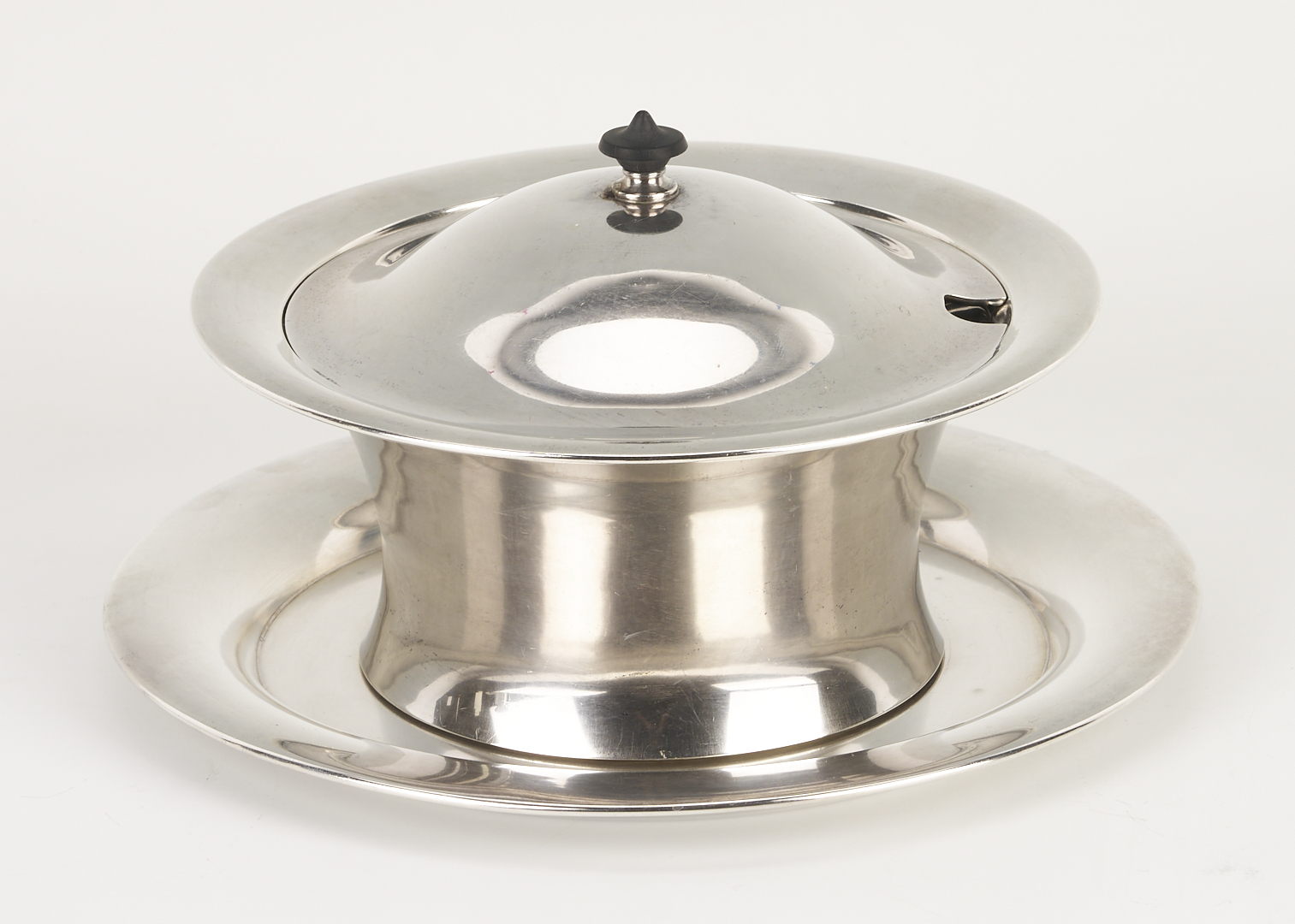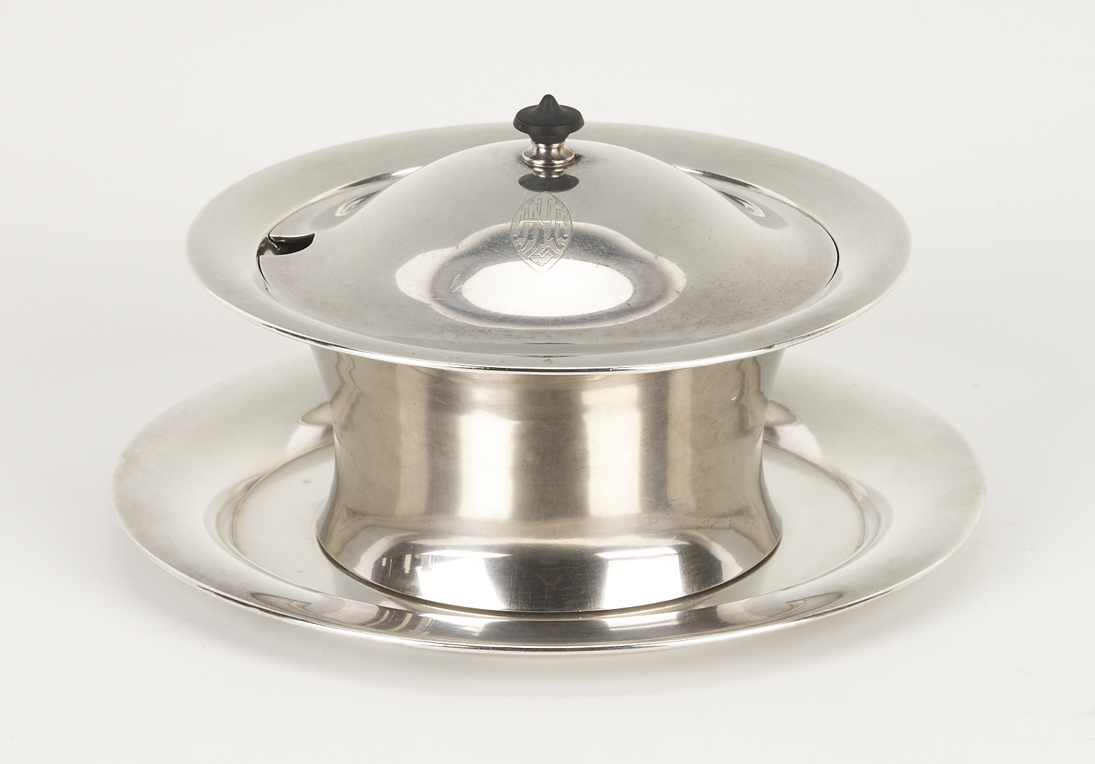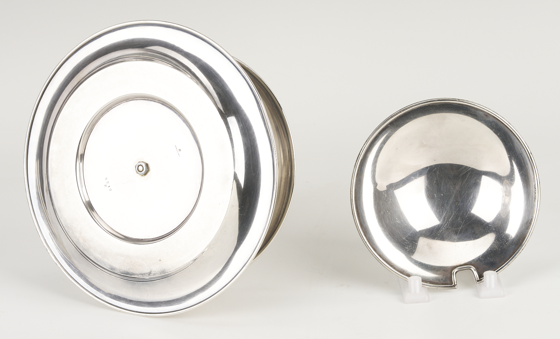 Four (4) sterling silver hollowware table items, including 1 Towle Sterling Silver round sauce serving dish with attached underplate; 1 associated Whiting Lily of the Valley pattern gravy ladle; 1 small deep bowl marked “sterling” with floral scroll rim (5 1/2 in. diameter); and 1 Towle sterling plate with reticulated rim, 9 in. diameter. Combined weight: 43.87 oz troy.