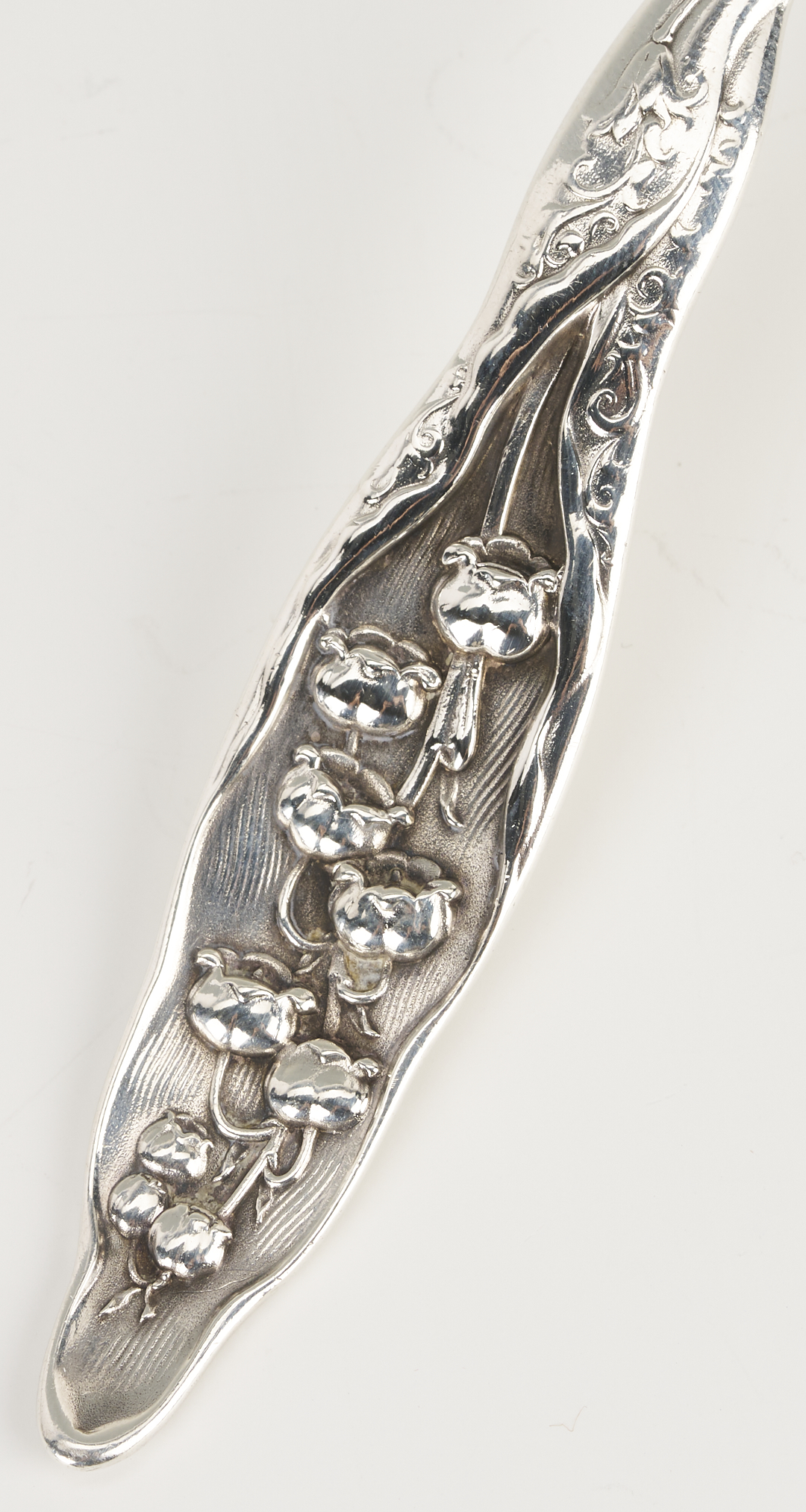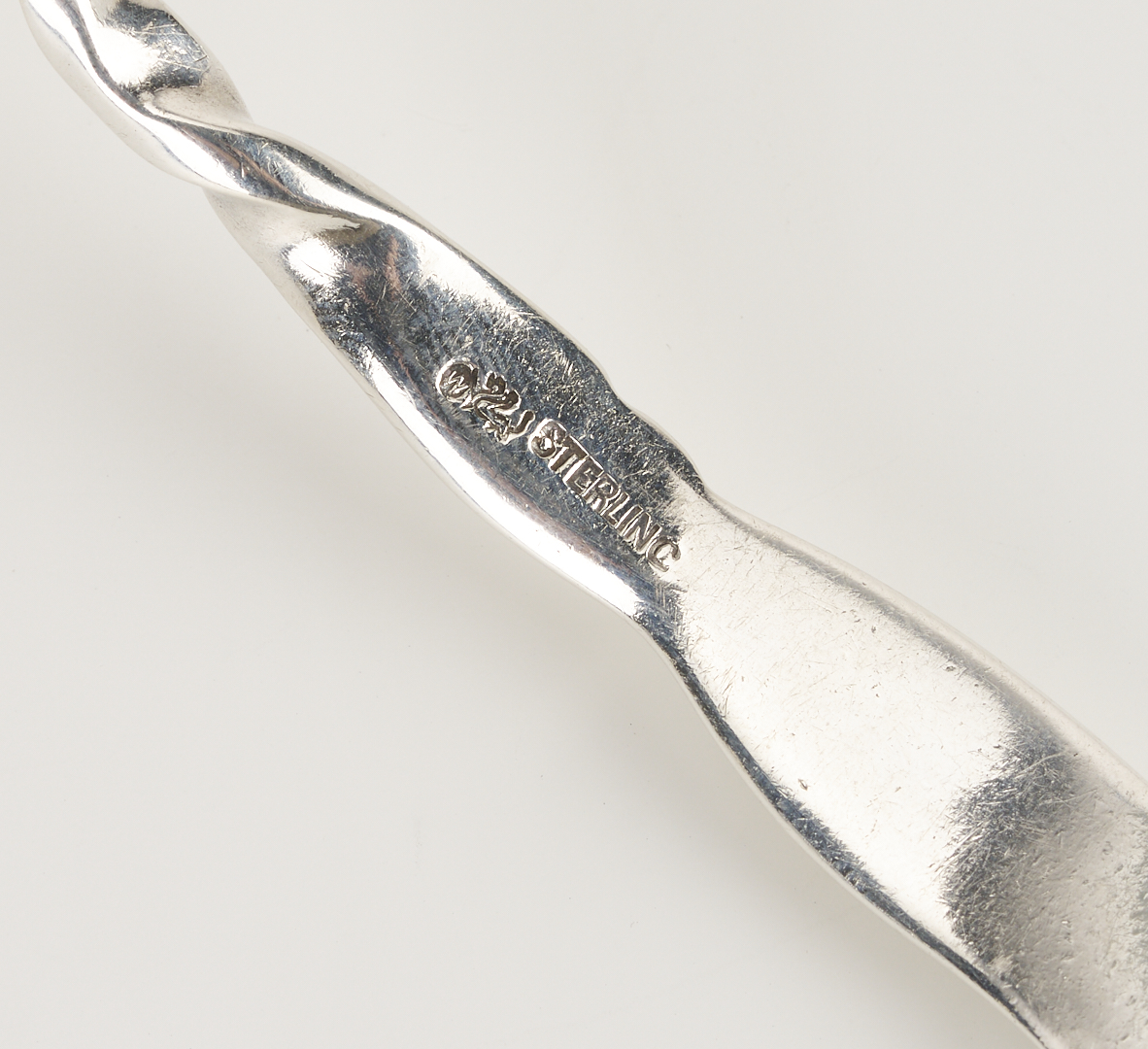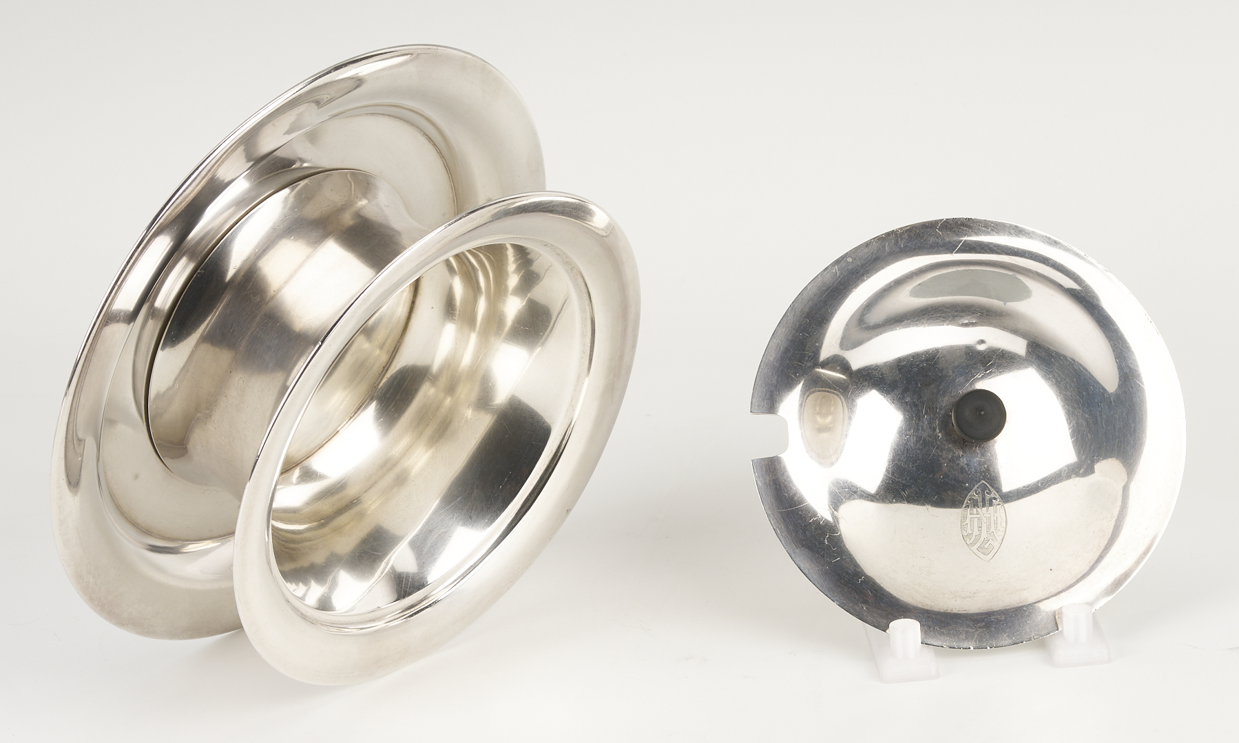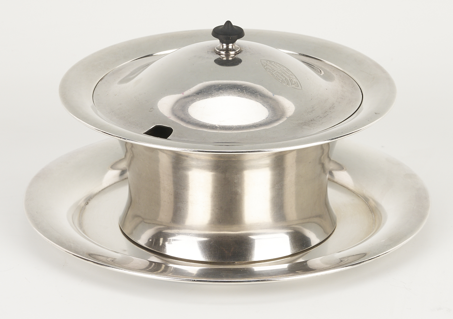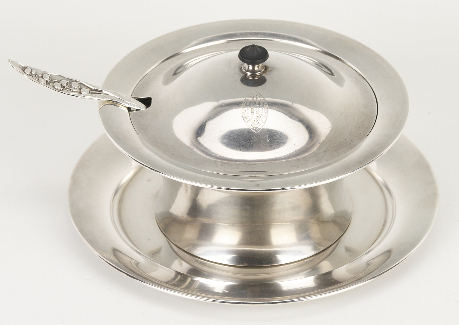 Four (4) sterling silver hollowware table items, including 1 Towle Sterling Silver round sauce serving dish with attached underplate; 1 associated Whiting Lily of the Valley pattern gravy ladle; 1 small deep bowl marked “sterling” with floral scroll rim (5 1/2 in. diameter); and 1 Towle sterling plate with reticulated rim, 9 in. diameter. Combined weight: 43.87 oz troy.
