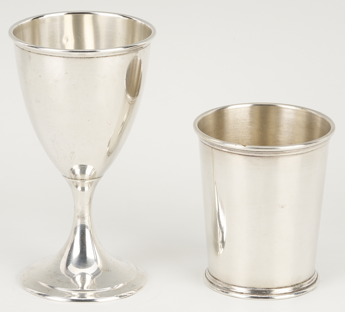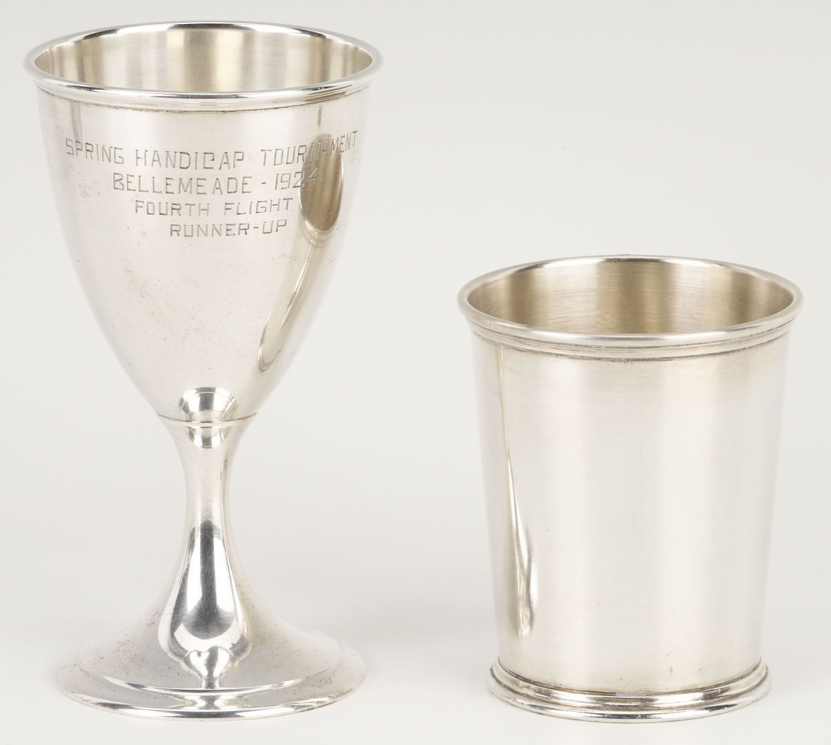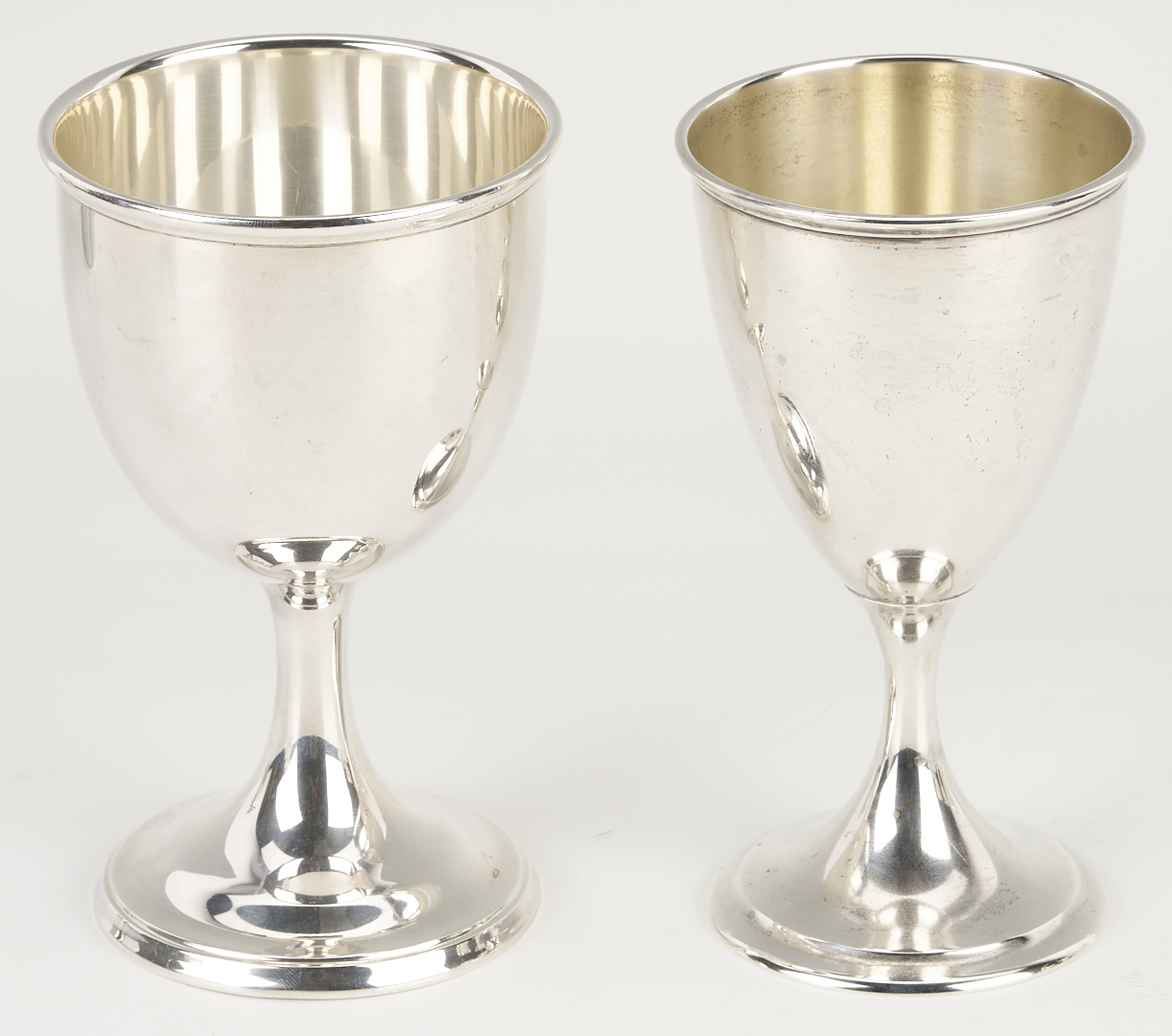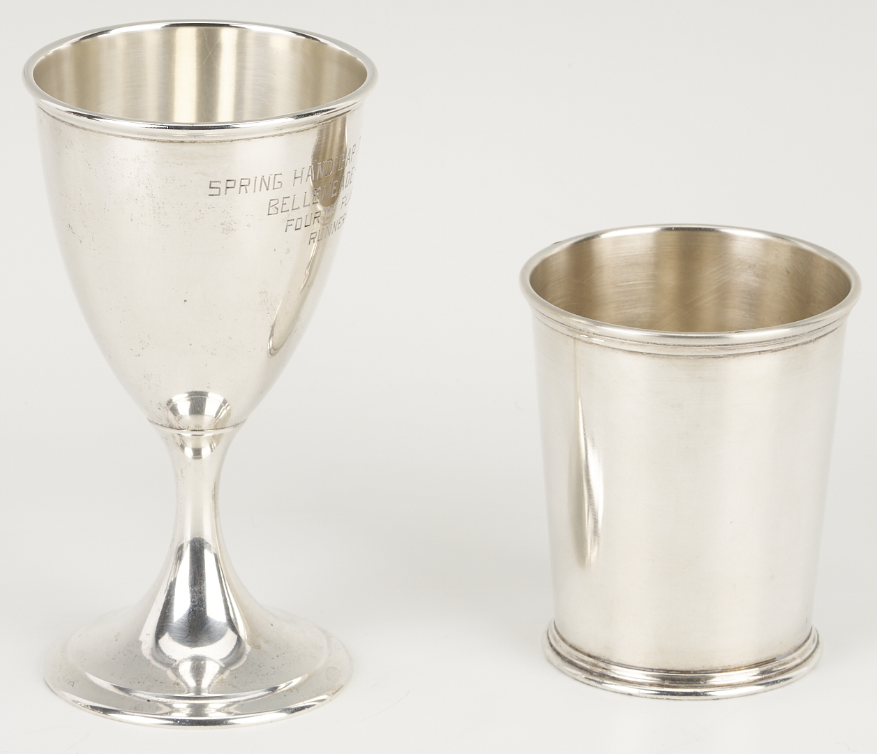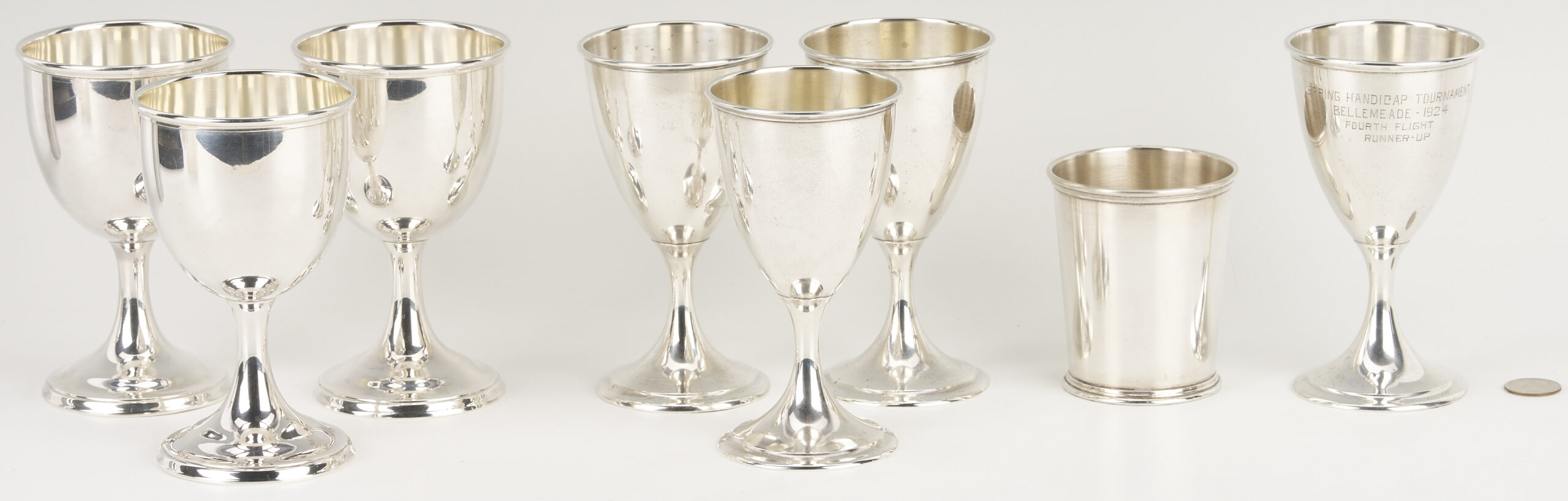 1 Kirk & Son Sterling Silver julep cup #277 plus an assembled group of 7 sterling silver goblets including 3 International sterling goblets #P708 and 4 Wallace sterling goblets #2403 (two have gilt interiors, the others do not). Note: 1 Wallace sterling goblets is engraved with a golfing trophy inscription, “Spring Handicap Tournament Bellemeade 1924 Fourth Flight Runner Up.” Julep cup 3 3/4 in. H, goblets all approx. 6 in. H. Combined weight: 37.13 oz troy.