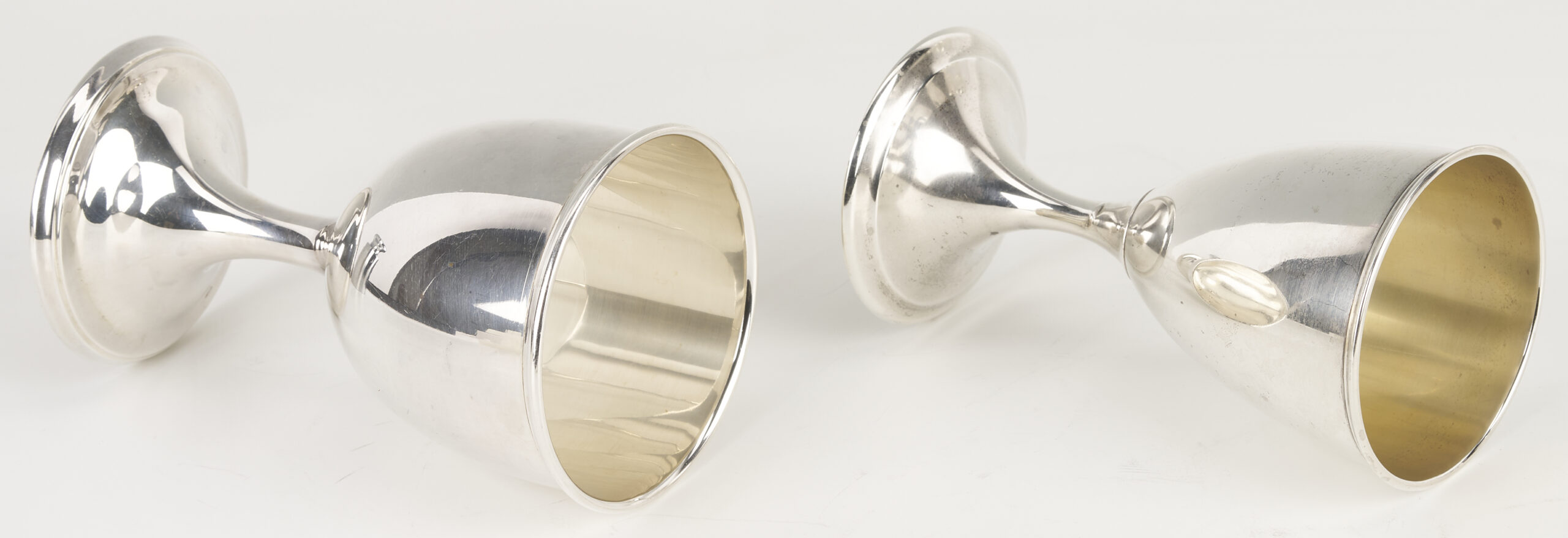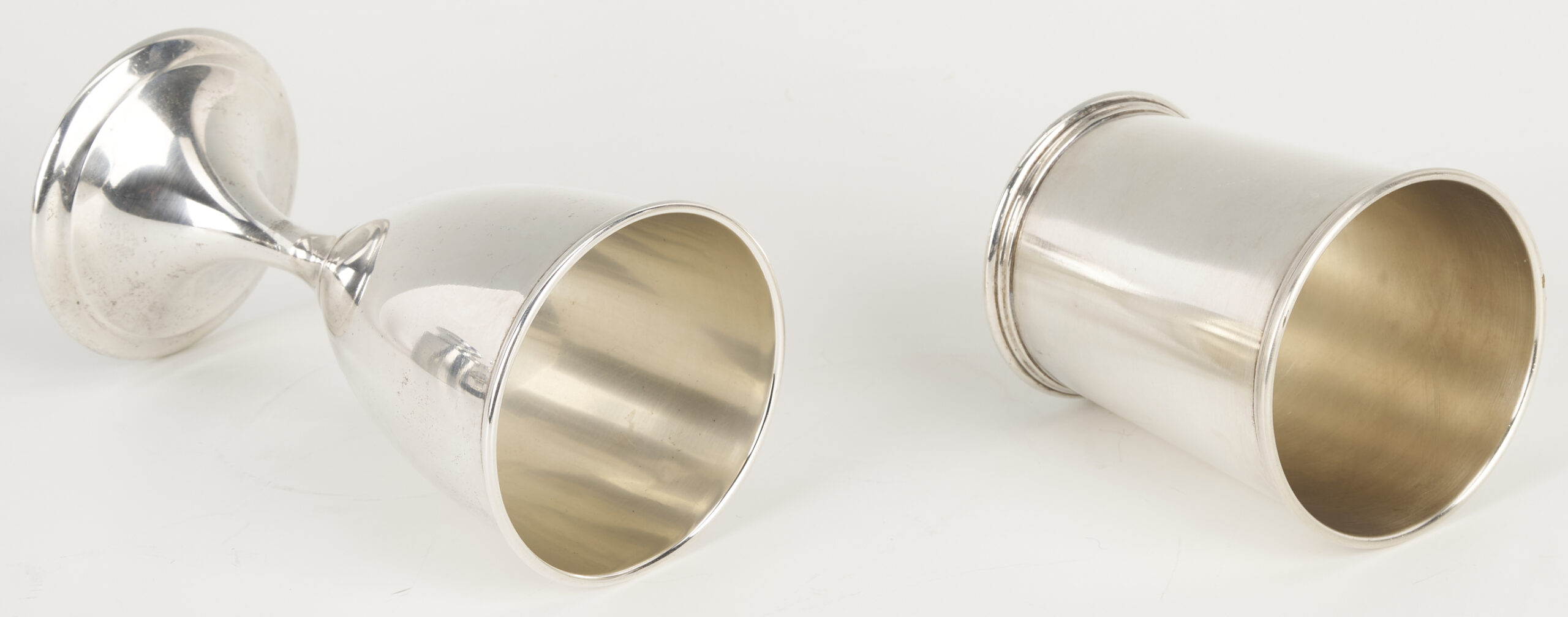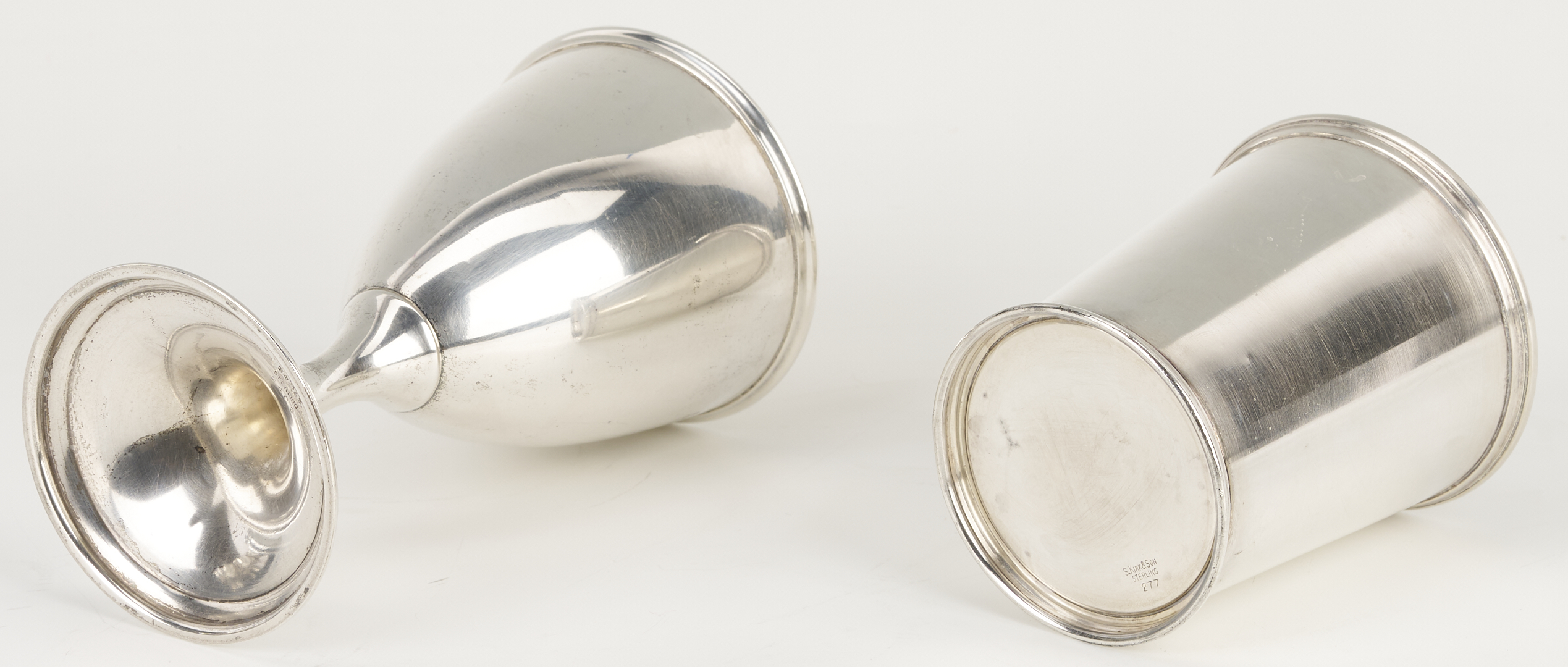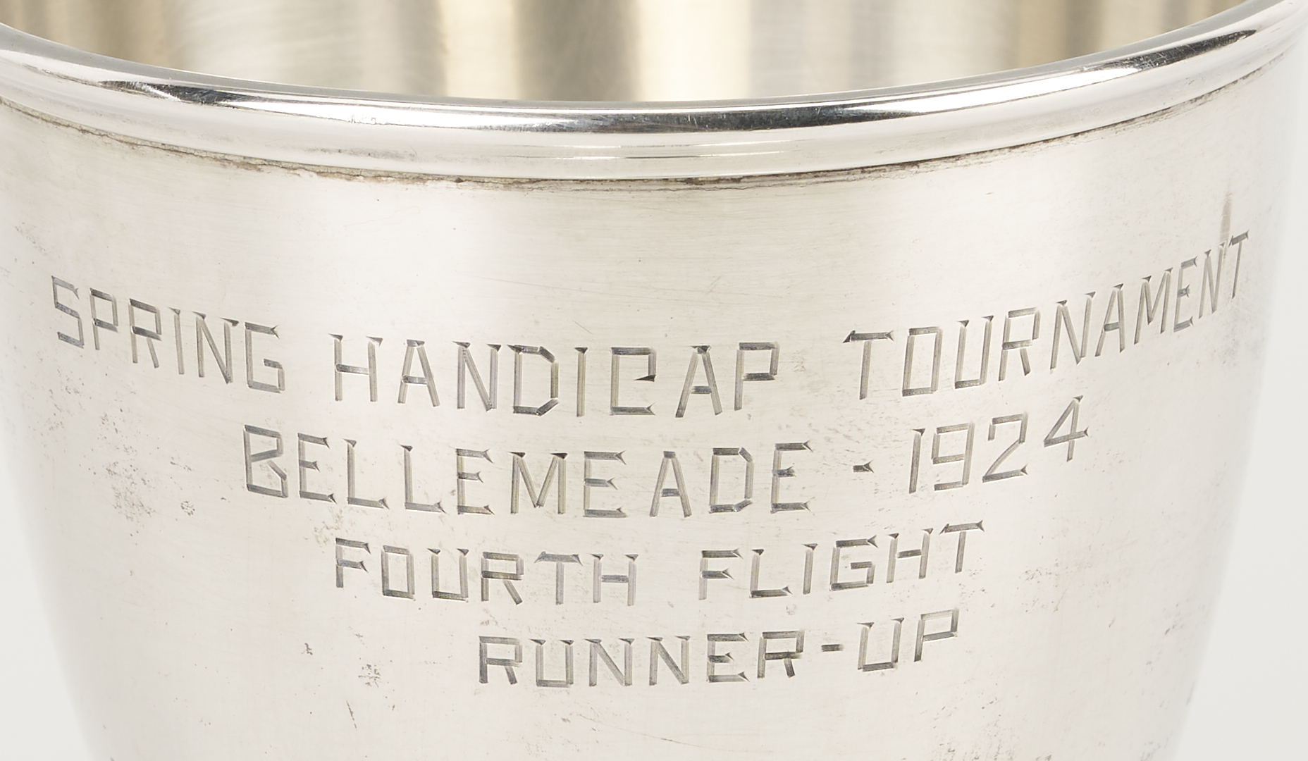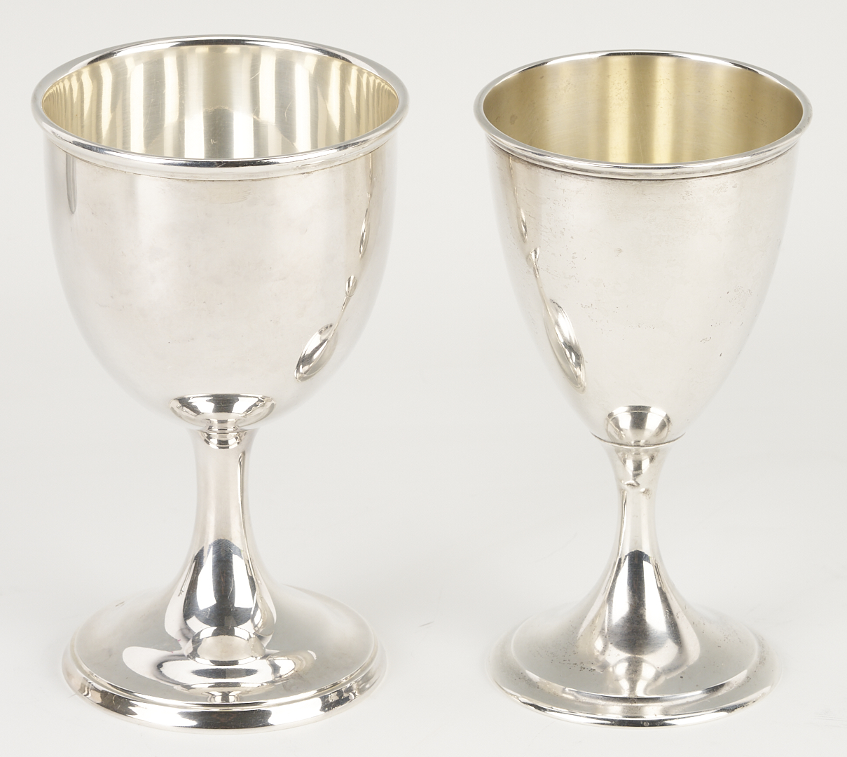 1 Kirk & Son Sterling Silver julep cup #277 plus an assembled group of 7 sterling silver goblets including 3 International sterling goblets #P708 and 4 Wallace sterling goblets #2403 (two have gilt interiors, the others do not). Note: 1 Wallace sterling goblets is engraved with a golfing trophy inscription, “Spring Handicap Tournament Bellemeade 1924 Fourth Flight Runner Up.” Julep cup 3 3/4 in. H, goblets all approx. 6 in. H. Combined weight: 37.13 oz troy.