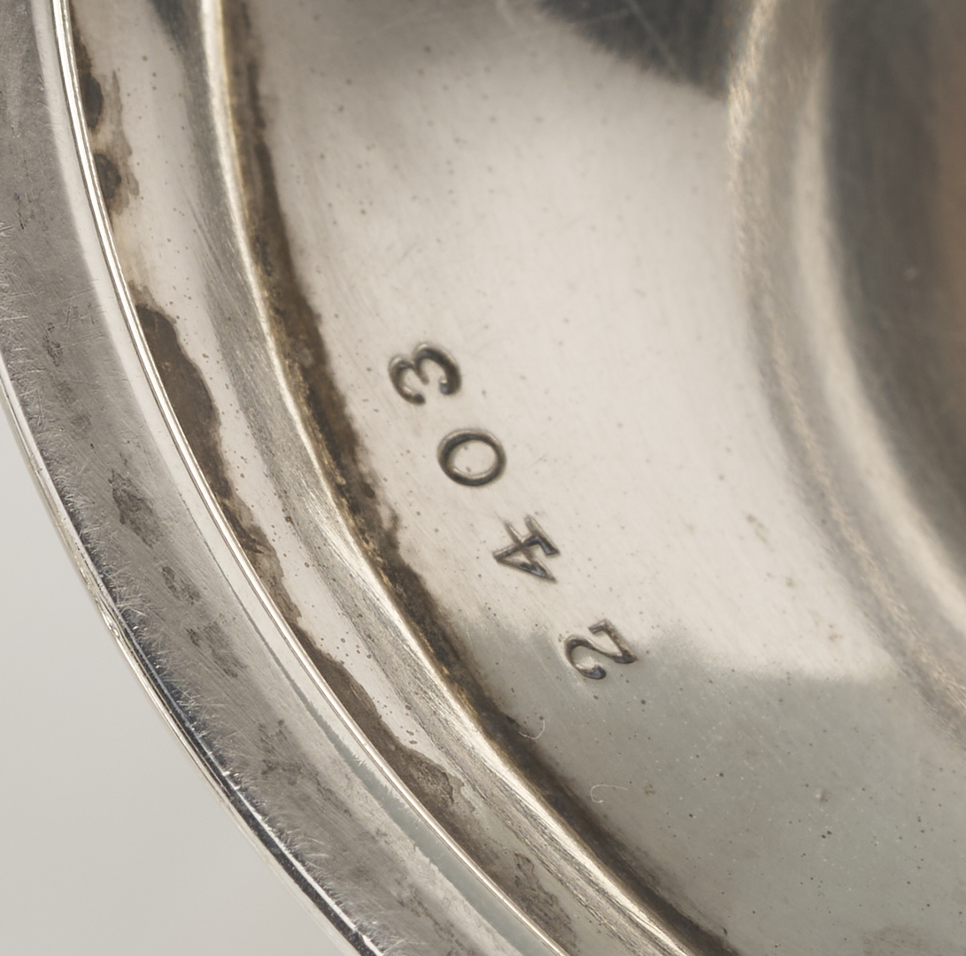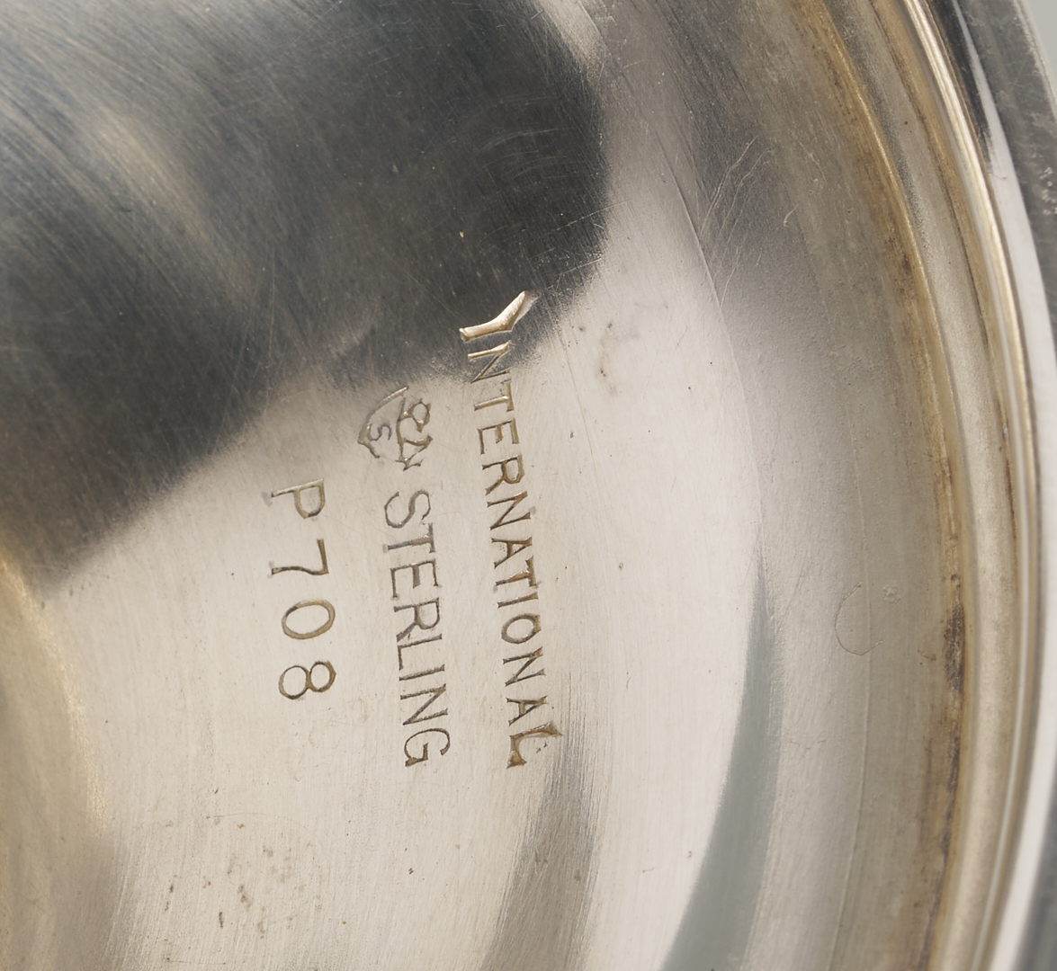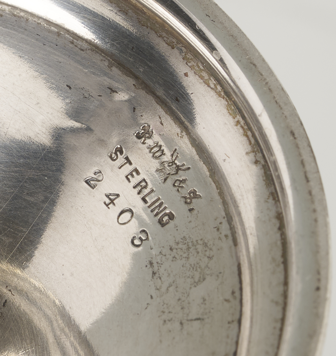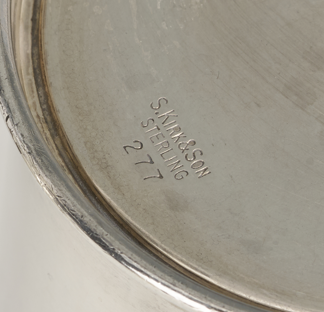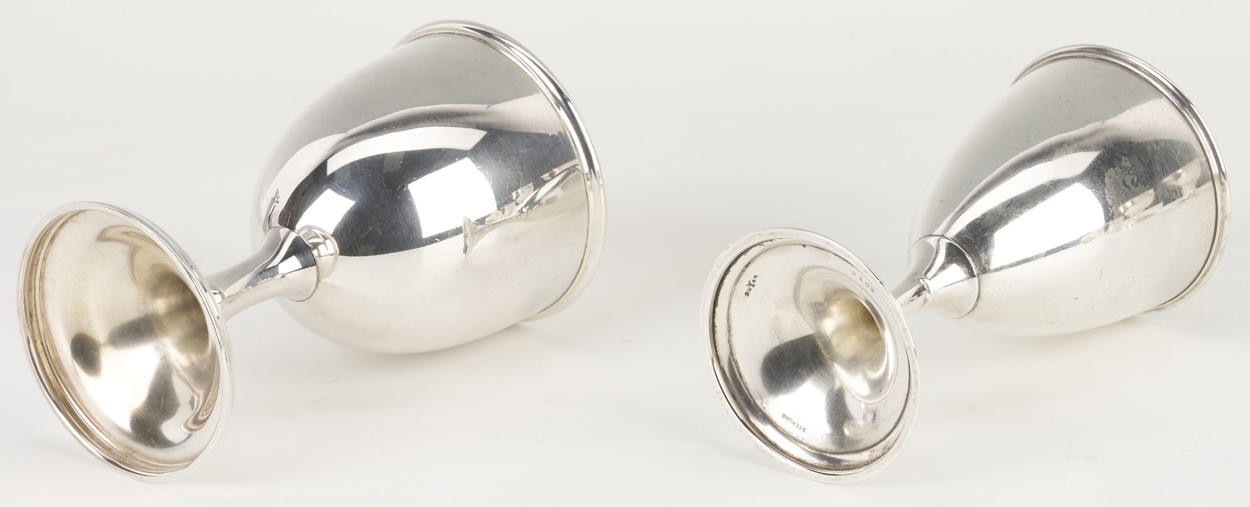 1 Kirk & Son Sterling Silver julep cup #277 plus an assembled group of 7 sterling silver goblets including 3 International sterling goblets #P708 and 4 Wallace sterling goblets #2403 (two have gilt interiors, the others do not). Note: 1 Wallace sterling goblets is engraved with a golfing trophy inscription, “Spring Handicap Tournament Bellemeade 1924 Fourth Flight Runner Up.” Julep cup 3 3/4 in. H, goblets all approx. 6 in. H. Combined weight: 37.13 oz troy.