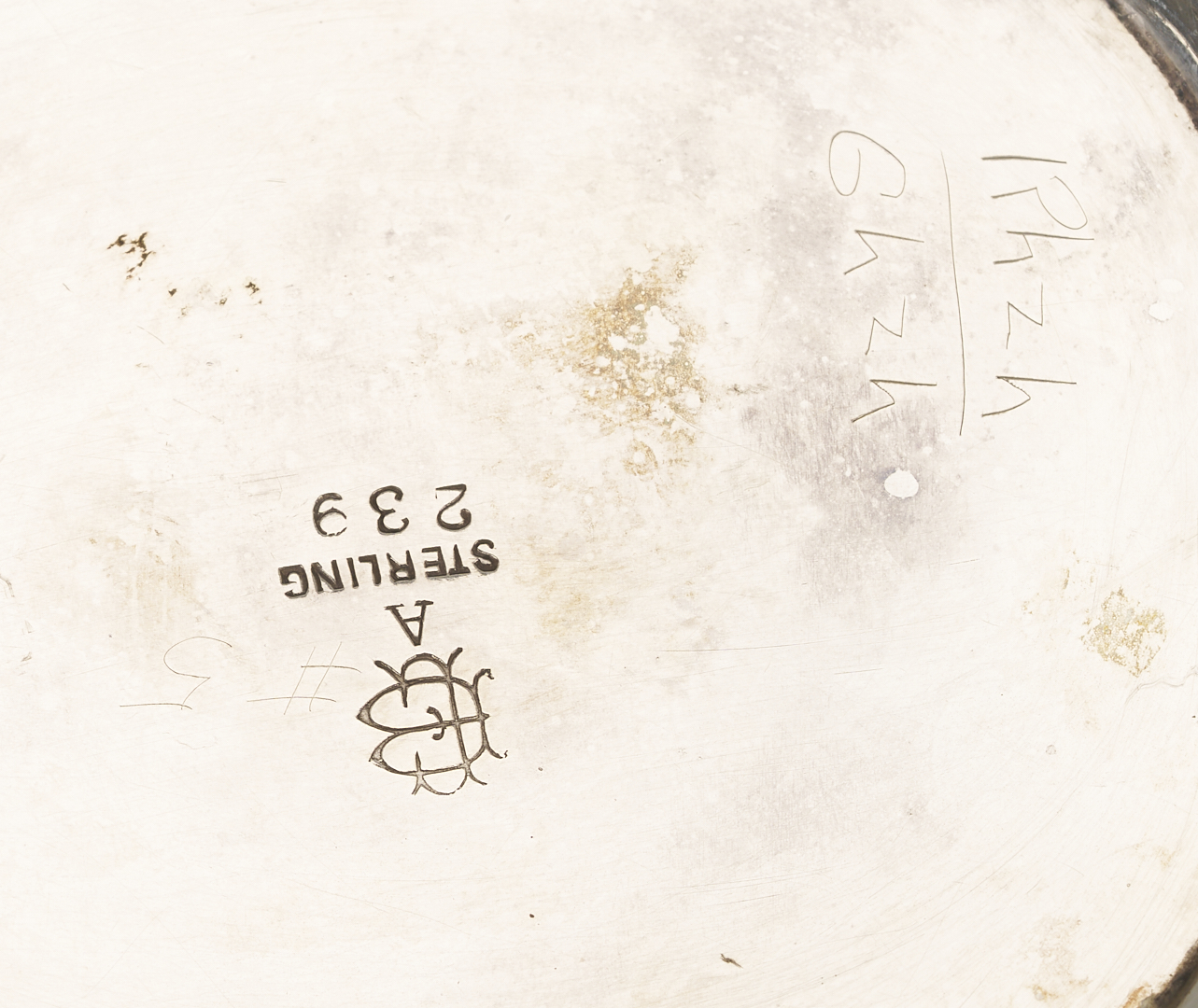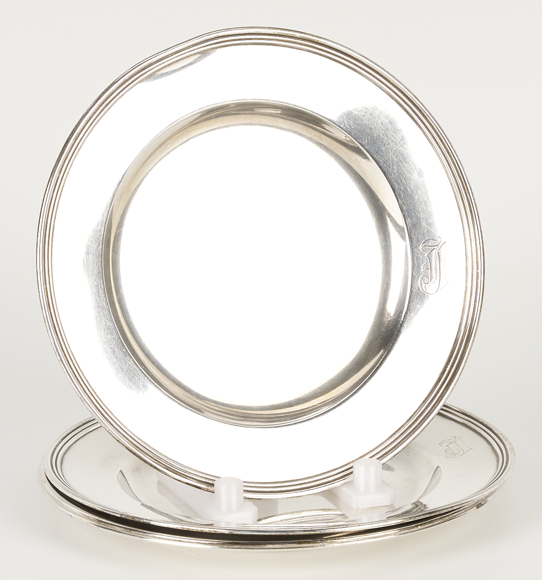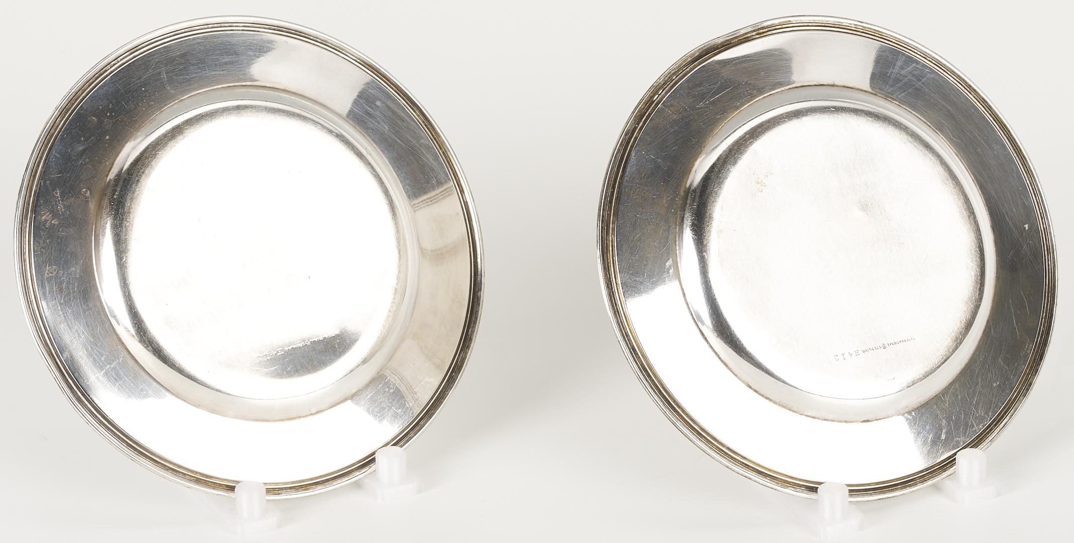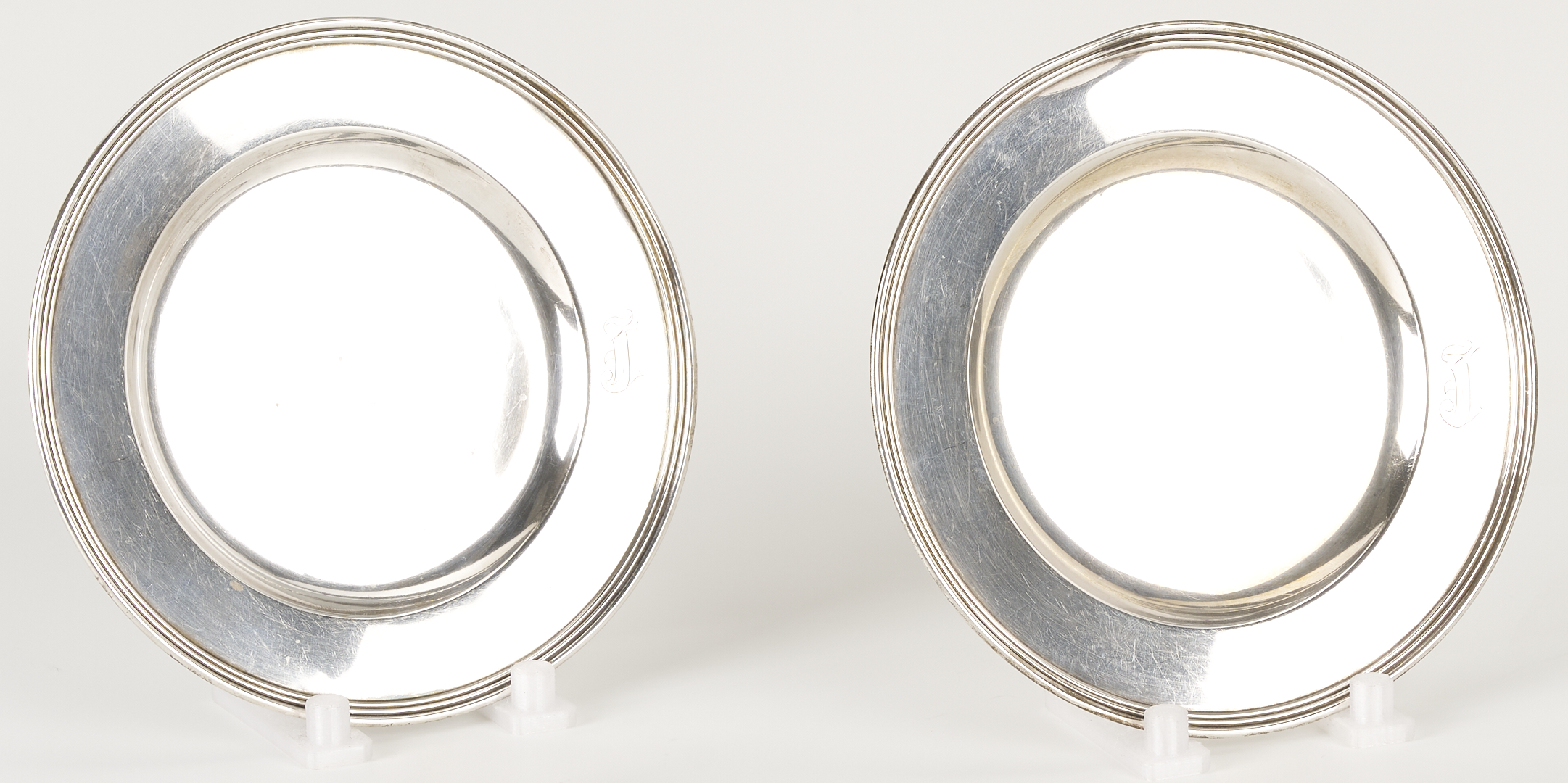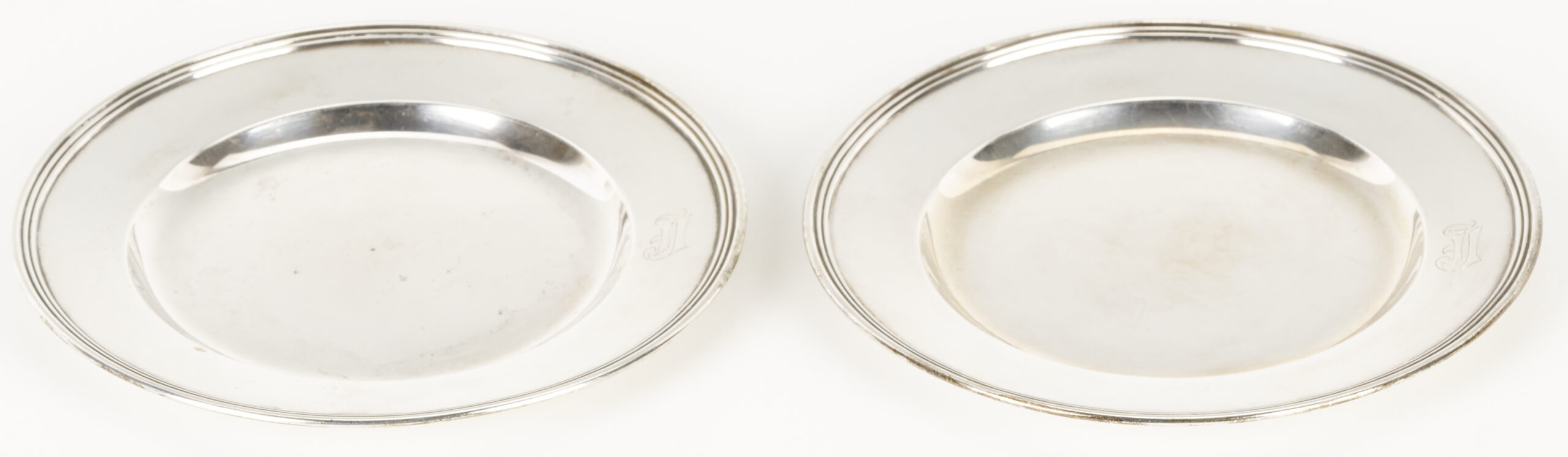 Pitcher and bud vase are in overall good condition. Bread plates with surface scratching and monograms, a couple with minor pitting,