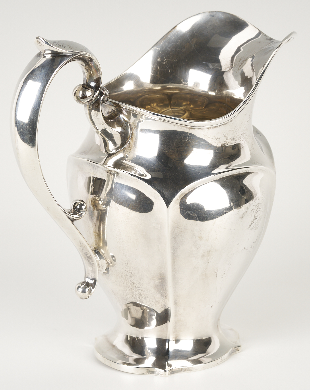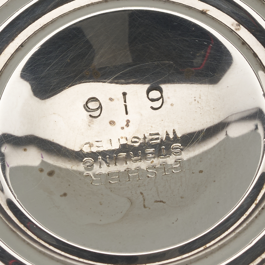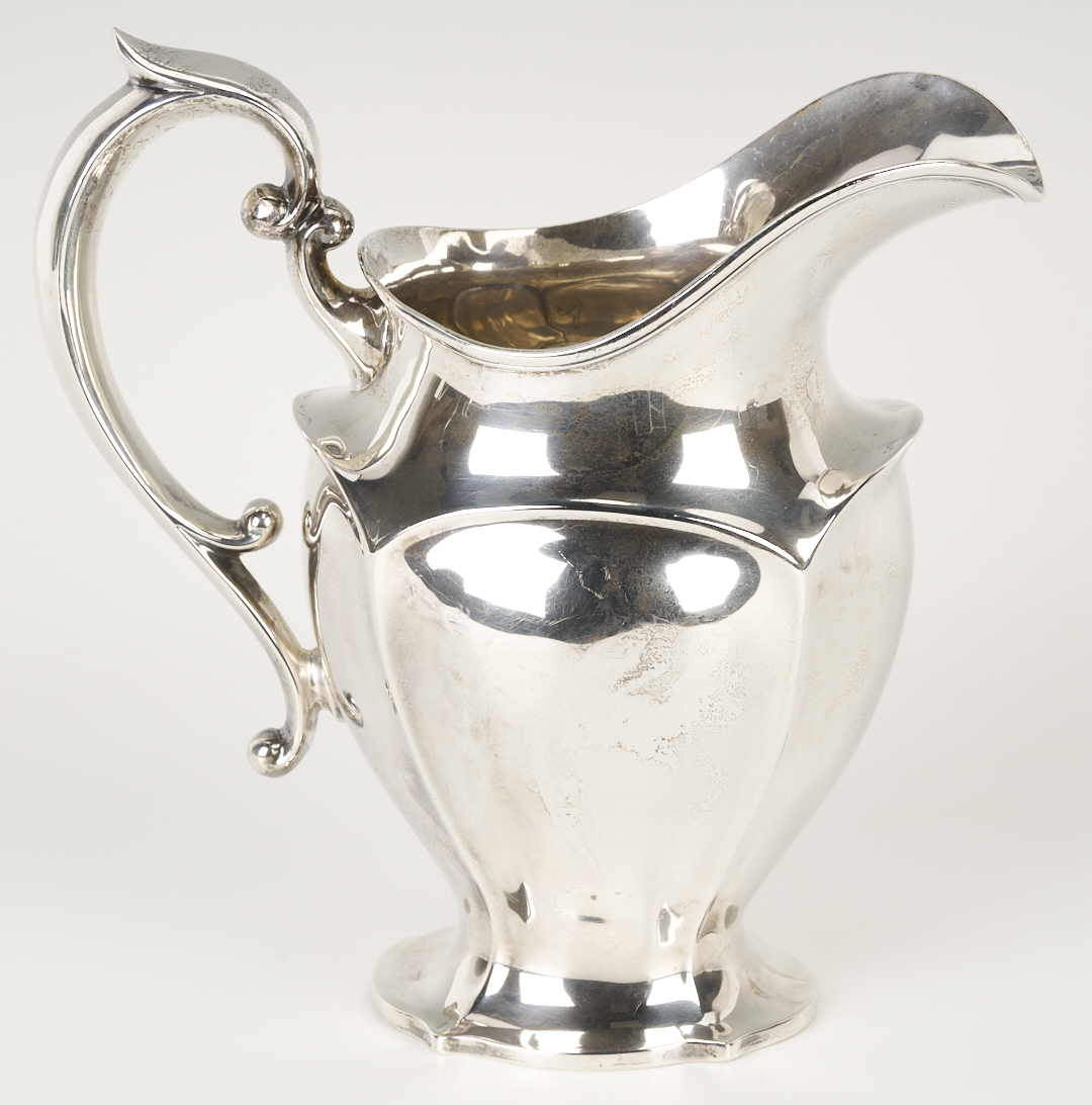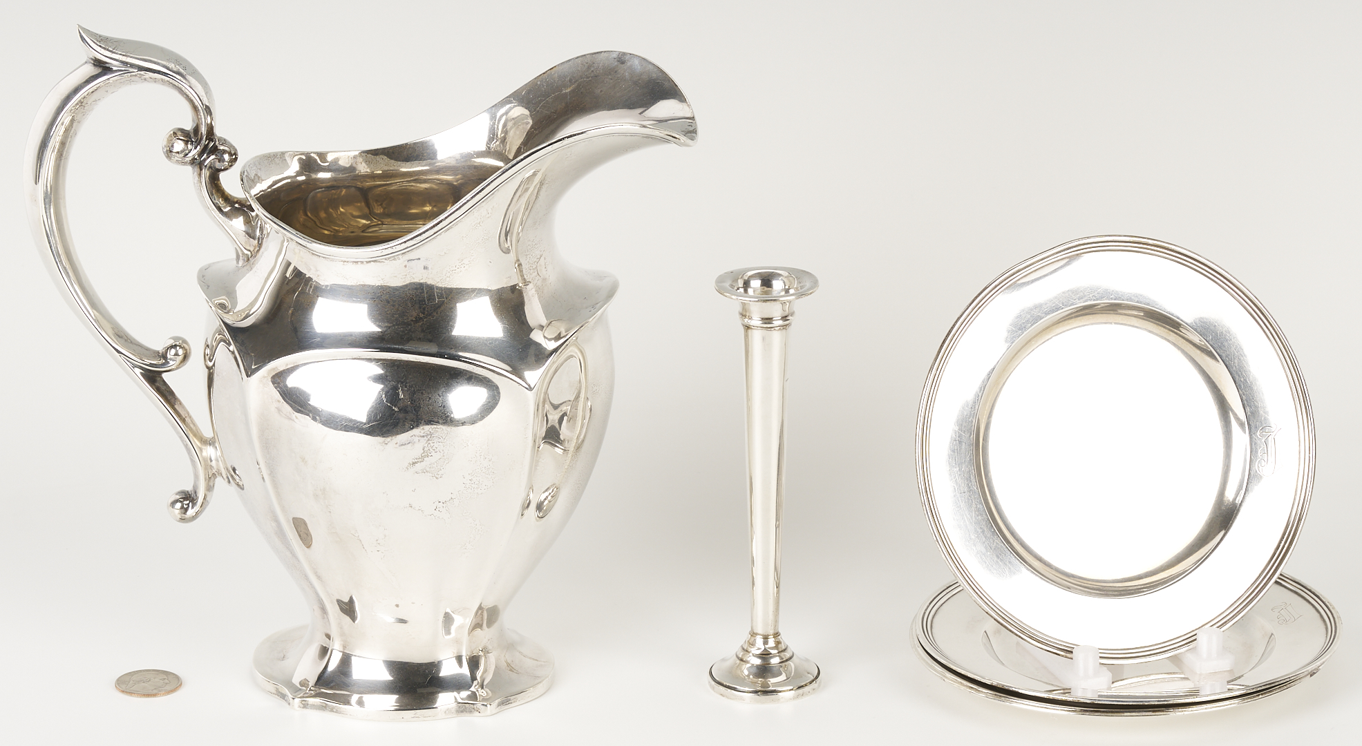 Grouping of six (6) sterling silver table items, including an American helmet form water pitcher with shaped sides and c scroll handles, four (4) International #H413 bread plates, and one (1) Fisher Silver Co. weighted bud vase. All pieces with maker’s marks and sterling marks on the base. Ranging in size from 6 in. dia. to 8 3/4 in. H x 9 1/2 in. W. 32.11 total weighable troy ounces.