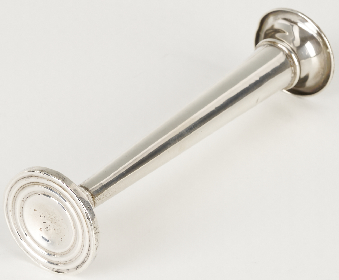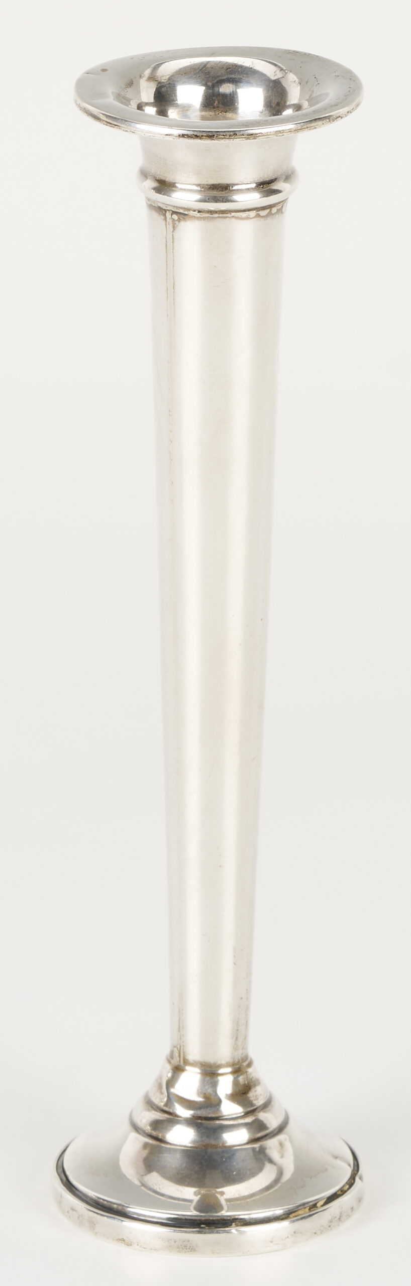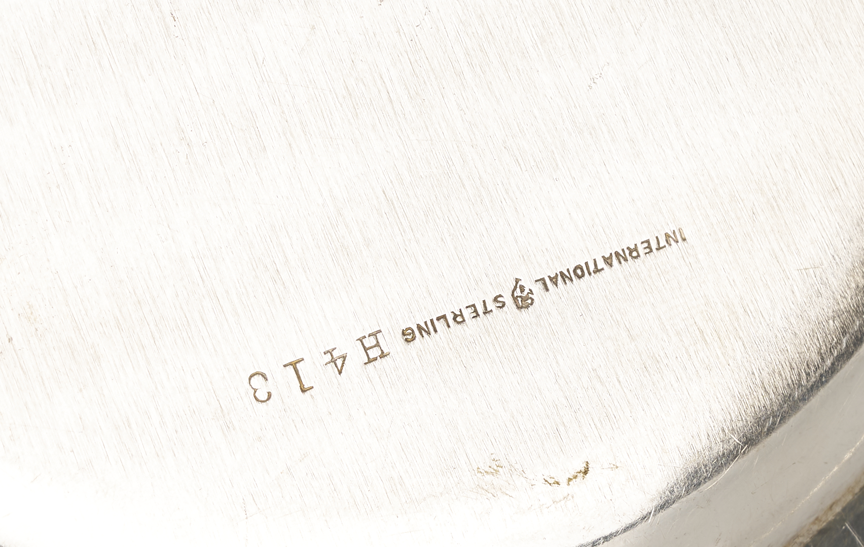 Grouping of six (6) sterling silver table items, including an American helmet form water pitcher with shaped sides and c scroll handles, four (4) International #H413 bread plates, and one (1) Fisher Silver Co. weighted bud vase. All pieces with maker’s marks and sterling marks on the base. Ranging in size from 6 in. dia. to 8 3/4 in. H x 9 1/2 in. W. 32.11 total weighable troy ounces.