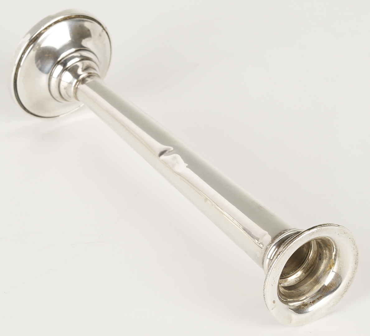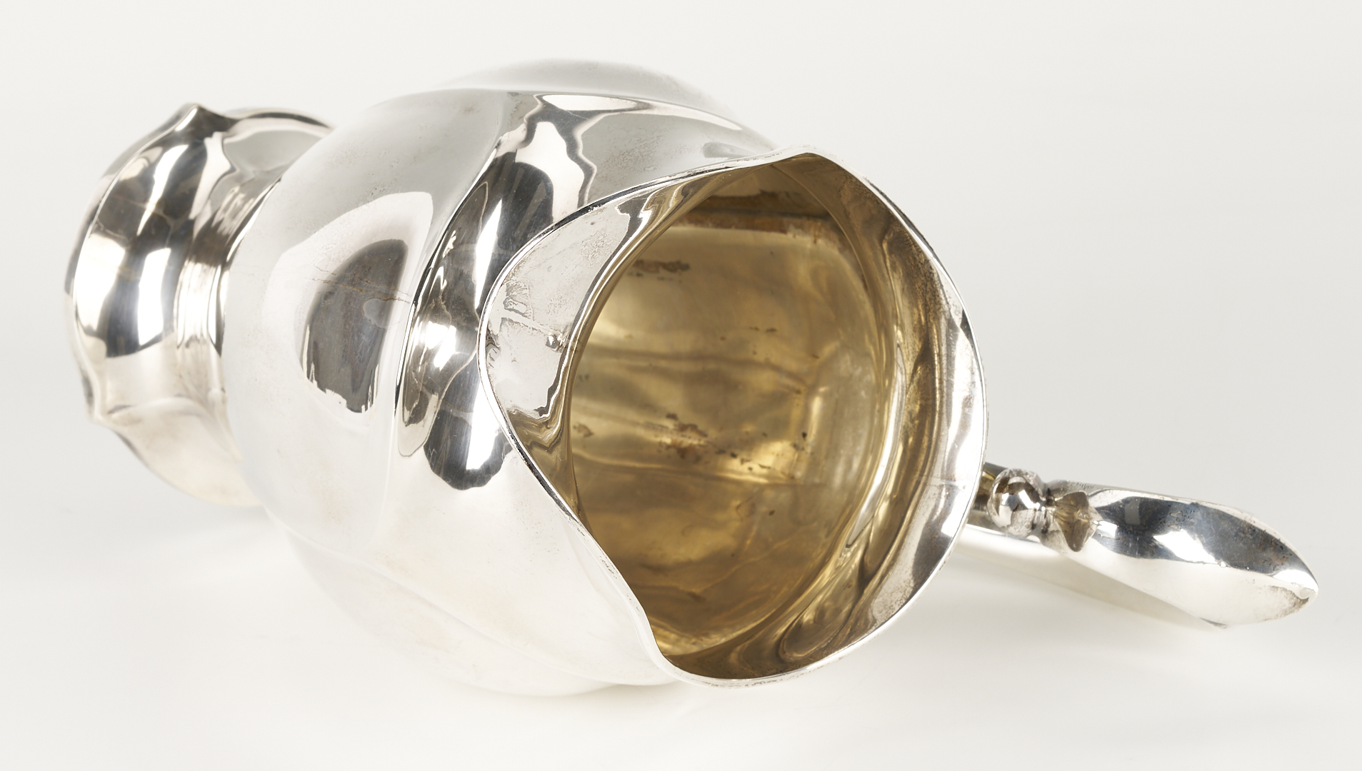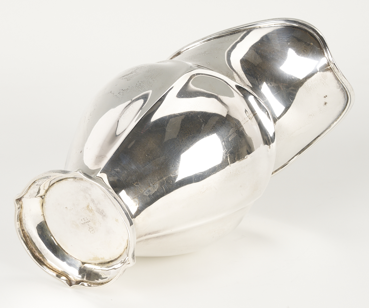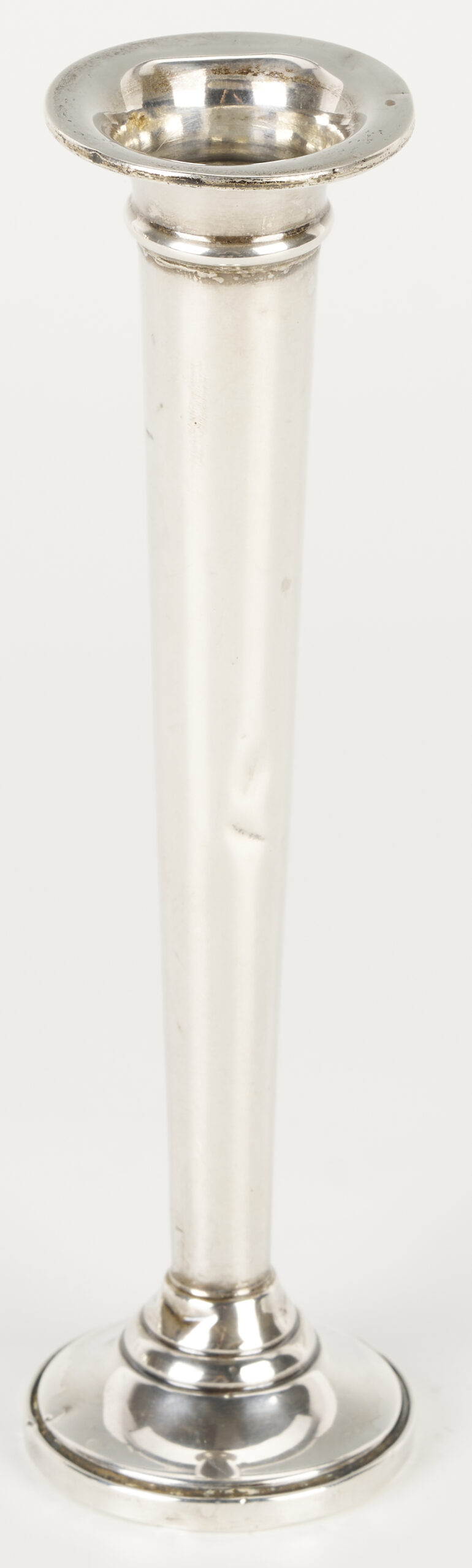 Grouping of six (6) sterling silver table items, including an American helmet form water pitcher with shaped sides and c scroll handles, four (4) International #H413 bread plates, and one (1) Fisher Silver Co. weighted bud vase. All pieces with maker’s marks and sterling marks on the base. Ranging in size from 6 in. dia. to 8 3/4 in. H x 9 1/2 in. W. 32.11 total weighable troy ounces.