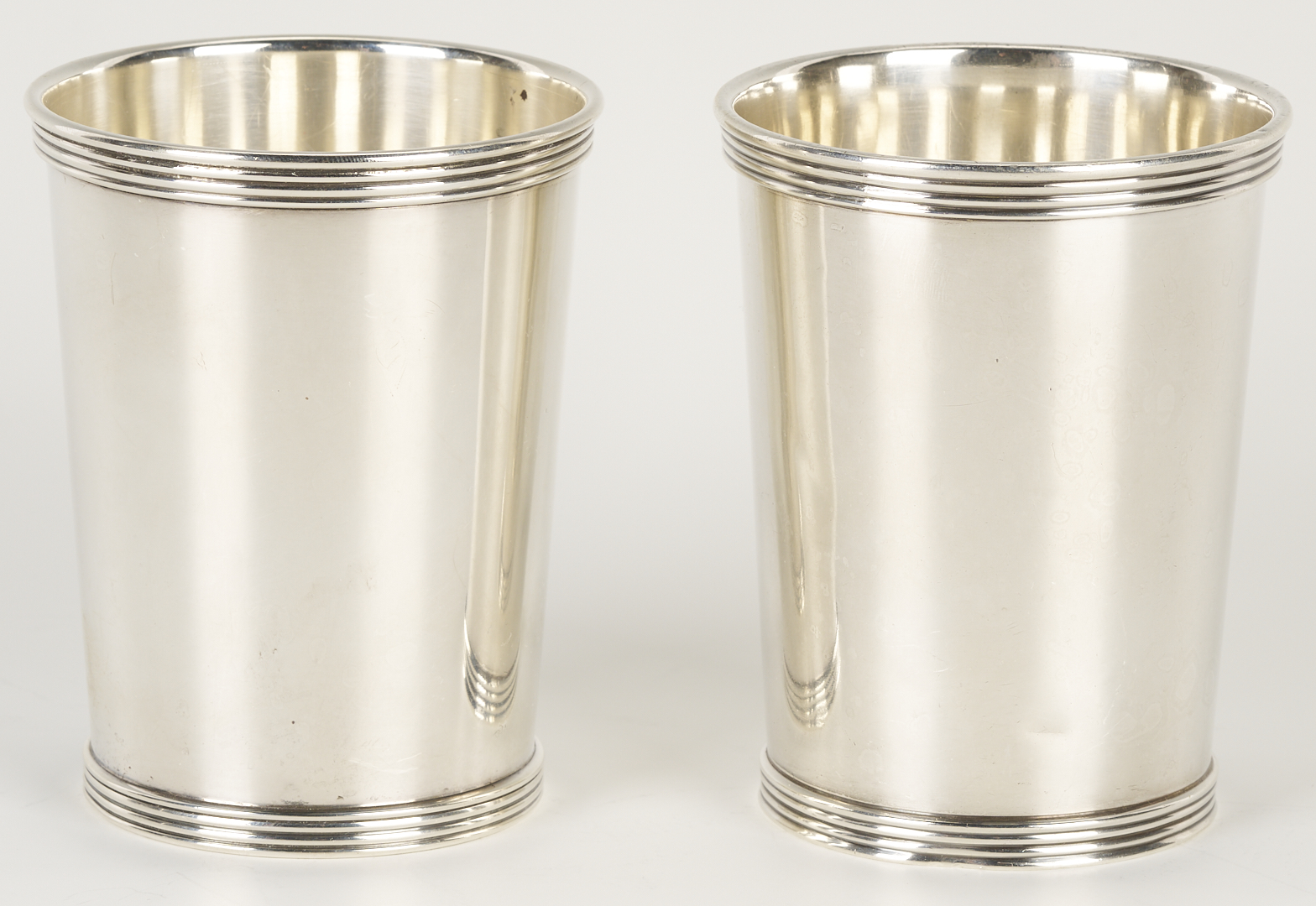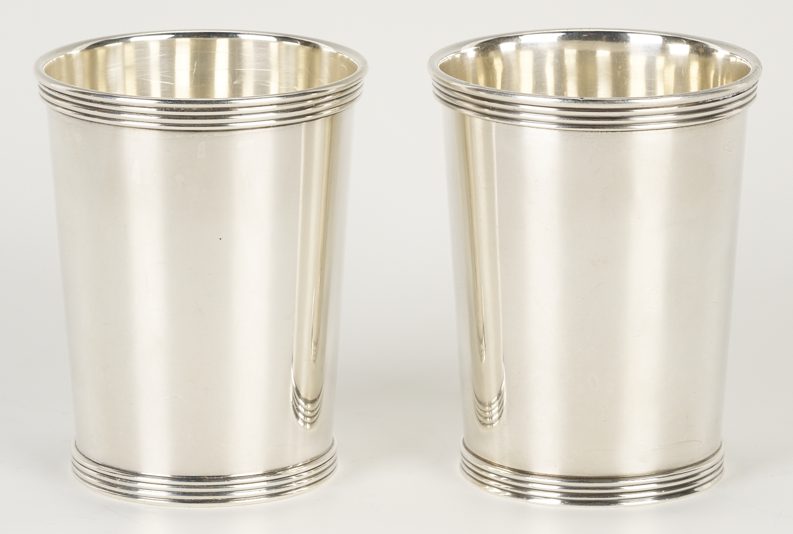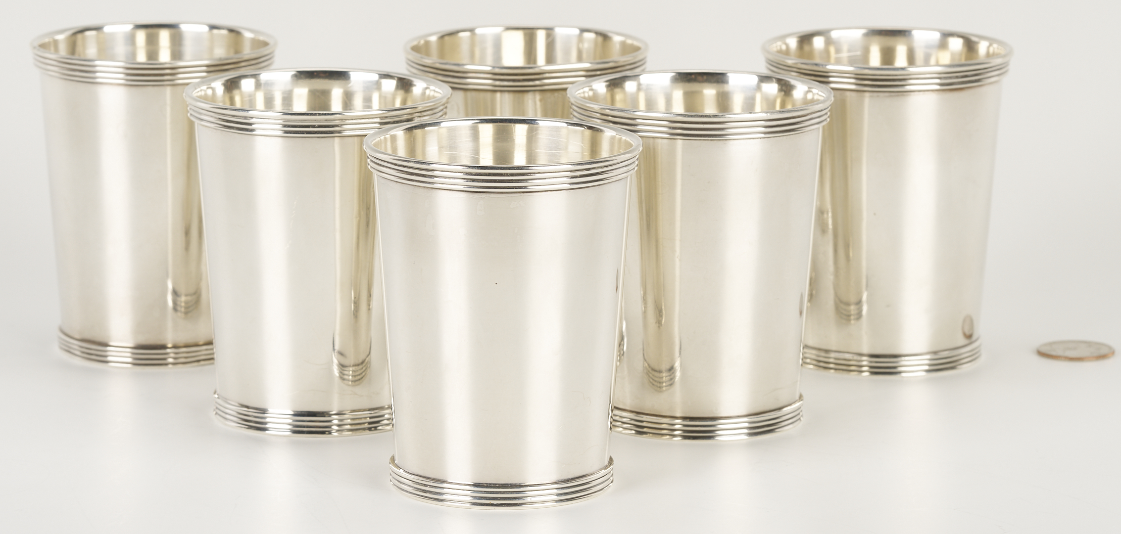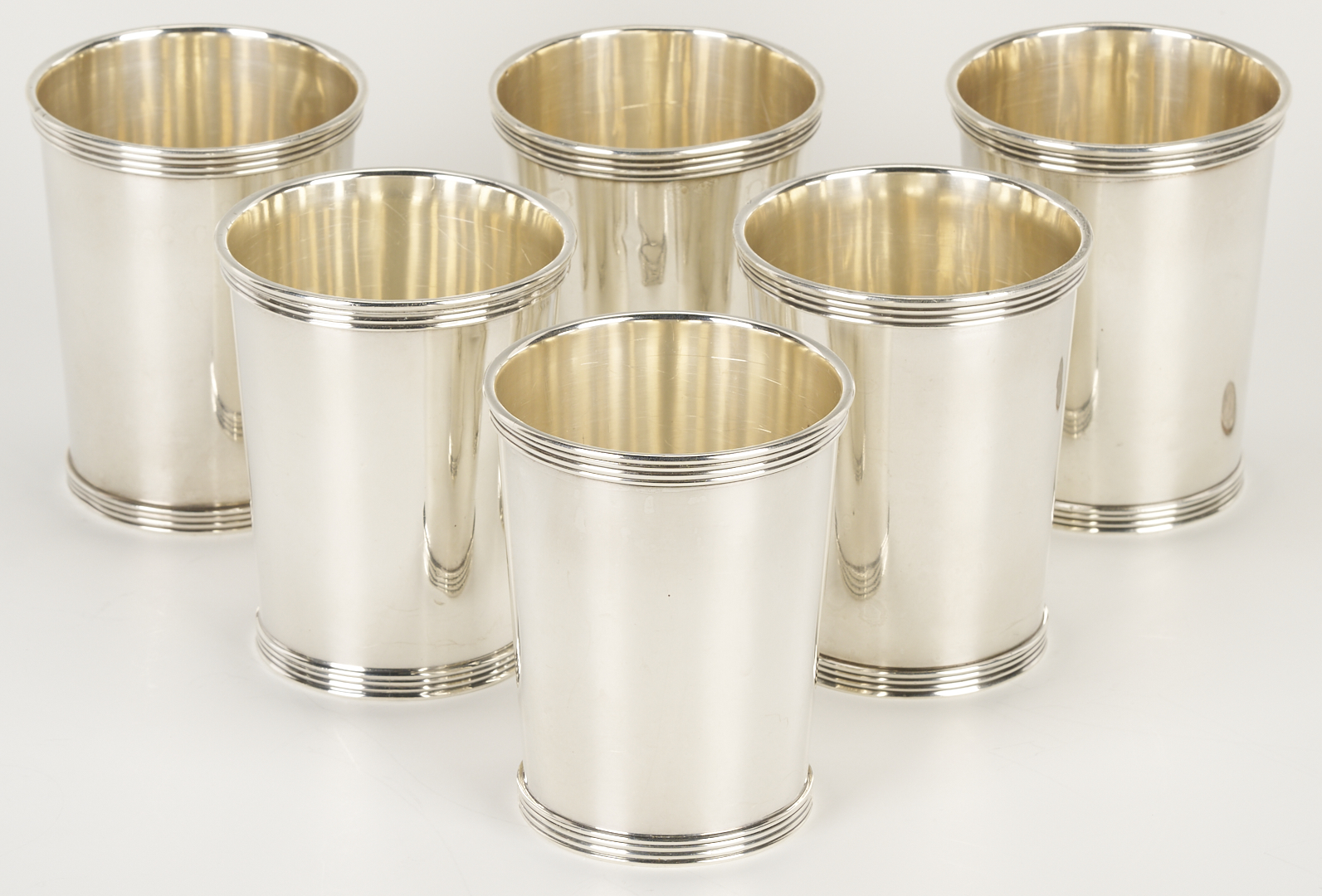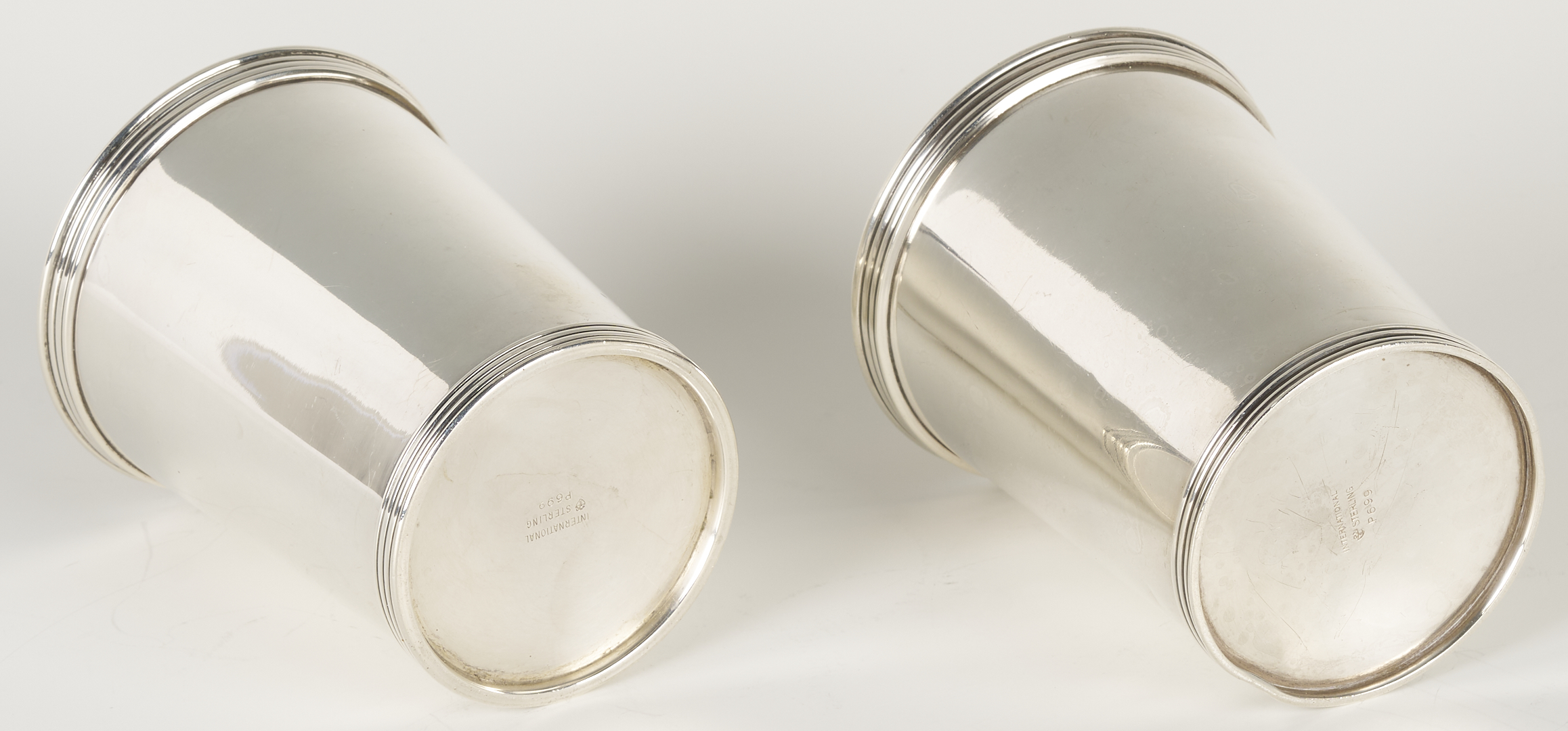 Set of six (6) sterling silver mint julep cups, all marked for International Sterling, P699 and having tapered sides with reeded rims and foot rings. No monograms or removals. 3 3/4 in H, 25.71 oz troy. American, 20th century.