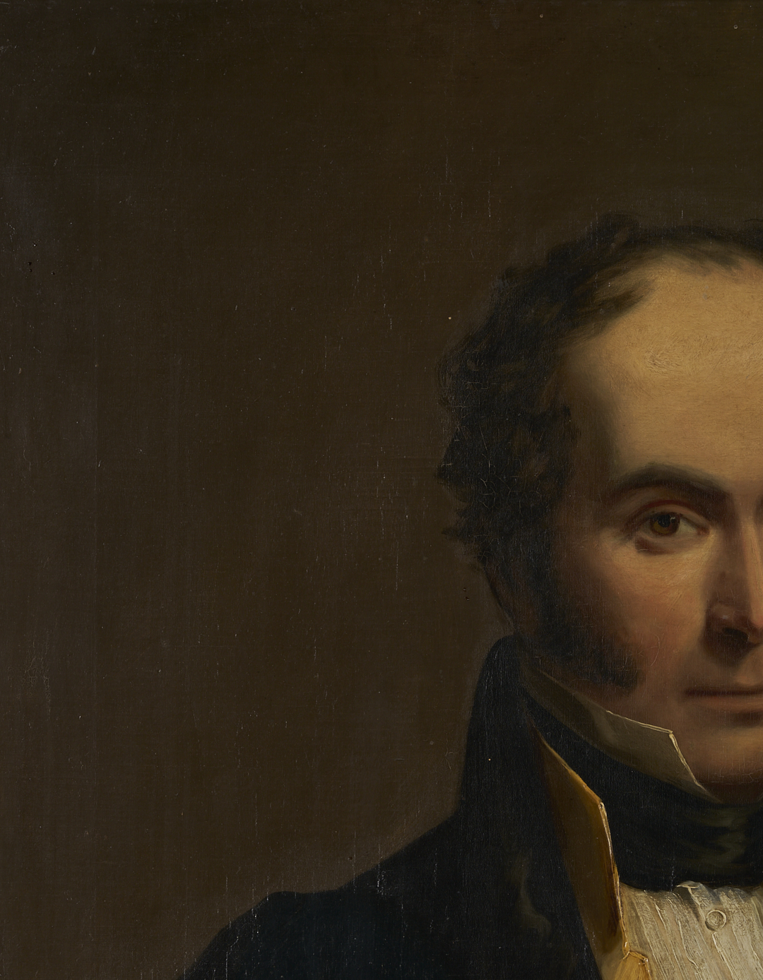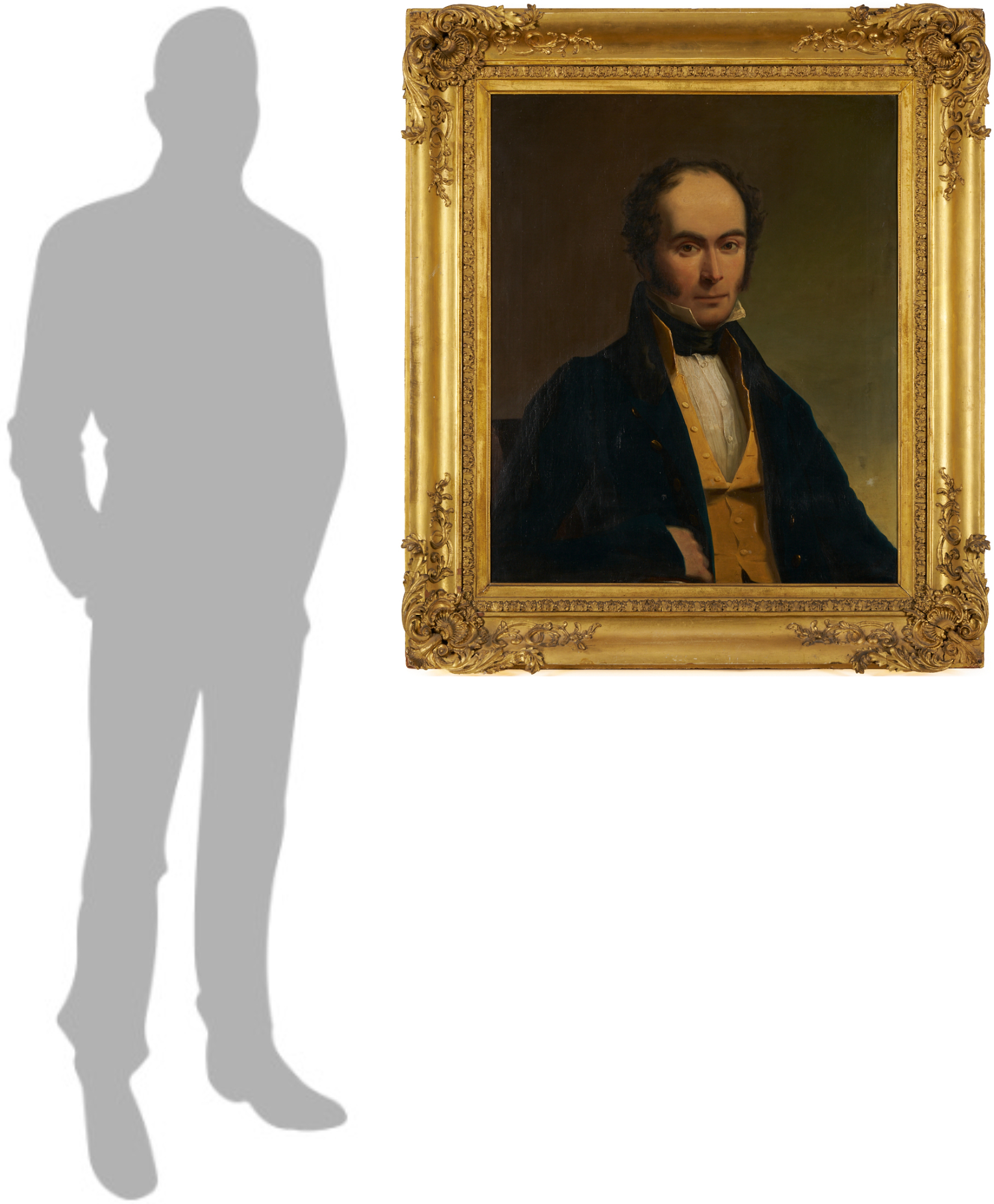 British School, early 19th century, oil on canvas portrait of a gentleman identified by 20th century label en verso as Dr. David Forrest (1800-1834), a surgeon in the East India Company who is buried at Kirkcaldy, Scotland. The subject is depicted seated, wearing a dark blue coat tie and yellow vest, with dark thinning hair and brown eyes, against an indistinct background. Unsigned. Antique, possibly original, wide molded giltwood frame with carved Rococo style corner ornamentation. Sight: 29 in. H x 24 in. W. Frame: 40 in. H x 35 in. W.