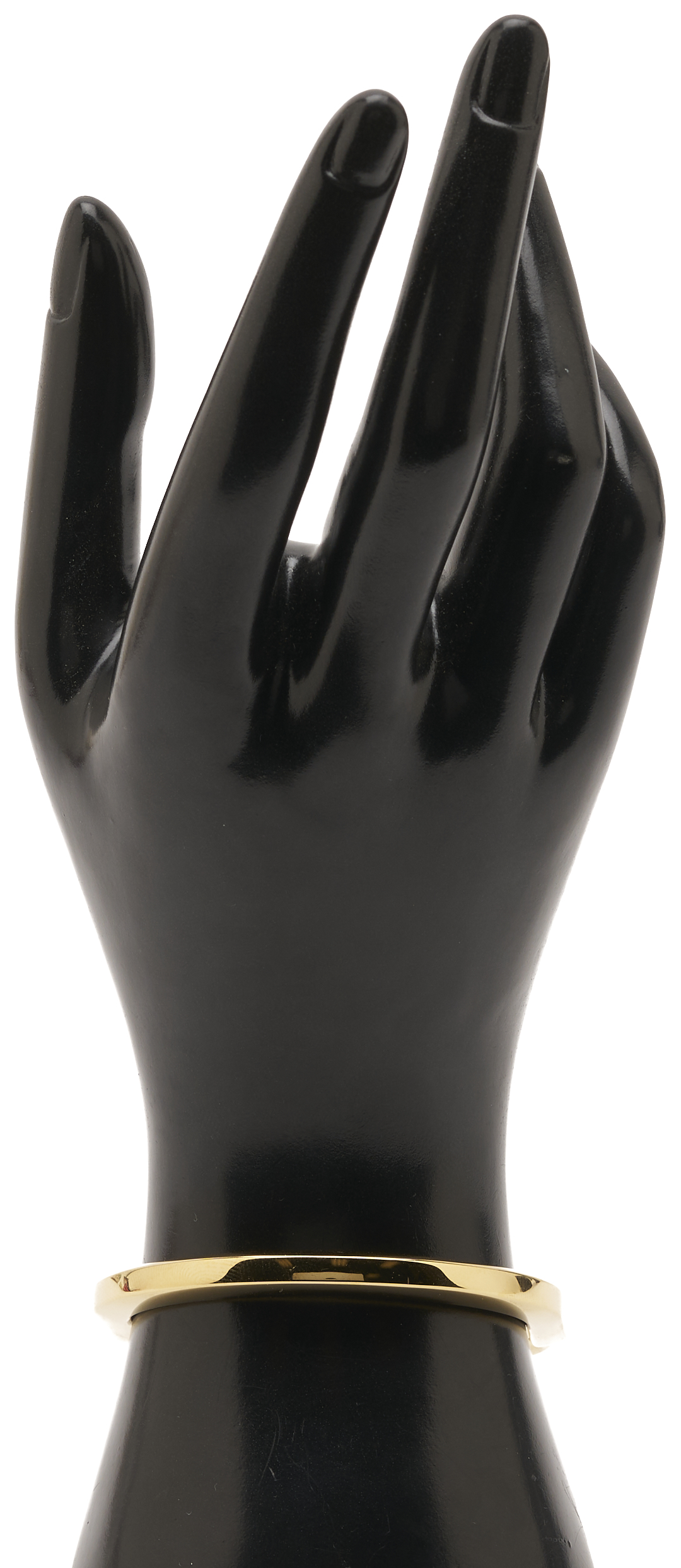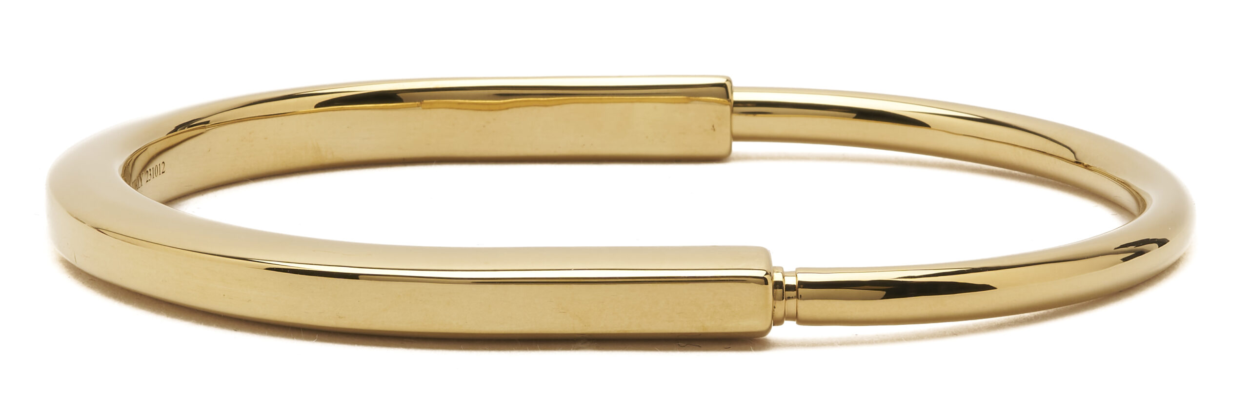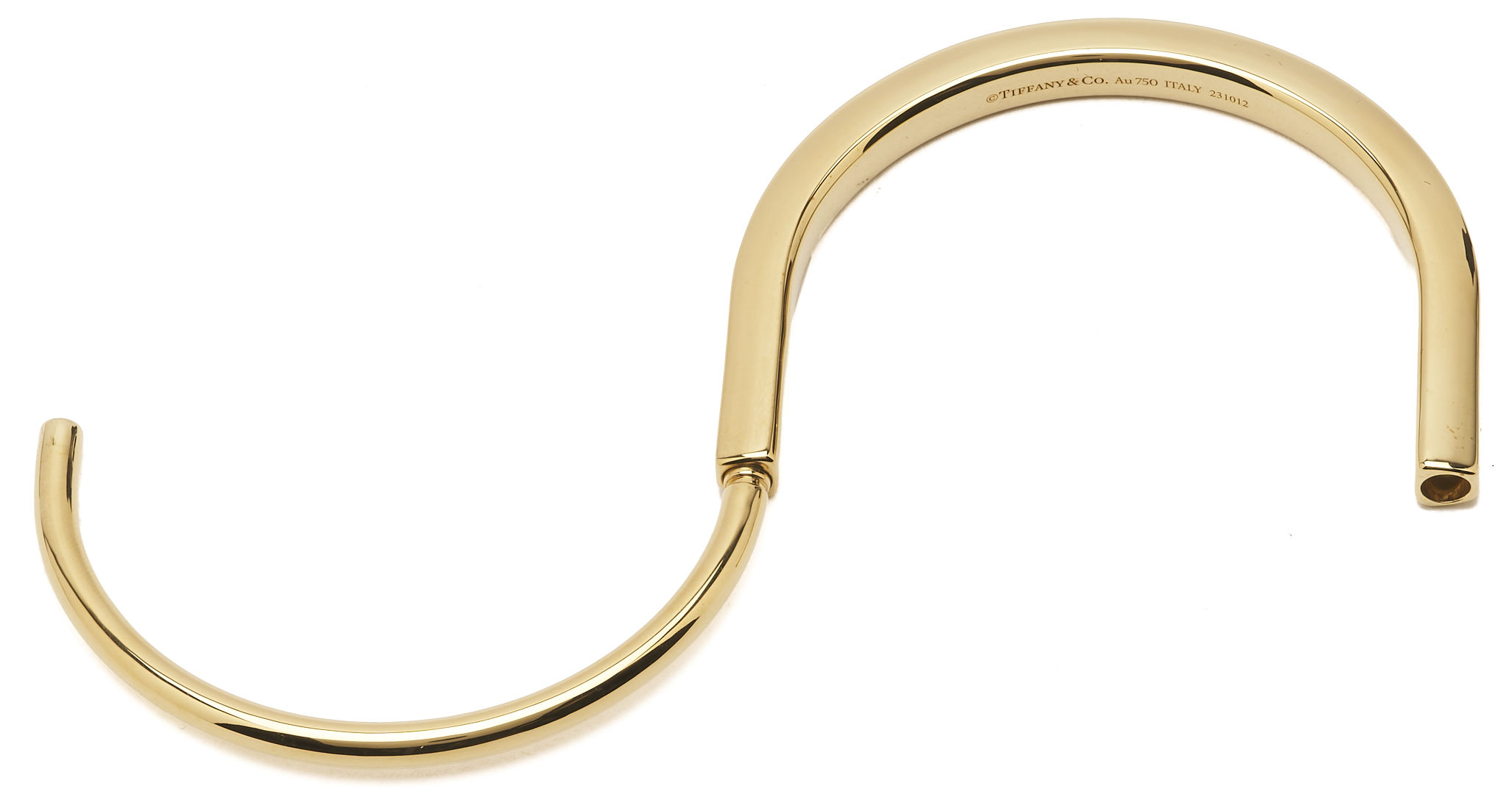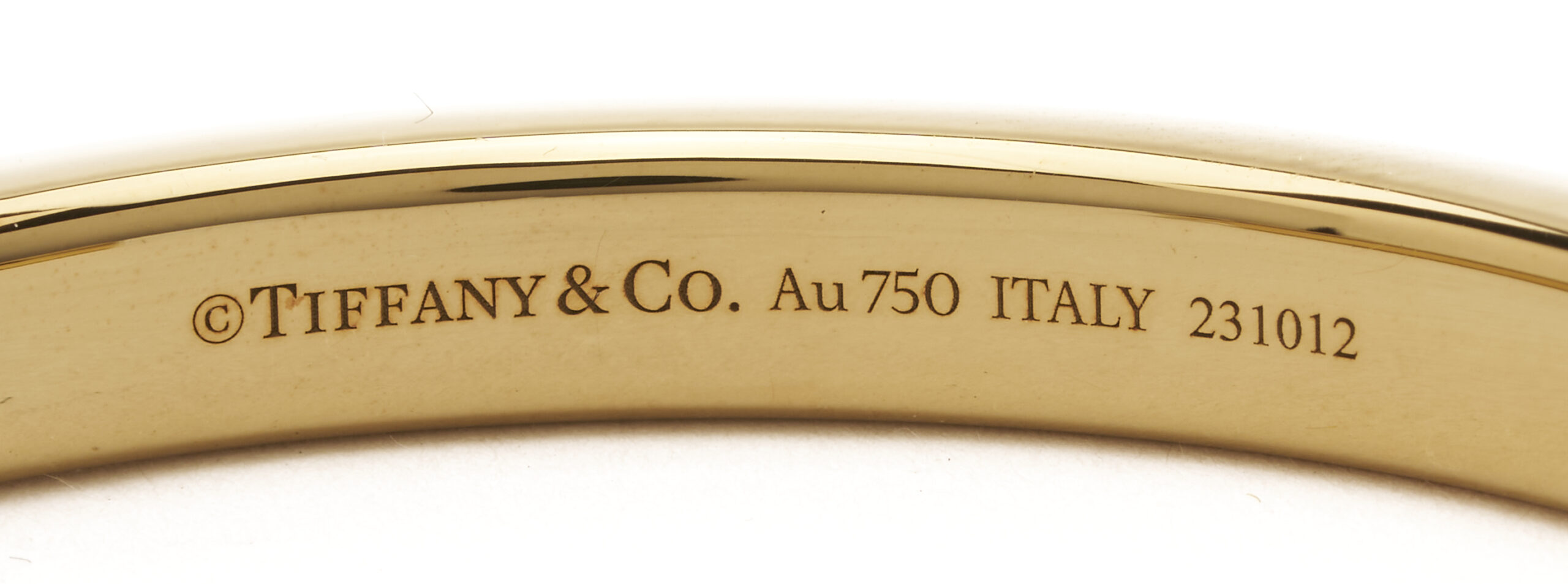 Ladies’ 18K yellow gold lock bangle bracelet by Tiffany and Company. The bracelet is marked “Tiffany & Co. Au750 Italy 231012” and XRF tests 18K gold. The bracelet is 7 1/2 in. circumference and has a weight of 29.16 grams.