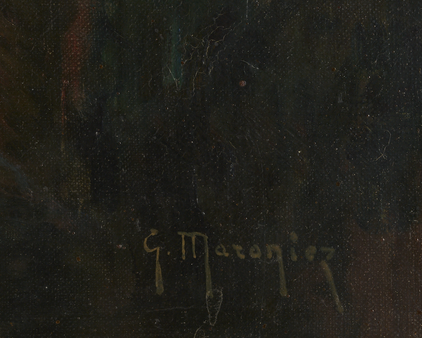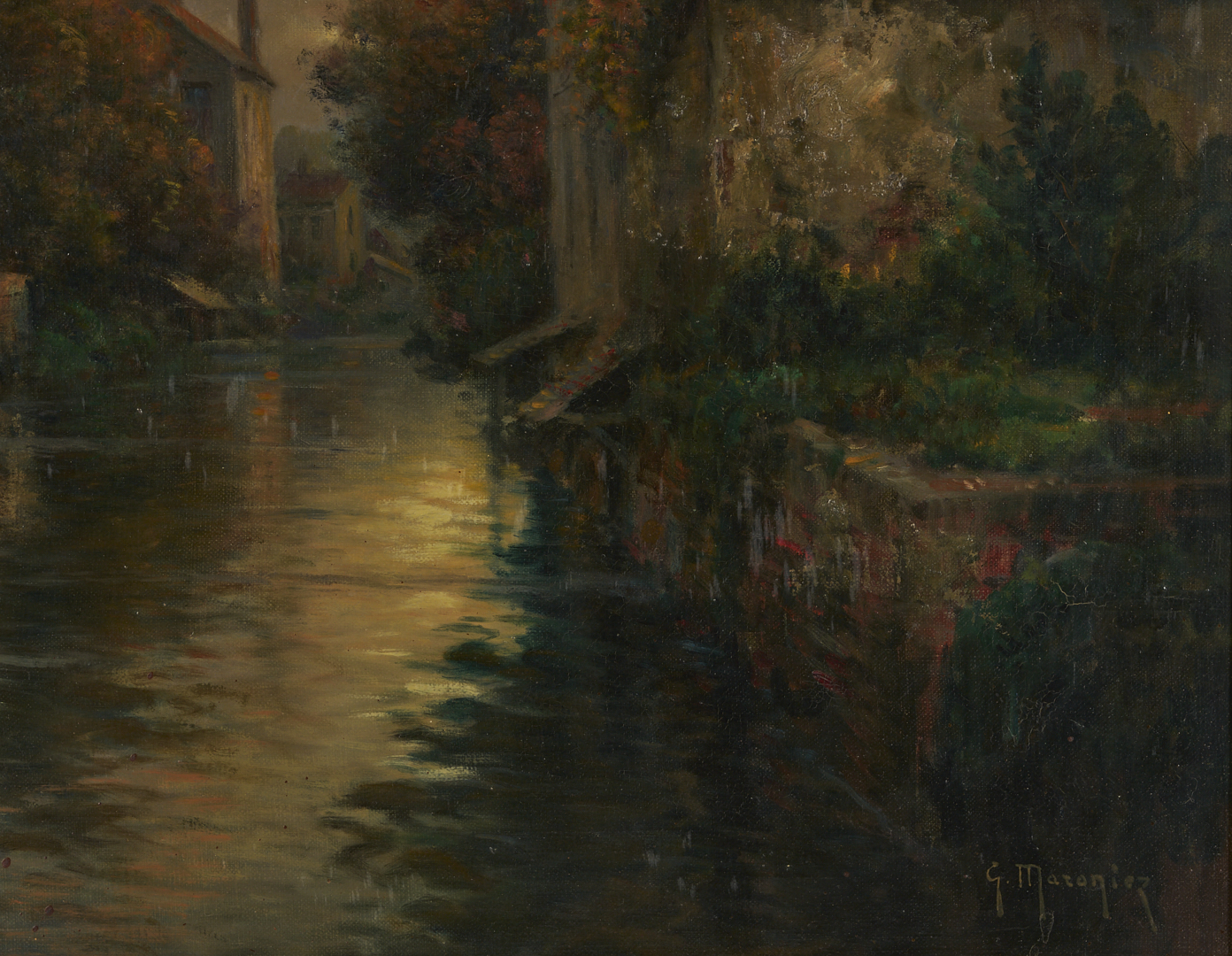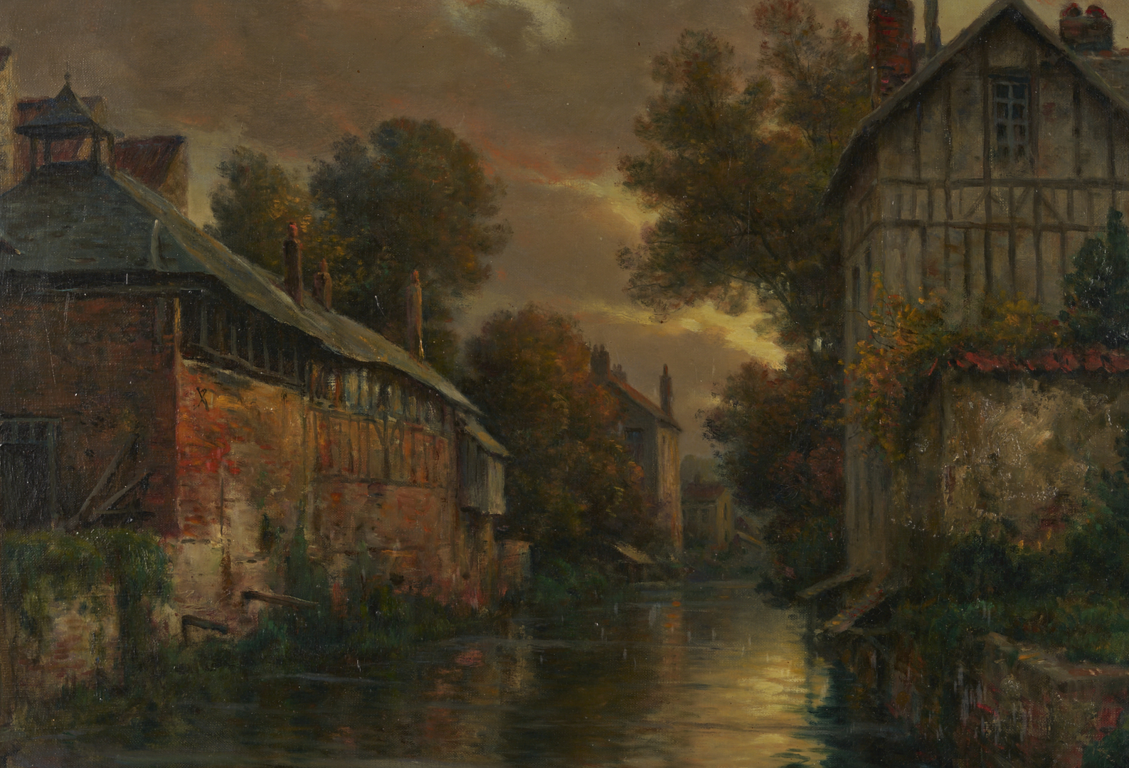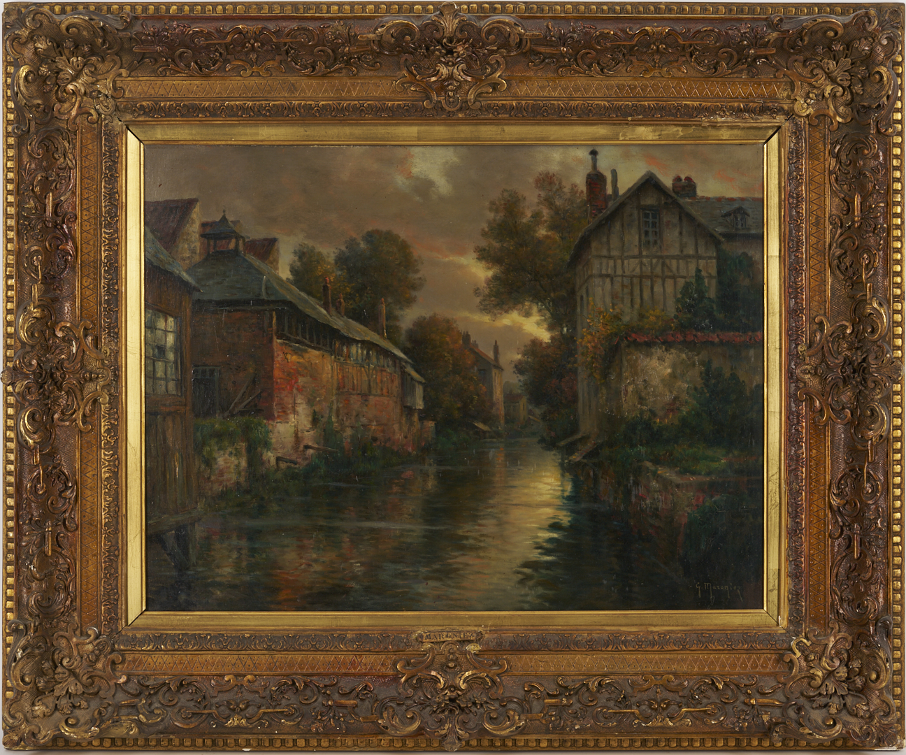 Georges Philibert Charles Maroniez (1865 – 1933), oil on canvas, landscape painting depicting a sunset canal scene with village structures on either side. Signed lower right “G. Maroniez”. Housed in a heavily carved gilt and gesso foliate frame with beaded edge. Sight: 17 5/8 in. H x 23 3/8 in. W. Framed: 28 1/4 in. H x 34 1/4 in. W.