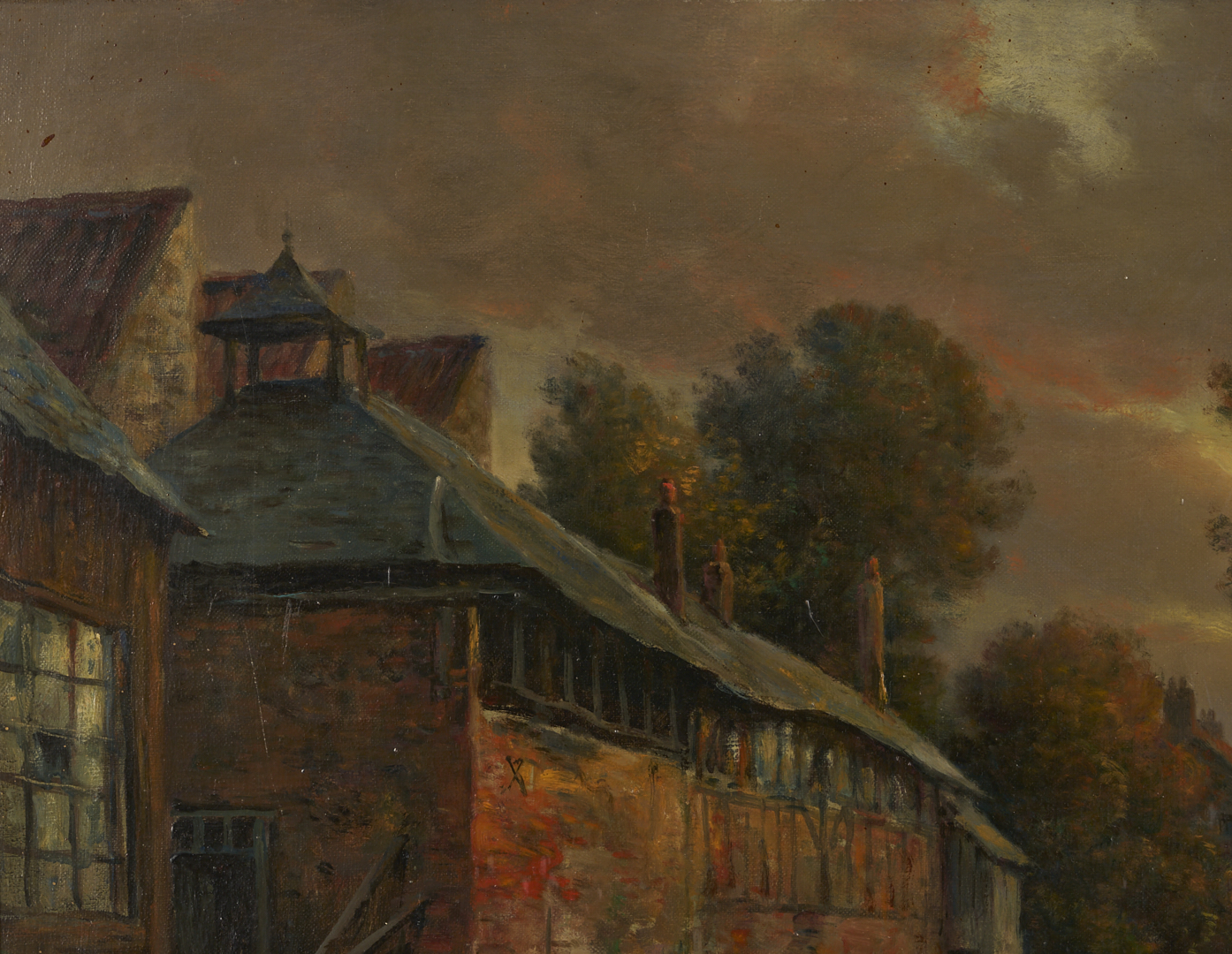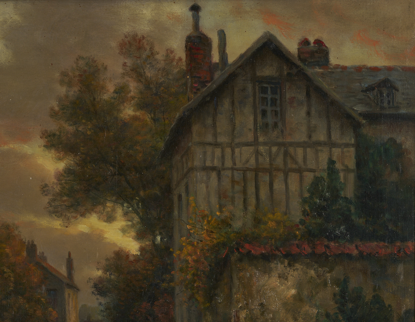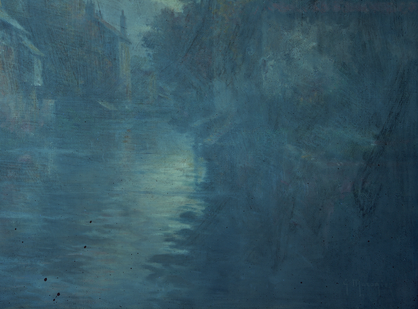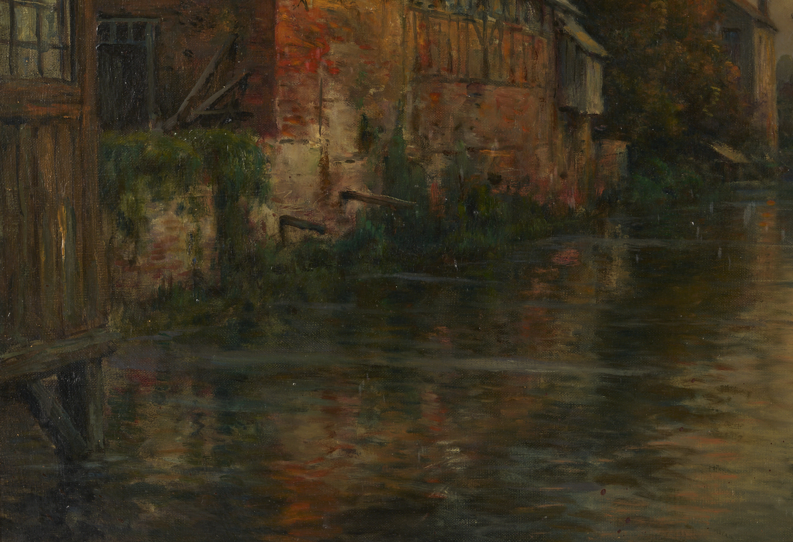 Georges Philibert Charles Maroniez (1865 – 1933), oil on canvas, landscape painting depicting a sunset canal scene with village structures on either side. Signed lower right “G. Maroniez”. Housed in a heavily carved gilt and gesso foliate frame with beaded edge. Sight: 17 5/8 in. H x 23 3/8 in. W. Framed: 28 1/4 in. H x 34 1/4 in. W.