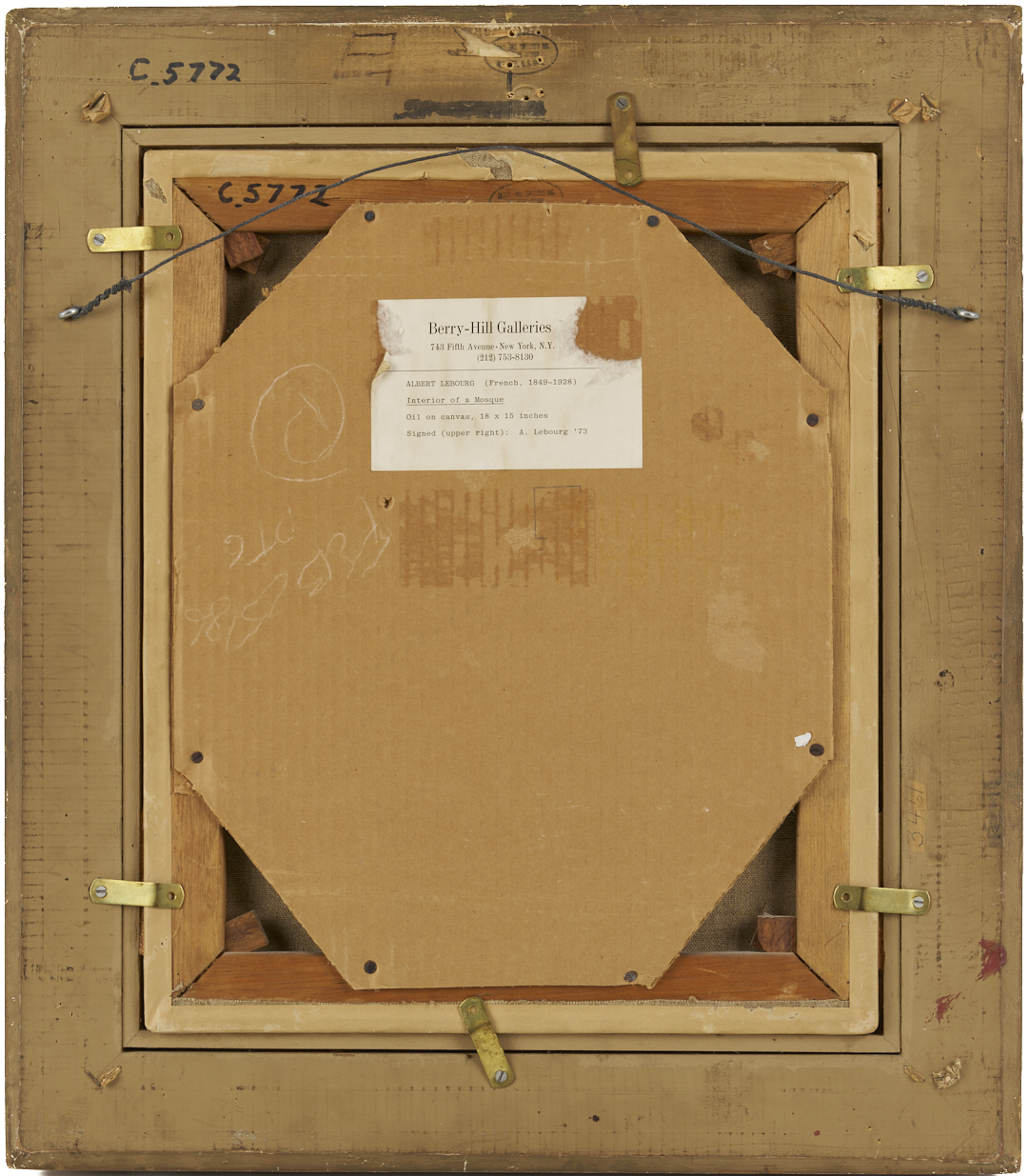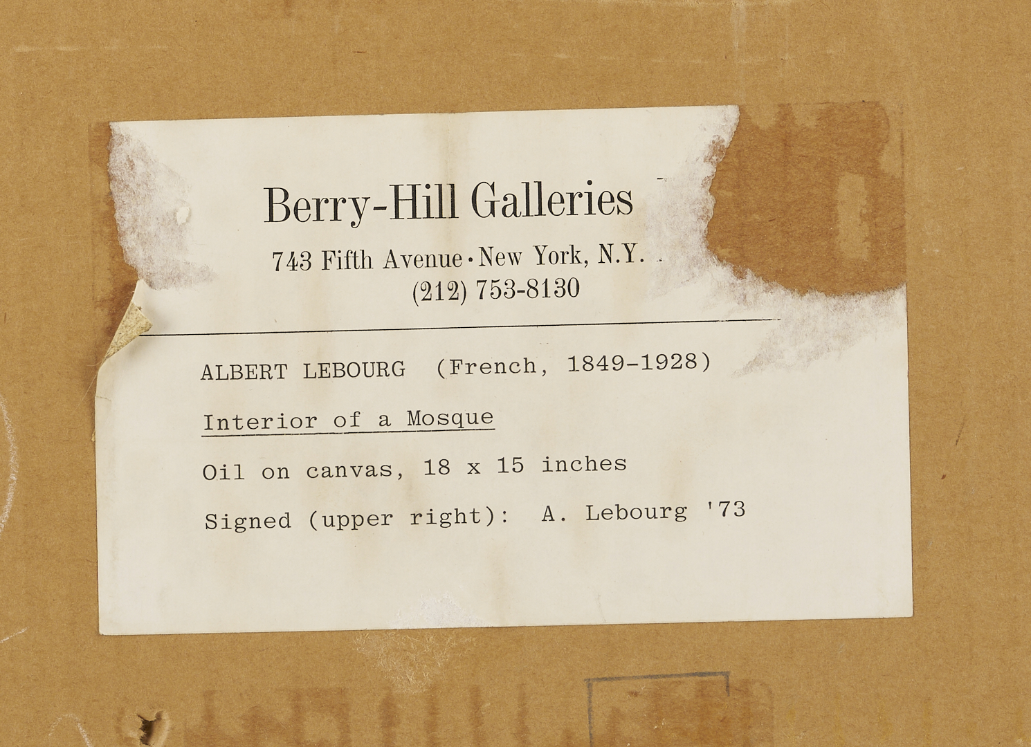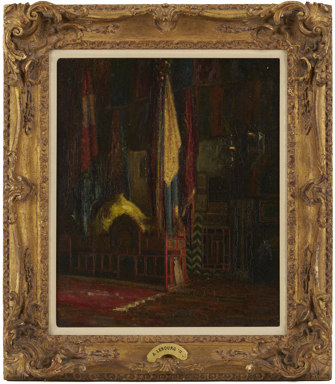 Albert Marie Lebourg (French, 1849-1928) oil on canvas painting depicting the interior of a mosque. Signed upper right corner and dated 1873. Molded giltwood and composition frame with artist name plaque. Label en verso for Berry Hill Galleries, New York. Sight: 17 1/4 in. x 14 1/4 in. Frame: 24 in. H x 21 in. W. Biography: Albert Lebourg studied at the Ecole des Beaux Arts of Rouen and with Jean-Paul Laurens, and also trained in an architectural office. He lived in Normandy but traveled frequently throughout Europe and spent several years in Algeria as a drawing teacher for the Beaux Arts Society of Algiers. Lebourg joined the Impressionist group early on, appearing twice in the group’s shows in 1879 and 1880, and continued to exhibit at the Salon from 1883 until 1895.