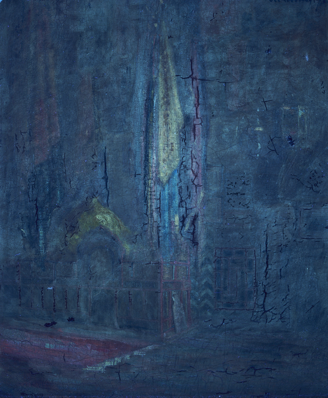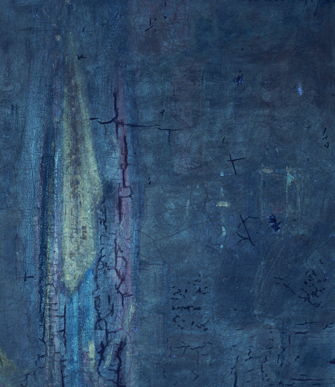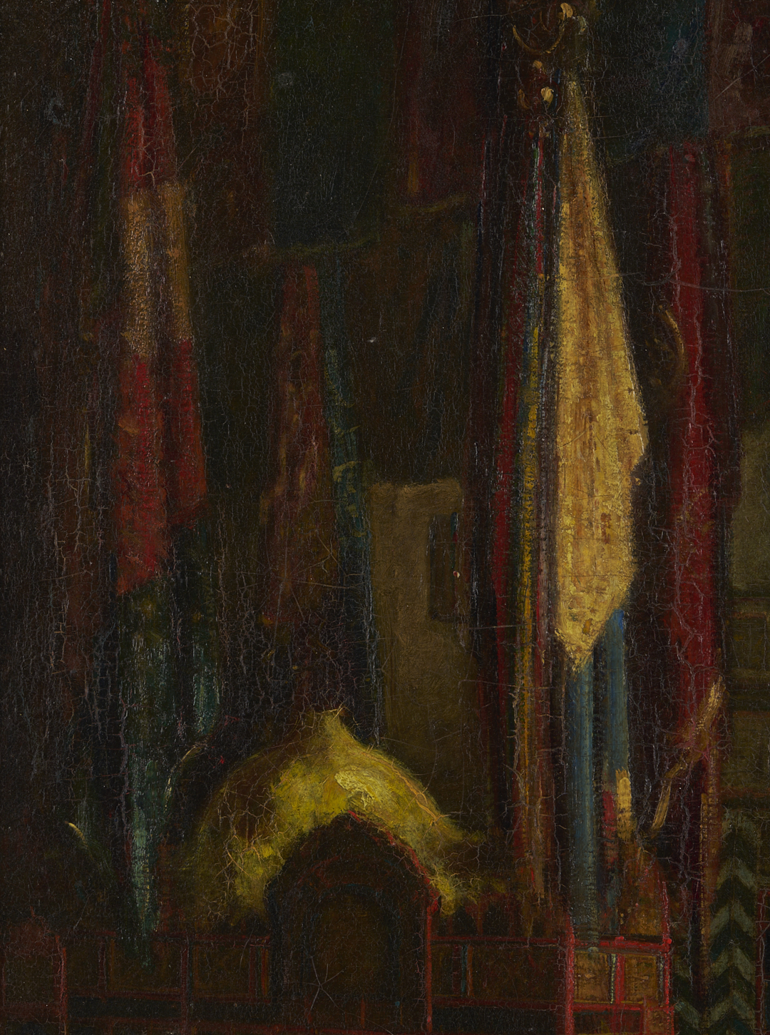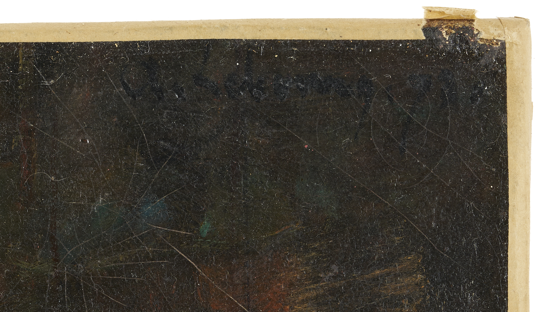 Painting overall very good condition with some craquelure; UV light inspection shows some infill painting to some areas of craquelure. Frame has several spots of wear and minor losses to gilt surface. Nameplate missing a screw.