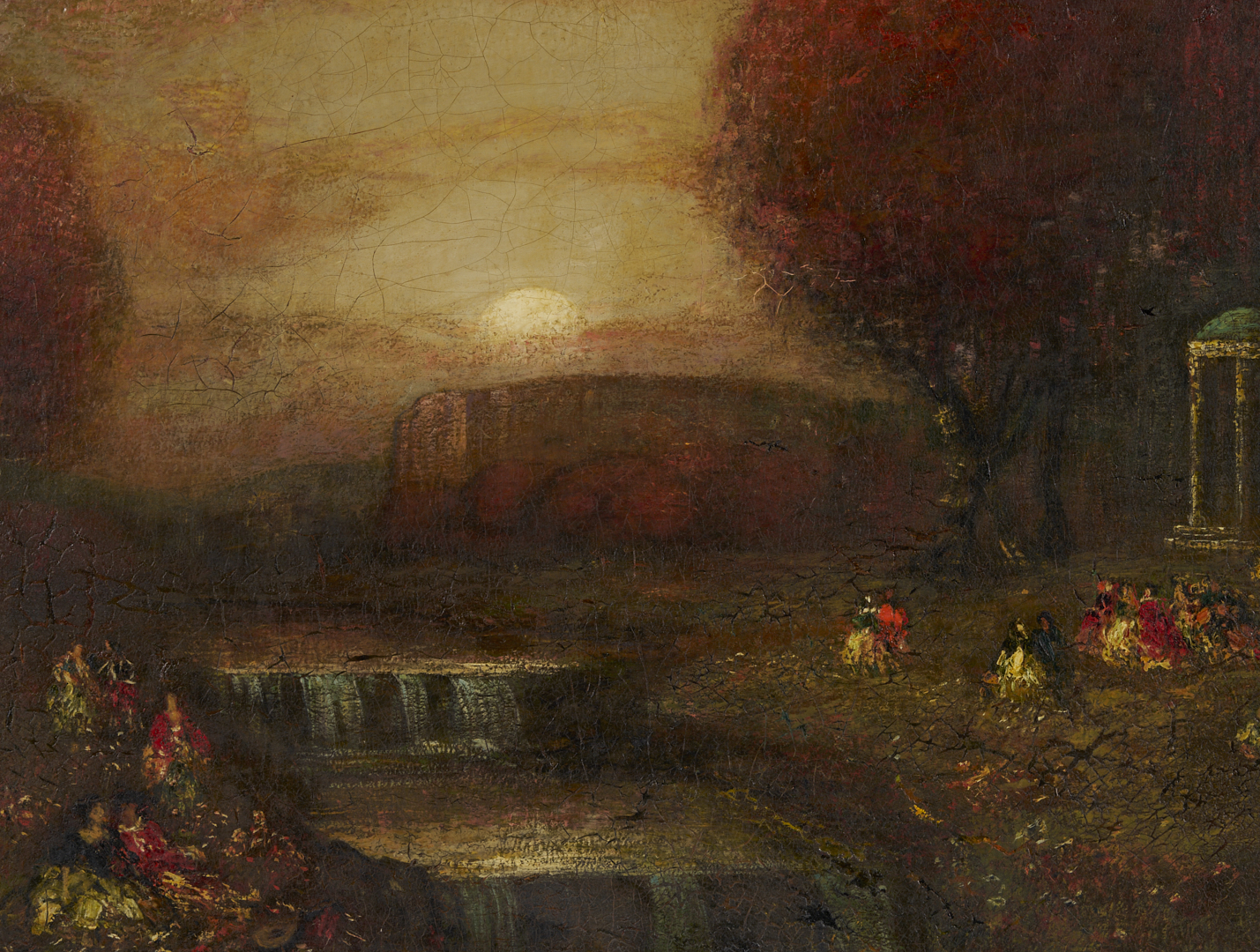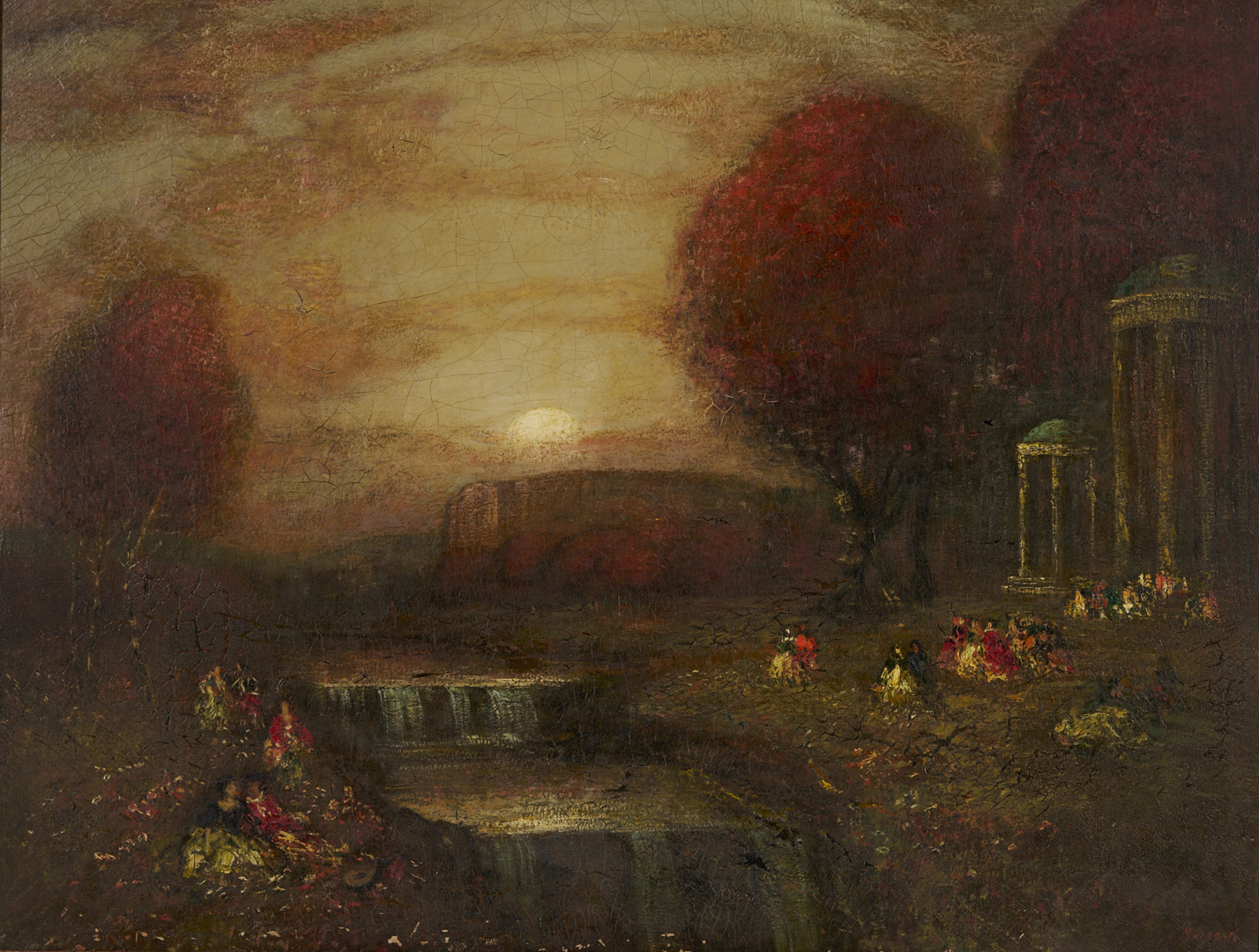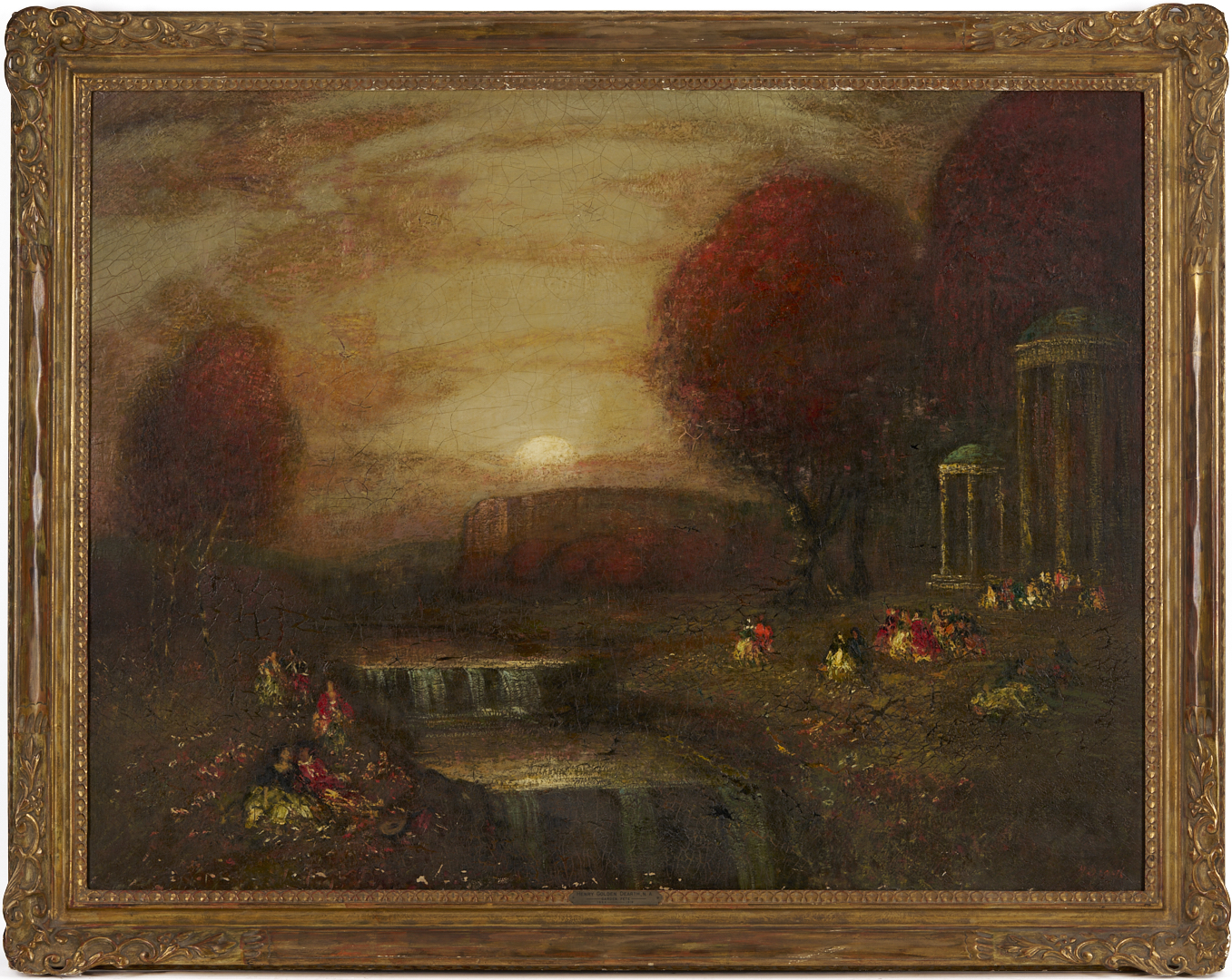 Henry Golden Dearth (American, 1864-1918), “Garden Fete,” large tonalist oil on canvas landscape depicting figures in an idyllic classical landscape setting. Signed “H. Dearth” lower right. Molded giltwood frame with carved ornamentation at corners; old NYC framing label en verso. Sight: 34 in. H x 45 in. W. Frame: 41 in. H x 52 in. W. Biography: Henry Golden Dearth was known for tonalist, richly textured landscapes, especially twilight scenes and rock pool studies. He took his earliest art lessons with Horace Chauncey Johnson, and traveled to Paris in 1883 to study at the Ecole des Beaux-Arts. He won major awards, including the Webb Prize and medals at the 1900 Paris and 1901 Pan-American expositions. Source: The National Gallery of Art.