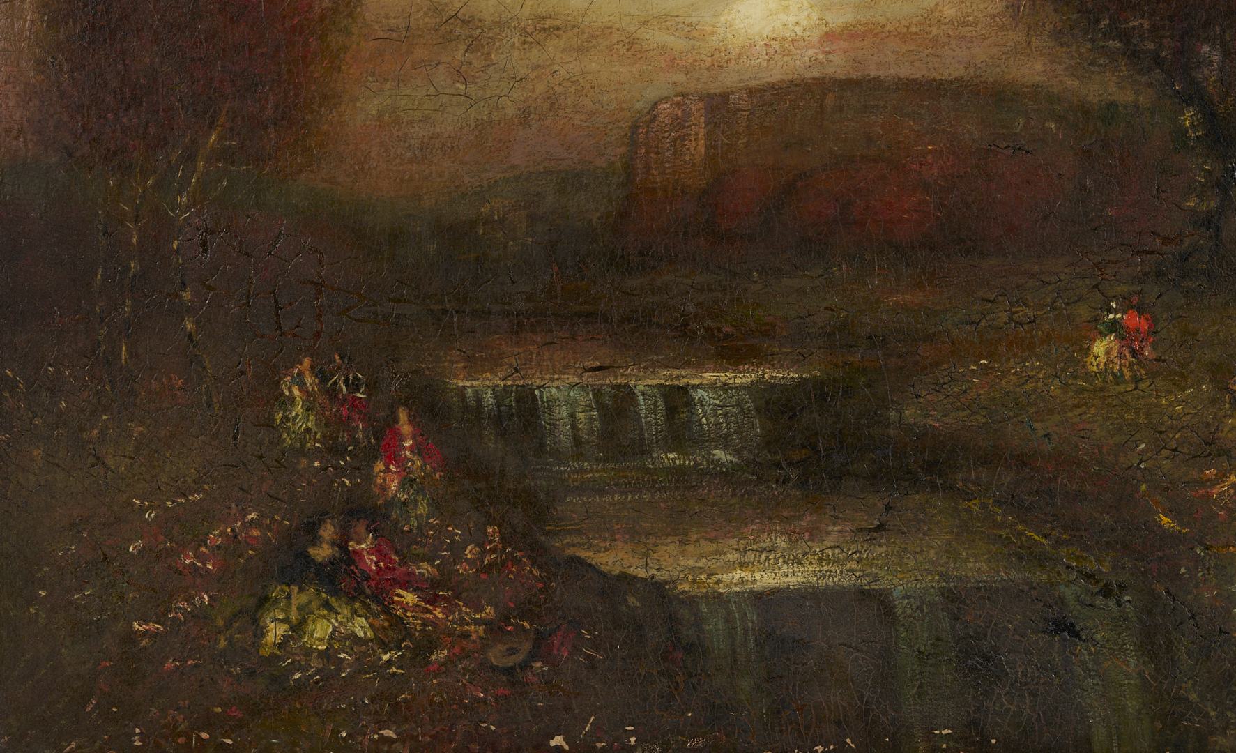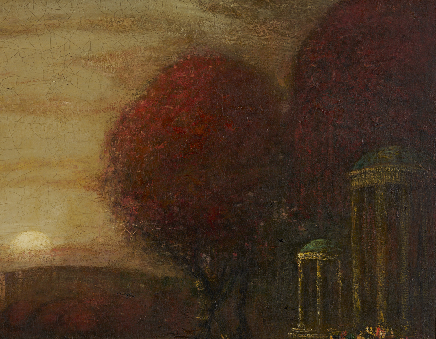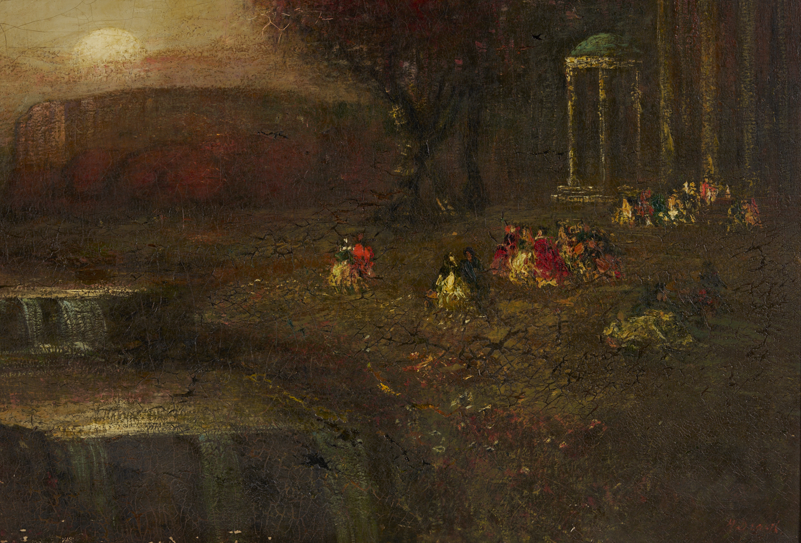 Henry Golden Dearth (American, 1864-1918), “Garden Fete,” large tonalist oil on canvas landscape depicting figures in an idyllic classical landscape setting. Signed “H. Dearth” lower right. Molded giltwood frame with carved ornamentation at corners; old NYC framing label en verso. Sight: 34 in. H x 45 in. W. Frame: 41 in. H x 52 in. W. Biography: Henry Golden Dearth was known for tonalist, richly textured landscapes, especially twilight scenes and rock pool studies. He took his earliest art lessons with Horace Chauncey Johnson, and traveled to Paris in 1883 to study at the Ecole des Beaux-Arts. He won major awards, including the Webb Prize and medals at the 1900 Paris and 1901 Pan-American expositions. Source: The National Gallery of Art.