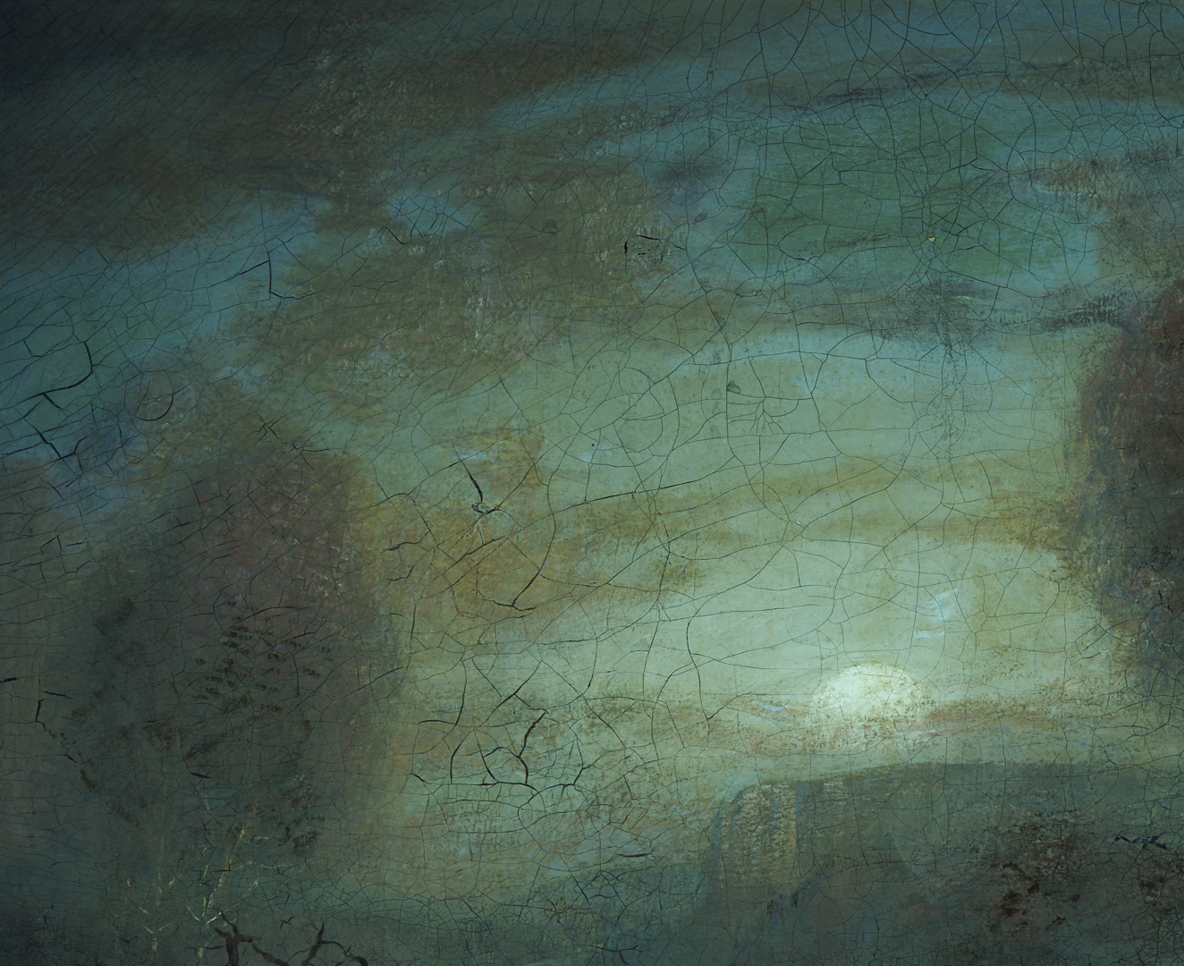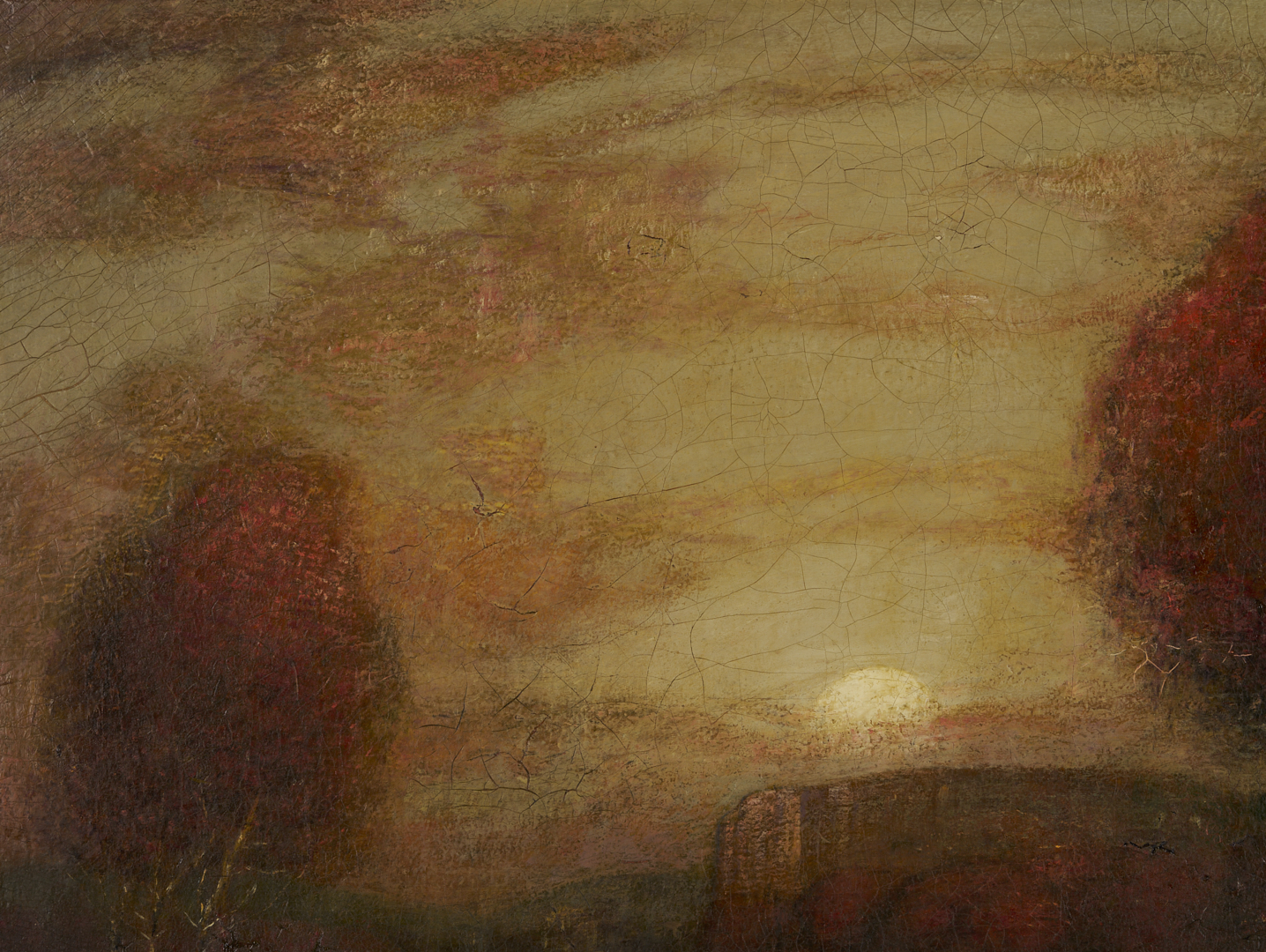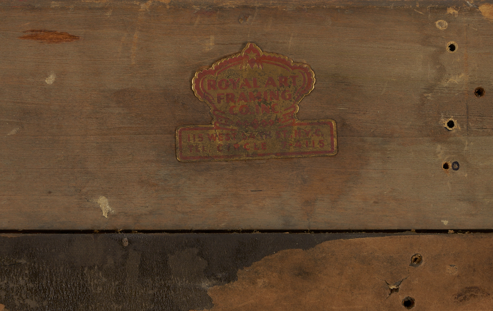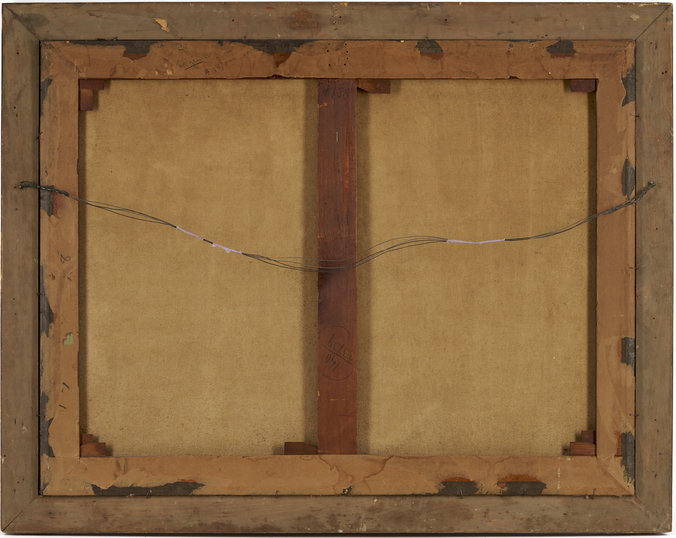 Craquelure and drying cracks throughout. some possibly as a result of the artist’s techniques, with a few resulting small spots of paint loss. There is a narrow band of exfoliation along the lower left edge with flakes up to 1/2 in. Frame has some surface wear and losses to gilding.