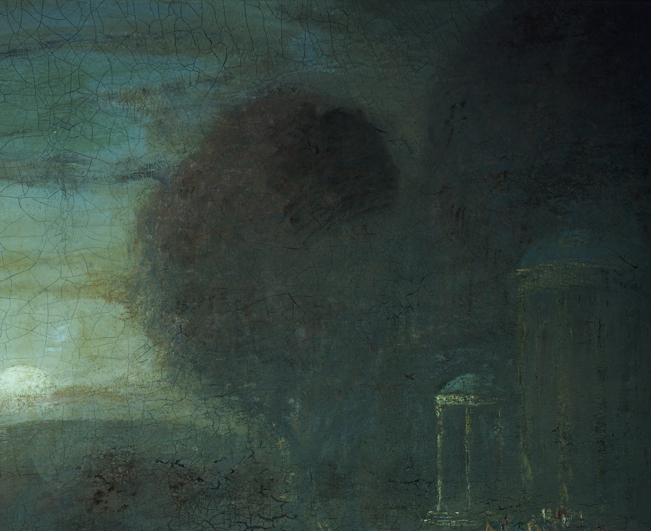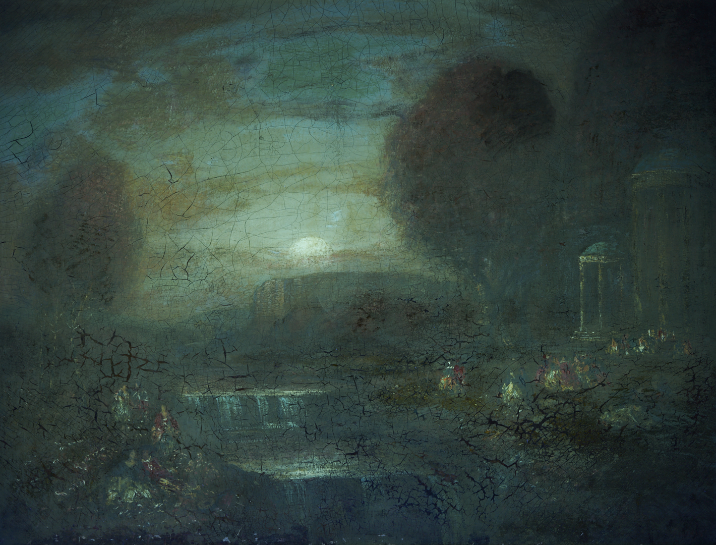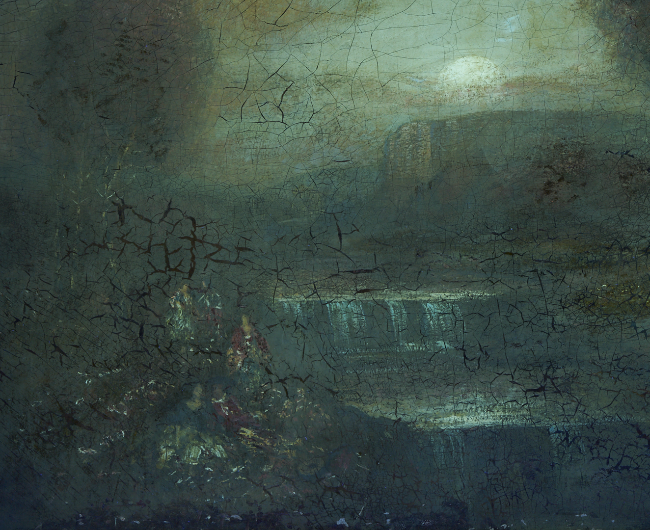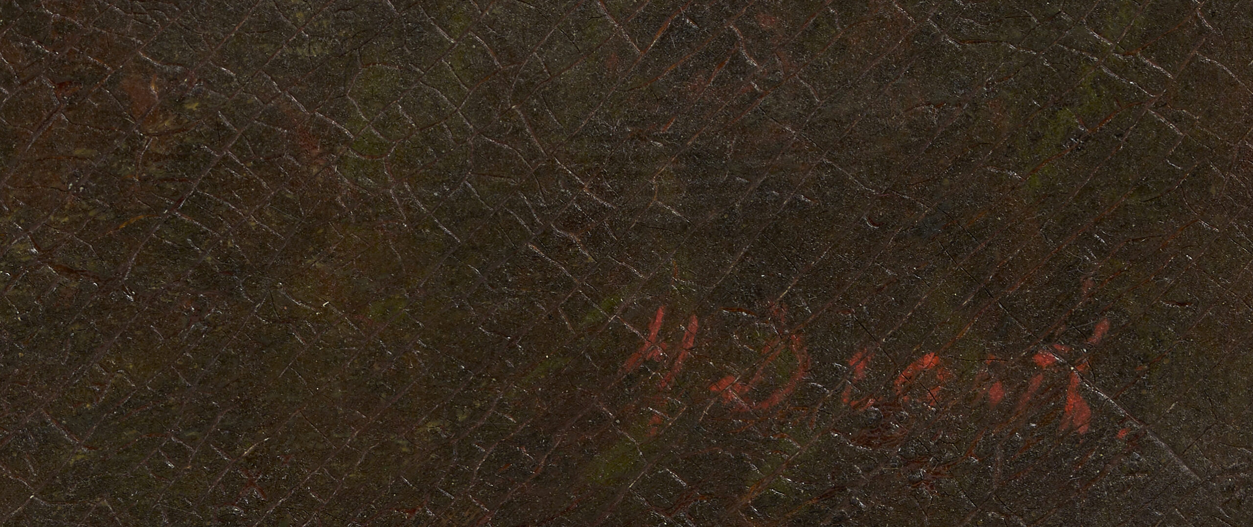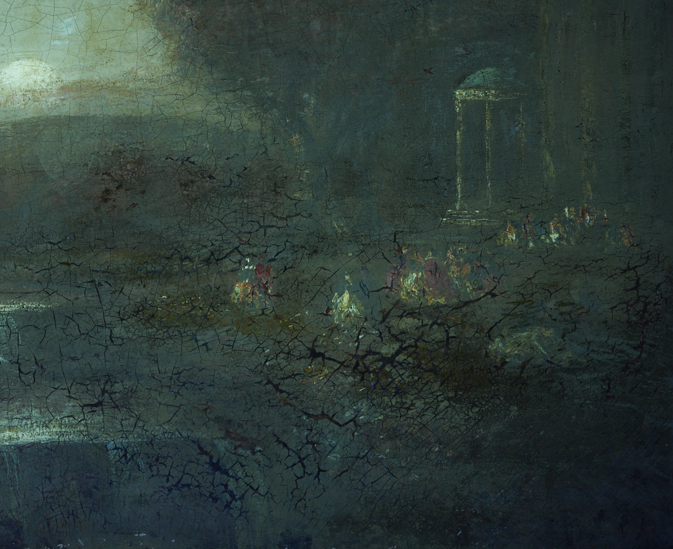 Craquelure and drying cracks throughout. some possibly as a result of the artist’s techniques, with a few resulting small spots of paint loss. There is a narrow band of exfoliation along the lower left edge with flakes up to 1/2 in. Frame has some surface wear and losses to gilding.