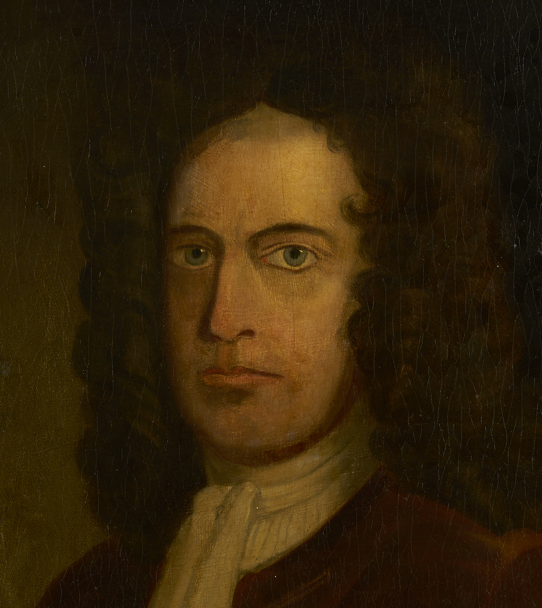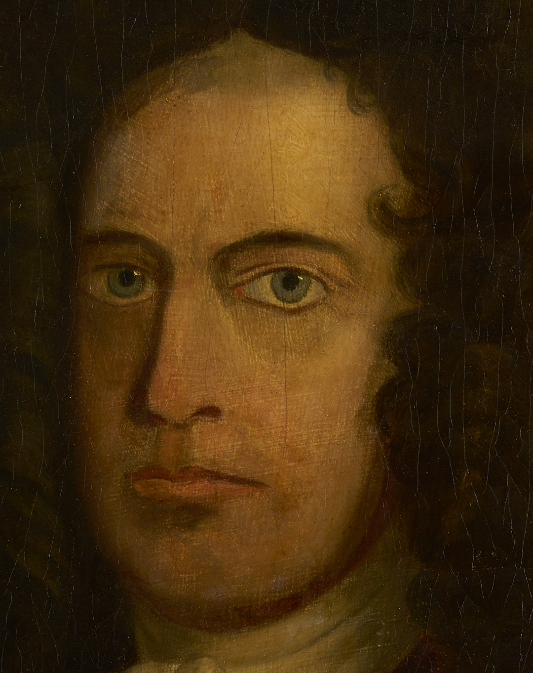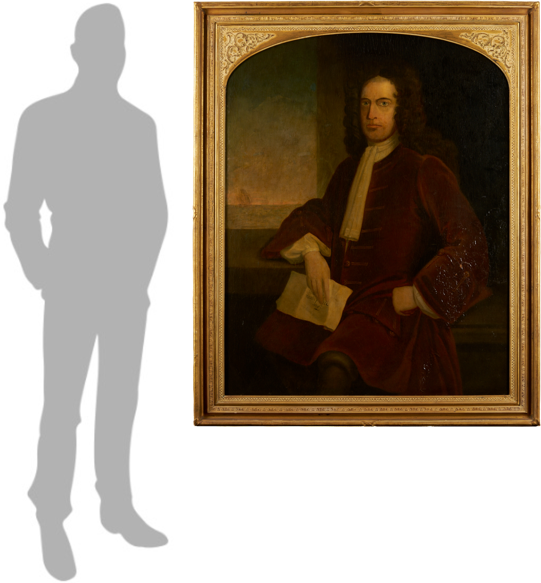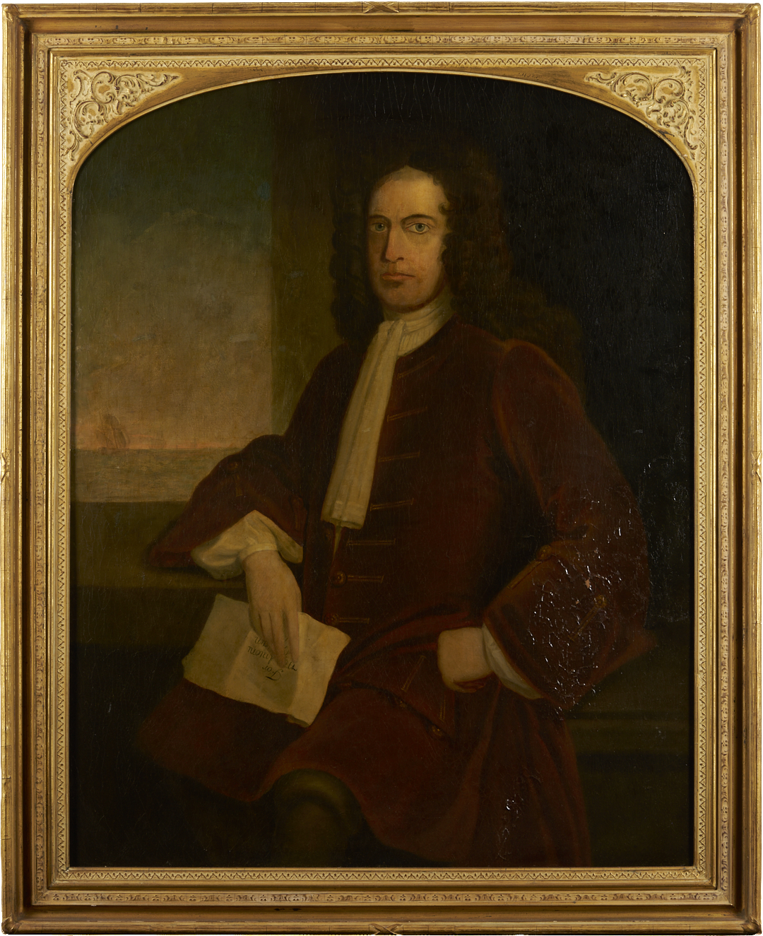 American School Colonial portrait of Antony Duane (b. ca. 1679-d. ca. 1740) of New York, possibly by Evert Duyckinck III (1677-1747), Pieter Vanderlyn (1687-1778), or Nehemiah Partridge (1683-c. 1737). The three quarter length portrait depicts the subject wearing a long dark wig, burgundy velvet coat and white cravat. He is seated with his arm on a windowsill that overlooks a body of water with a ship sailing by. He holds a letter in his hand addressed to “M –Antoni –ain.” Housed in a later giltwood molded frame with arched top having raised, Rococo style ornaments to the spandrels. An old Cleveland Museum of Art label is affixed to the frame. Stretcher: 46 1/4 in. H x 36 in. W. Frame: 53 1/2 in. H x 43 1/2 in. W. Circa 1730. Note: Anthony Duane, aka Antony Duain, was born in Ireland c. 1679 and came to New York as a Naval officer among the British Fleet in 1698. He became a wealthy merchant and landowner, acquiring land around Schenectady which would become known as Duanesburg. He had four children including a prominent son, James Duane, who was a member of the Revolutionary Committee of New York, the Continental Congress, and one of the signers of the Articles of Confederation at Philadelphia in 1777. (James Duane was also a New York state senator, Mayor of New York, and Judge). This painting bears a distinct similarity to photographic images of a portrait of Anthony Duane in the collection of the New York Historical Society. According to the NYHS, that portrait was added to the collection in 1951 from an unknown source and is not on public display for comparison. The painting in our auction has descended directly in the family of the sitter.