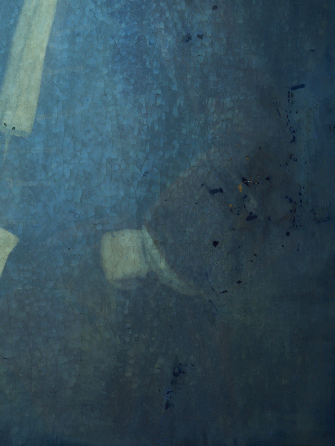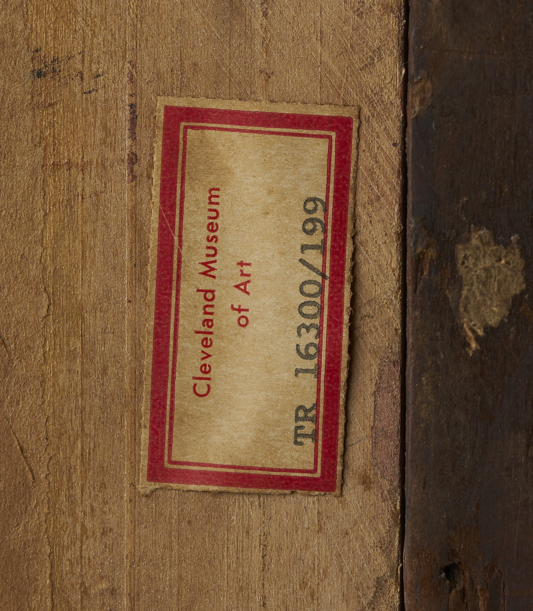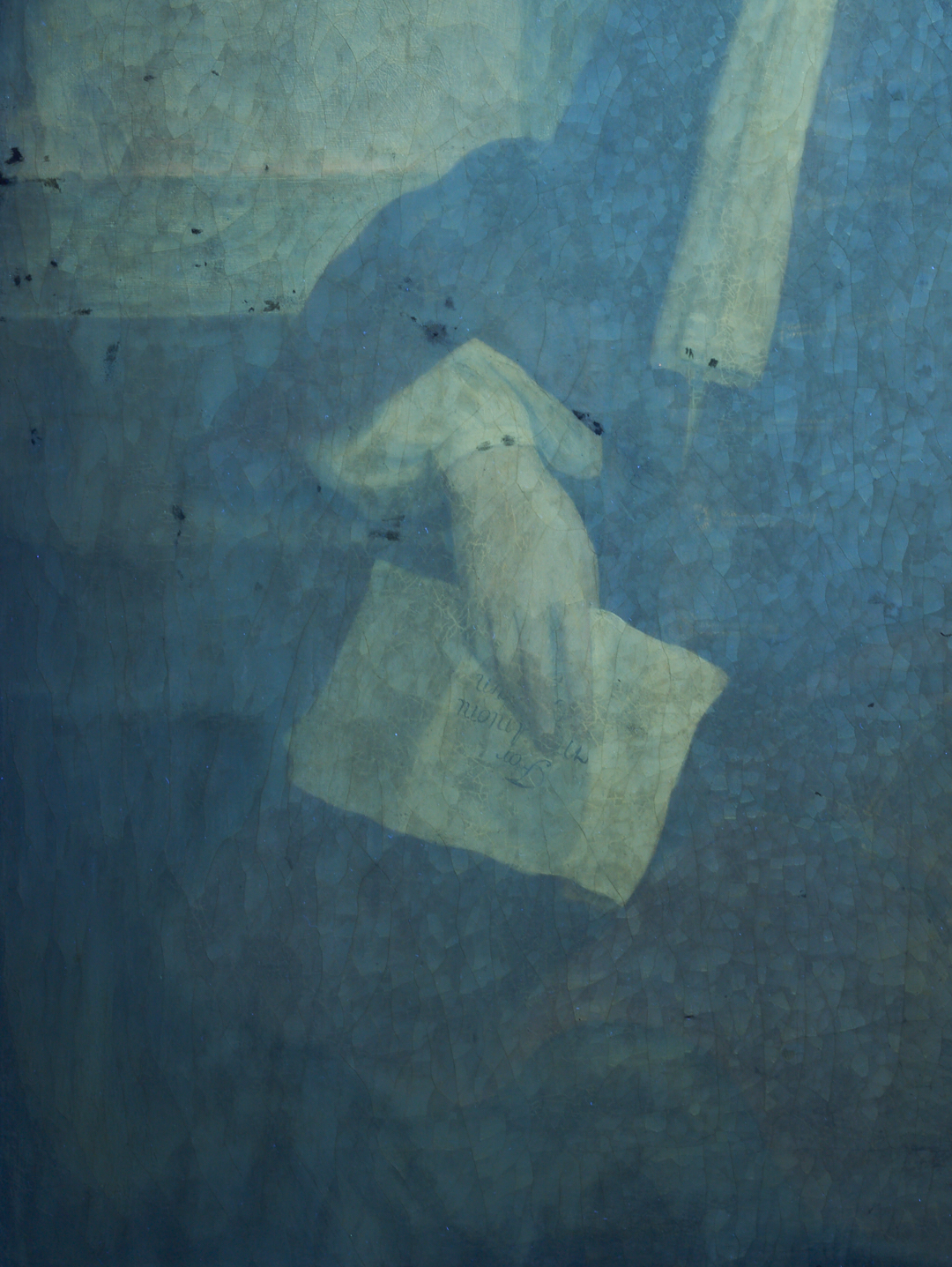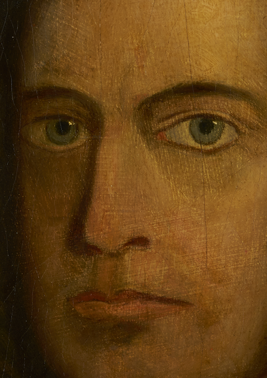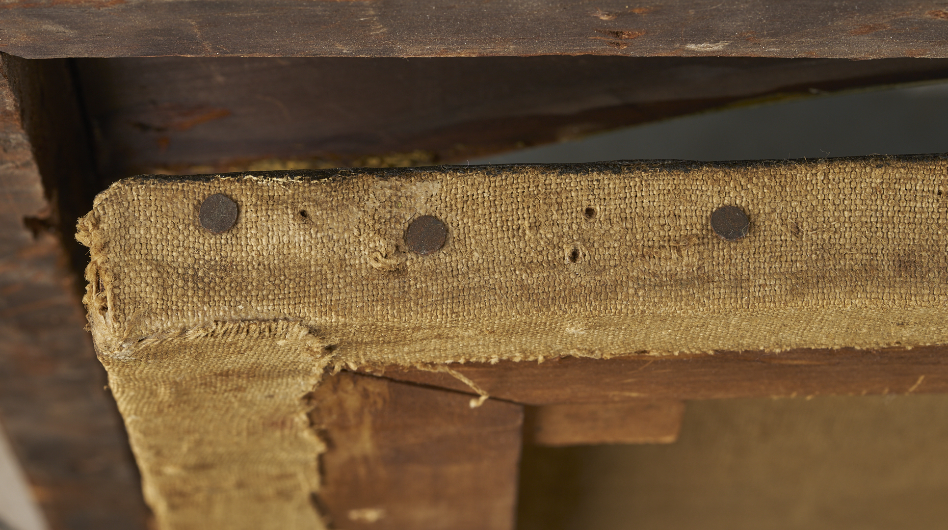 CONDITION: Canvas has been lined to edge of the stretcher and the stretcher is not original. Lower right quadrant has a 22 in. x 7 in. area of delamination including a few small areas of paint loss up to 3/4 in. to subject’s sleeve and coat. Examination of this area under UV light shows spots of previous inpainting to this area. Also visible under UV light inspection are several other scattered spots of retouch to paint, and two repaired tears up to 1 1/4 in. L in the upper left quadrant (sky area within window). 1″ area of repair with touchup to subject’s forehead. Additional touch up to inner eyelids and chin area (see UV photograph). Stretcher line at top of canvas just above subject’s head. Later frame with some minor wear, overall good condition.