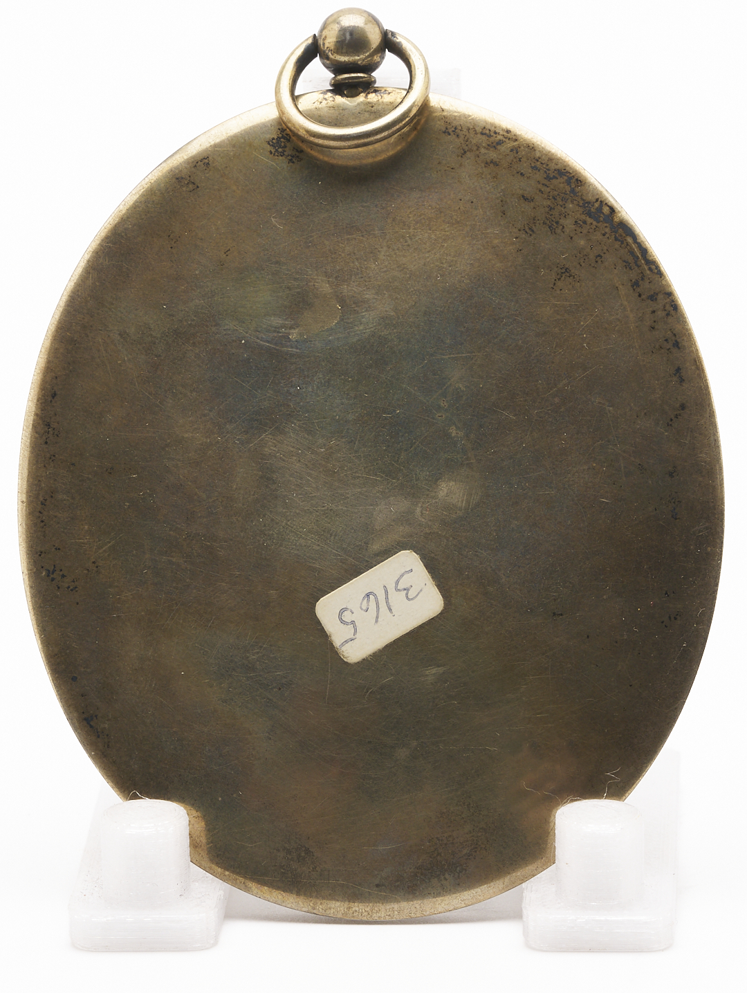 American School, circa 1865, watercolor on porcelain miniature portrait of a woman, seated in a Victorian chair and turned in three quarter view against a plain olive green/brown background. The woman, who appears to be in her 60s, wears a black coat and lace veil over a white blouse and turban. The oval painting is mounted in a plain, unmarked oval silver frame with hanging loop at top. Unsigned. Plaque: 3 1/4 in. H x 2 3/4 in. W. Frame: 3 1/2 in. H x 3 in W.