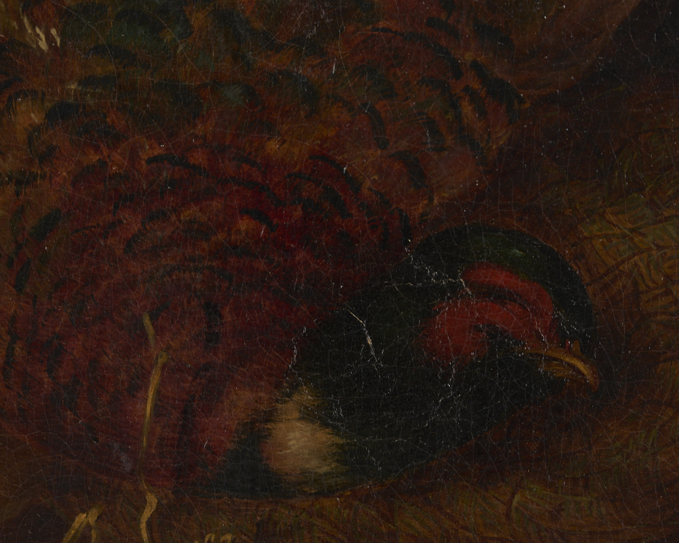 19th century American or English school hunt themed Nature Morte still life painting depicting a dead pheasant, set against a wood wall and resting on a table with scattered stalks of wheat. Unsigned. Housed in an ornate molded and giltwood Victorian frame. Sight: 19 in. H x 16 in. W. Frame: 28 1/2 in H x 24 in. W.