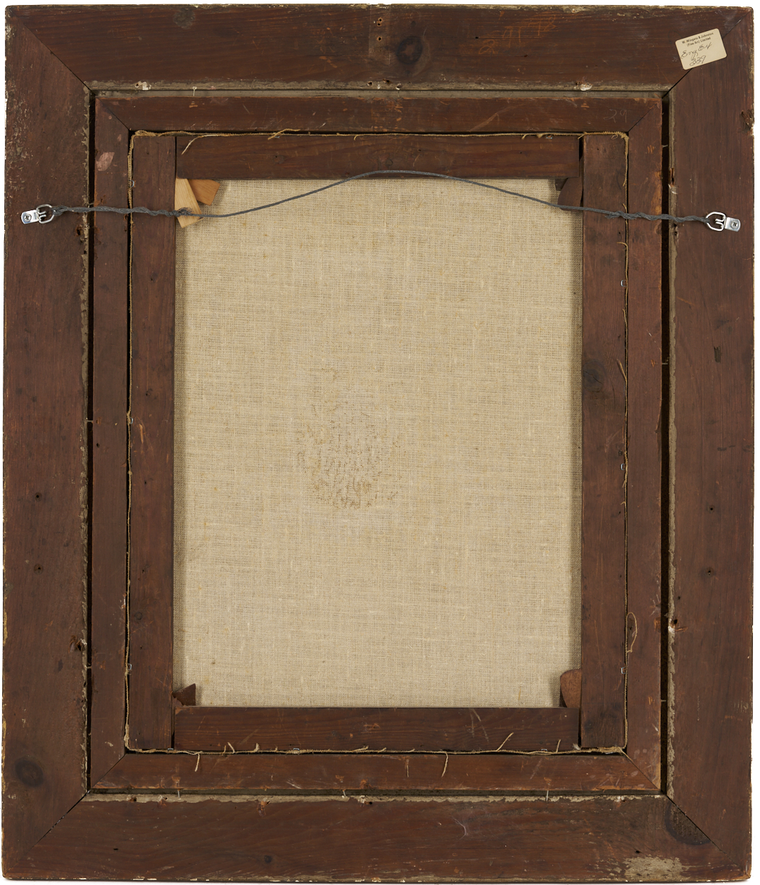 Lined, with scattered craquelure. Small 1/16″ flake or chip lower left quadrant. A few small losses and repairs to frame.