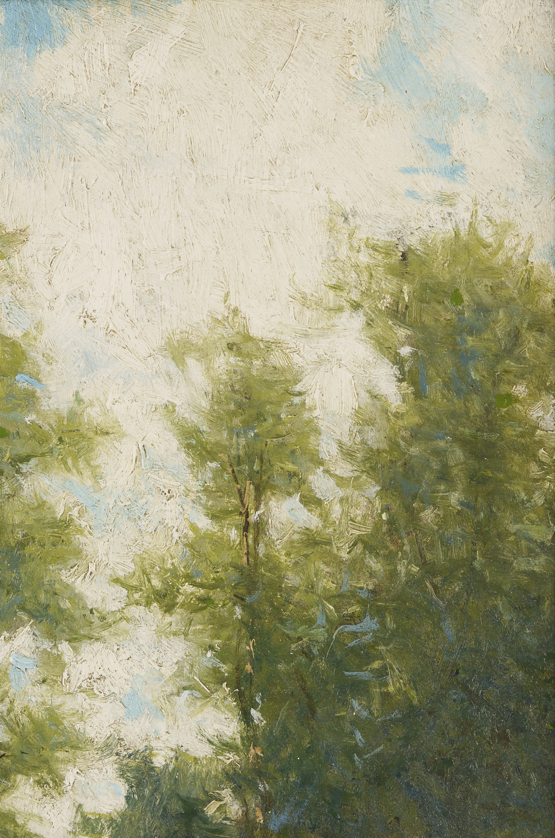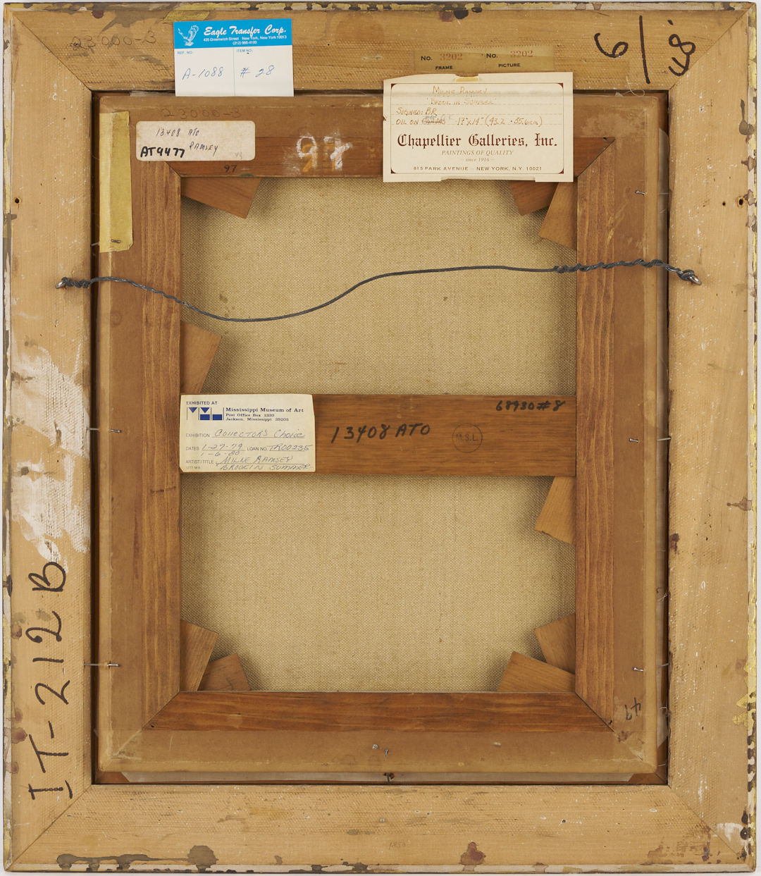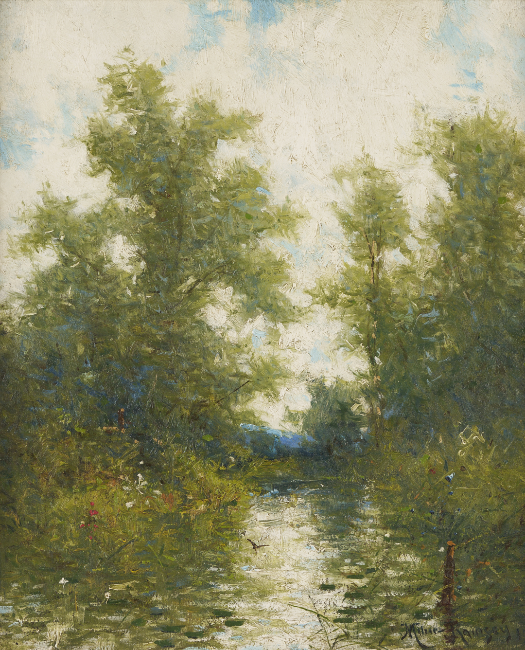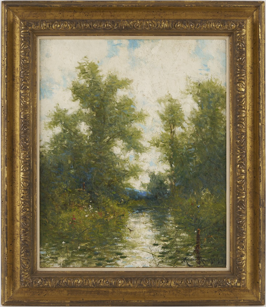 Milne Ramsey (Pennsylvania/New Jersey, 1847-1915) impressionist oil on canvas painting titled “Brook in Summer” depicting a tree-lined stream or brook with a body of water faintly visible in the background. Signed and possibly dated lower right. Chapellier Galleries, New York City label and Mississippi Museum of Art exhibition label en verso. Housed in a gilt carved frame and painted wood liner. Sight: 16 3/8 in. H x 13 3/8 in. W. Framed: 22 in. H x 19 1/8 in. W. Exhibition History: “Collector’s Choice,” Mississippi Museum of Art, Jackson, MS, Jan. 27, 1979 – Jan. 6, 1980.