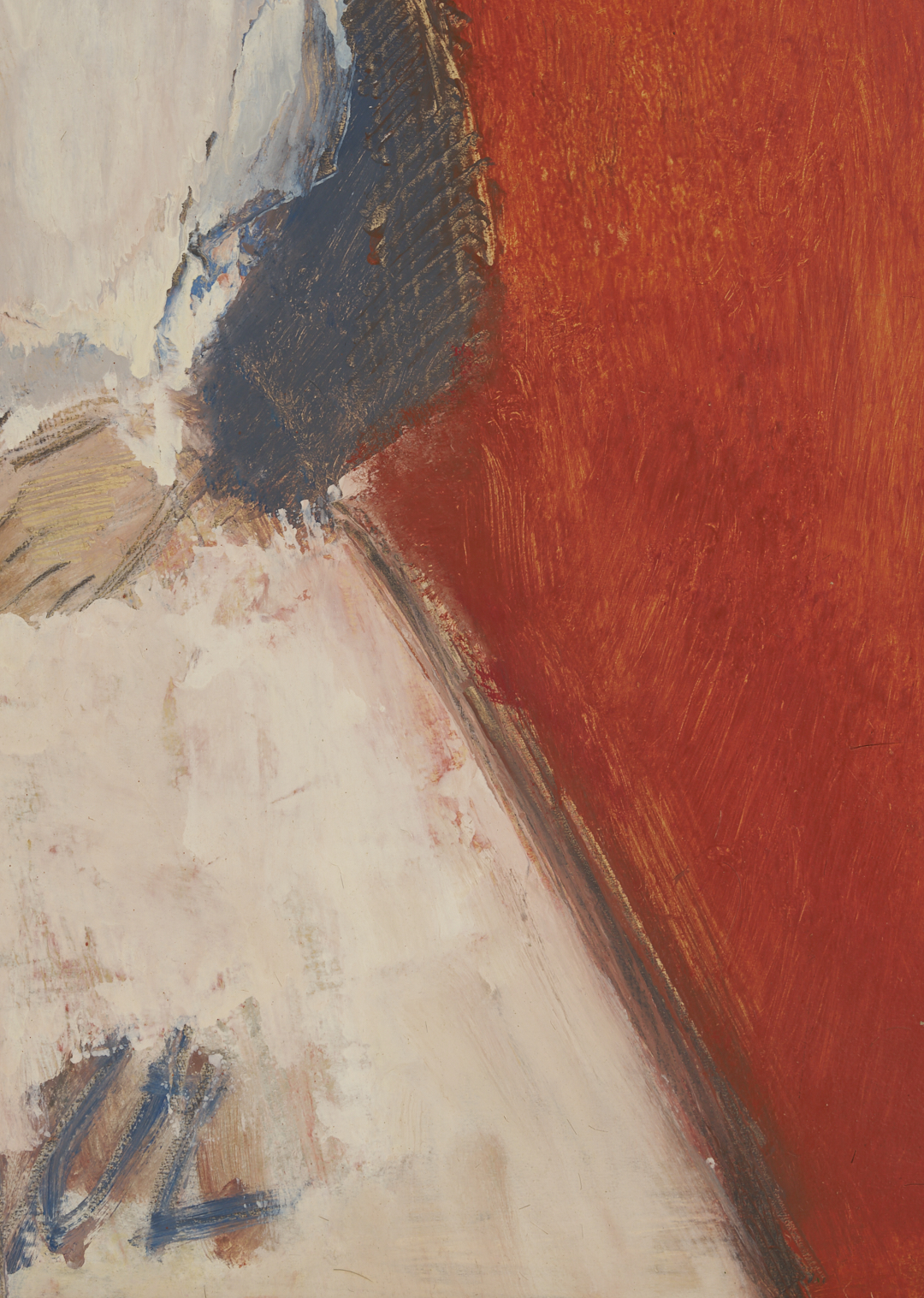 Charles Inzer (Tennessee, active late 20th c.), oil and pencil on board, modernist painting of a girl who wears a blue dress and white apron as she looks directly toward the viewer, set against a red background. Signed lower center. Housed in a giltwood frame with a linen liner. Sight: 22 in. H x 18 in. W. Frame: 24 3/4 in. H x 20 3/4 in. W.