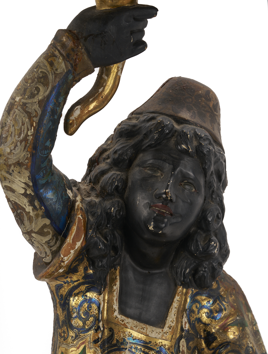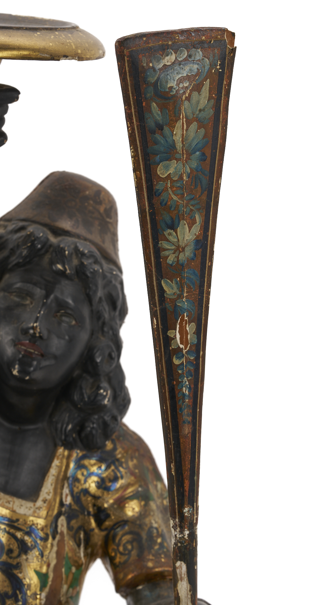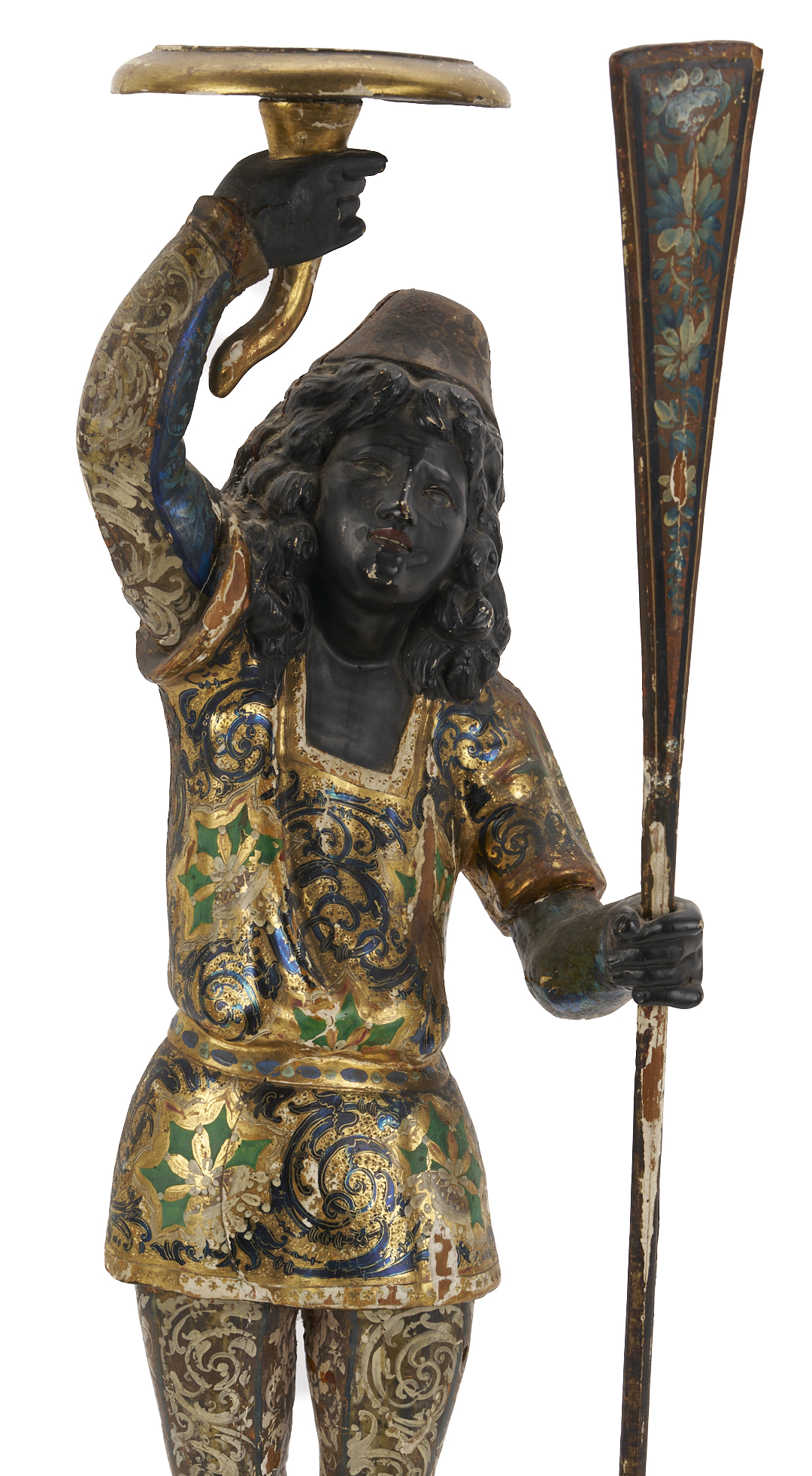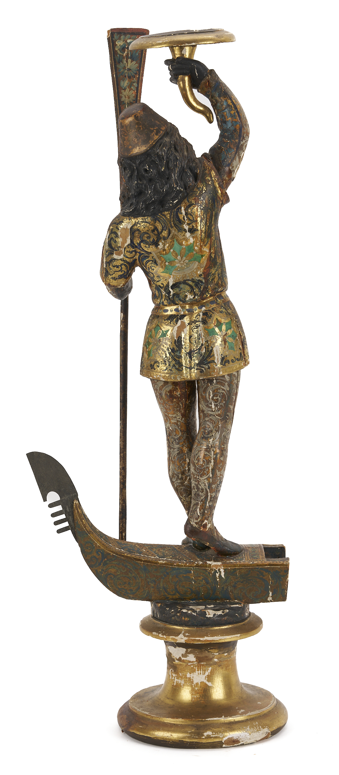 Continental school, likely Italian, carved wood polychrome and gilt blackamoor figure that depicts a young man who stands on a partial, diminutive Venetian gondola with metal fero da prova or prow ornament. His shoulder-length hair descends from beneath a fez with floral motif and he wears an ornately decorated tunic and tights. His left hand grips an oar and in his right hand he he raises a stand or candle pan. All atop a giltwood and polychrome base with floral decoration. 32 1/4 in. H x 12 in. W x 8 in. D. Late 19th century.