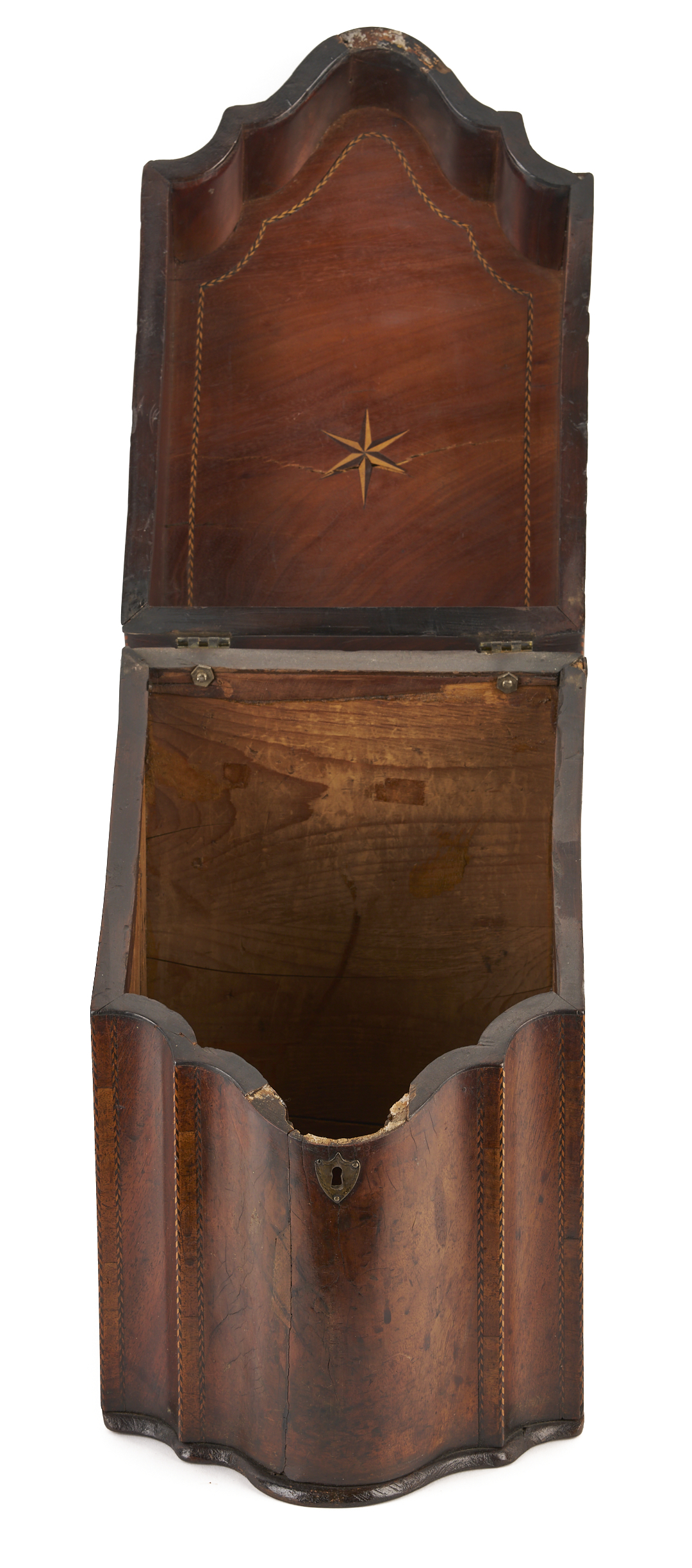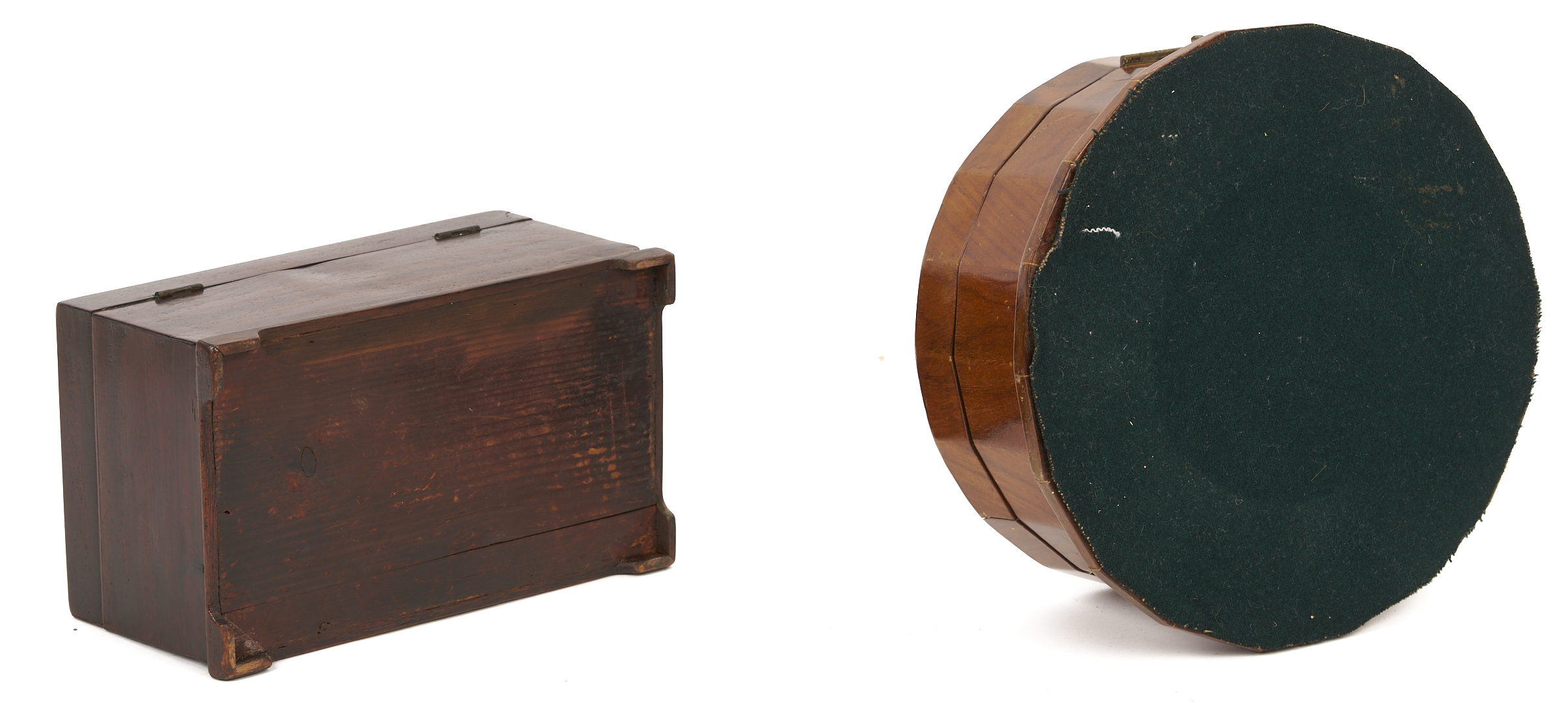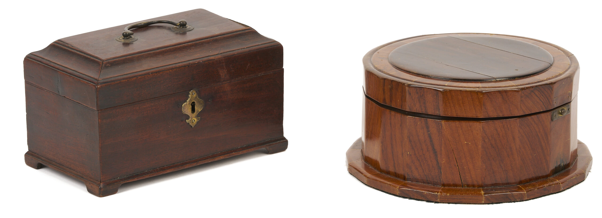 1st and 2nd items: Two (2) English antique wood boxes, including a George III mahogany tea caddy, paper lined, with a hinged lid, brass top handle, brass escutcheon, and bracket feet, 5 in. H x 8 in. W x 5 in. D, and a Victorian multi-faceted veneered sewing or jewelry box with a hinged lid, line inlay, interior mirror to the lid, and a velvet lining to the base, 4 1/2 in. H x 9 1/4 in. dia., both 19th century. 3rd item: George III inlaid Hepplewhite knife box, mahogany with fruitwood inlay and chevron inlaid banding to edges, serpentine front with hinged lid having an inlaid patera to exterior and inlaid to star to interior, metal hinges and metal shield-shaped escutcheon. 15 in. H x 9 in. W x 12 in. D. English, circa 1790.
