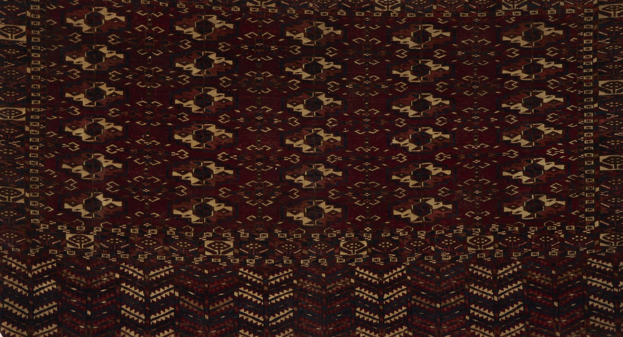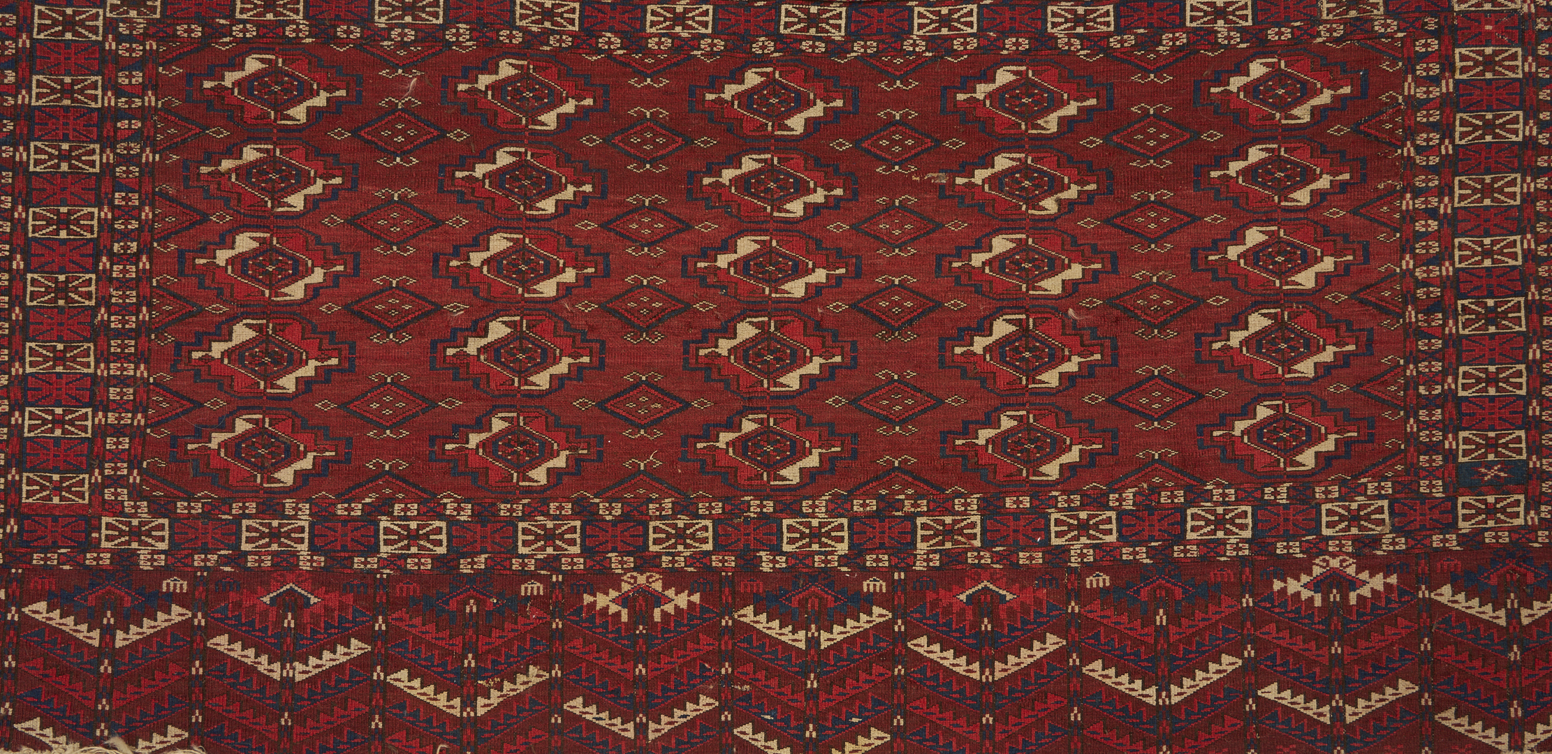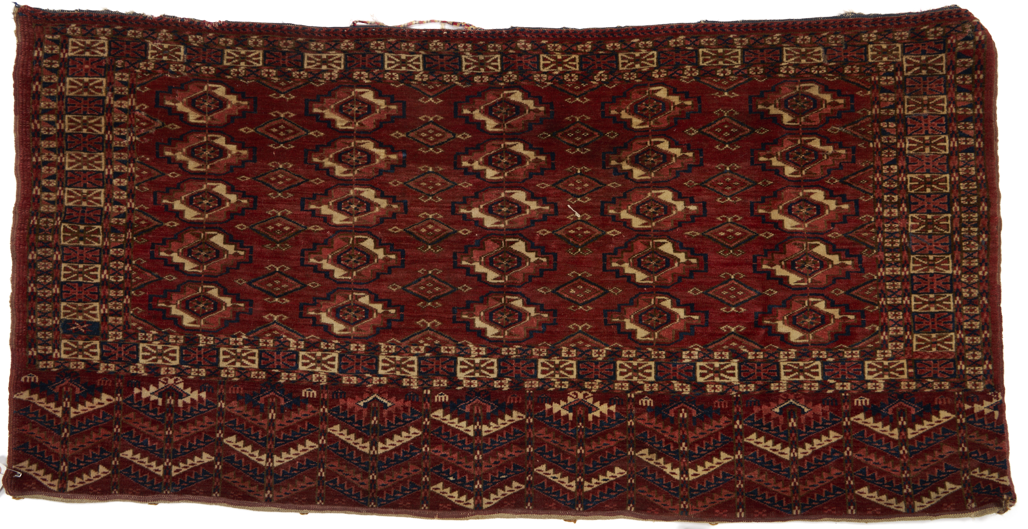 Two (2) Antique Tekke Turkman Torba area rugs, wool on wool, including one with 25 guls and the other with 30 guls. Both with lower elem panels with chevron decoration. Woven in colors of dark red, blue, rust, and cream. 3 ft. 10 in. x 2 ft. 3 in. and 3 ft. 8 in. x 2 ft. 1 in. 1st rug circa 1875 and 2nd rug circa 1870.