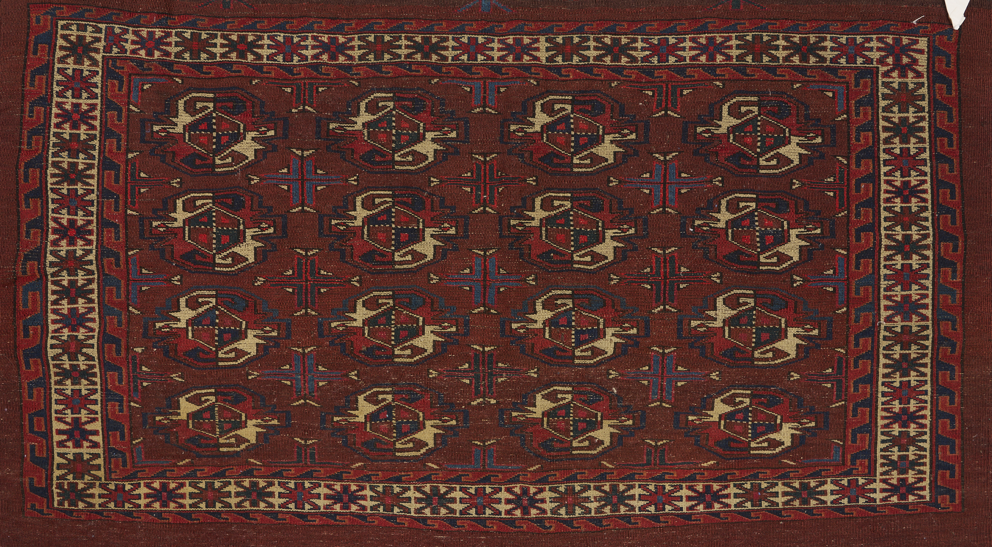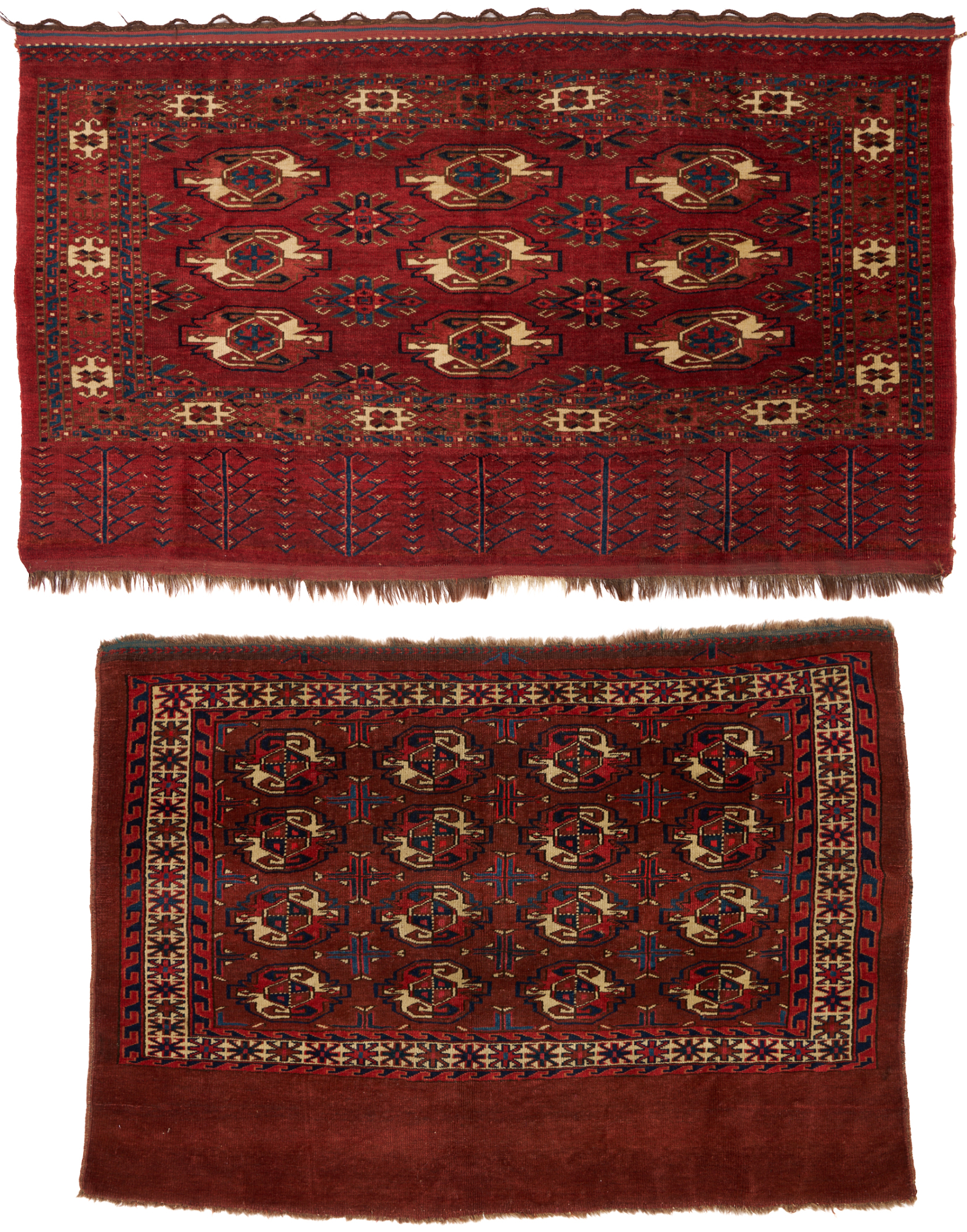 Two (2) antique Yomud or Yomut Turkmen Chuval rugs, wool on wool, including one with four rows of four guls on a stylized ground and plain lower elem panel within three primary borders, and one with three (3) rows of three guls with foliate lower elem panel within one primary border. Both rugs are woven in colors of red, blue, and cream. 4 ft. 9 in. x 2 ft. 10 in. and 4 ft. 1 in. x 2 ft. 10 in. Both circa 1890s.
