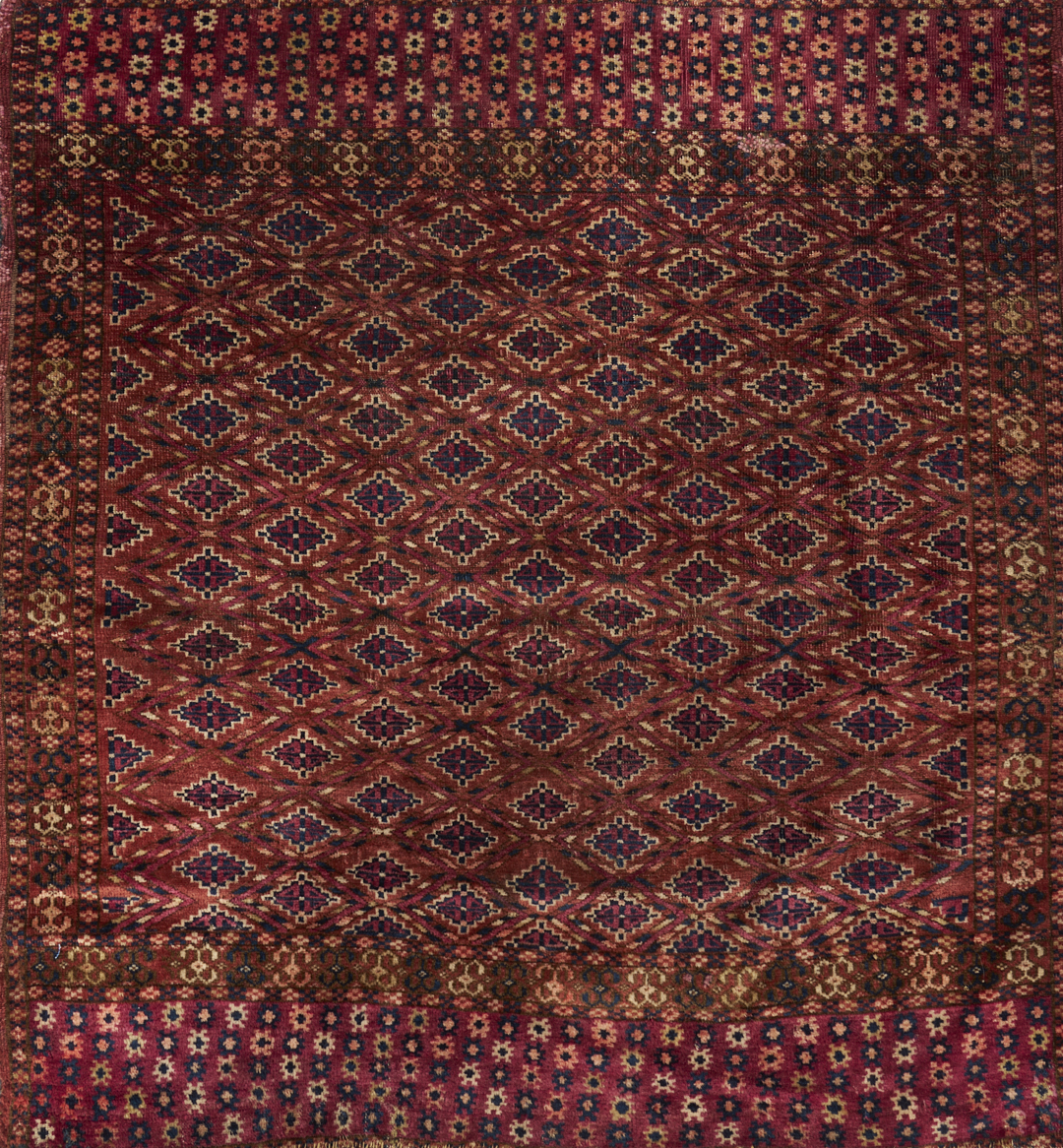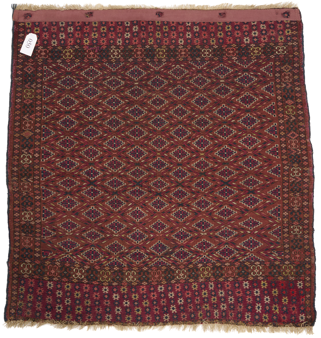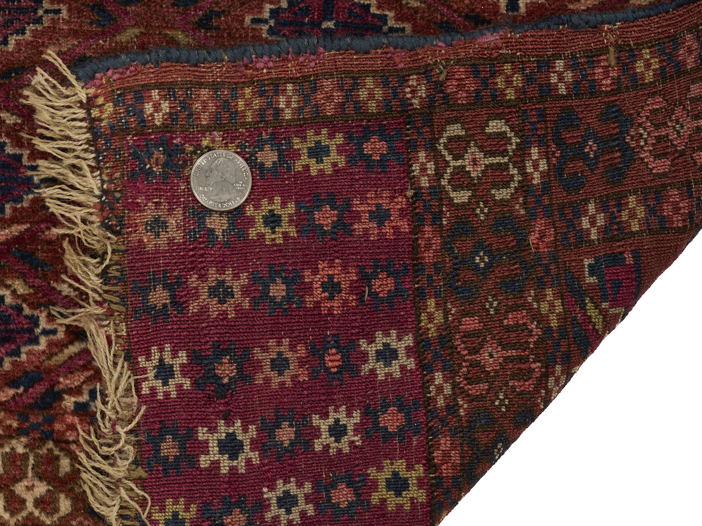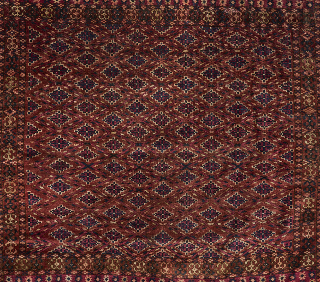 1st item: Antique Youmud or Yomut Turkmen rug, wool on wool, featuring an all-over stylized diamond design within a central red field, surrounded by three primary borders and floral element panels at each end. 3 ft.1 in. x 3 ft. 1 in. Circa 1900. 2nd item: Antique Yomud or Yomut Turkmen Ensi tribal rug, wool on wool, central cruciform design with four panels having geometric designs, within three primary borders, wide elem panels to one end with radiating diamond designs. Woven in red, blue, and cream colors. 4 ft. 9 in. x 4 ft. 1 in. Circa 1900.
