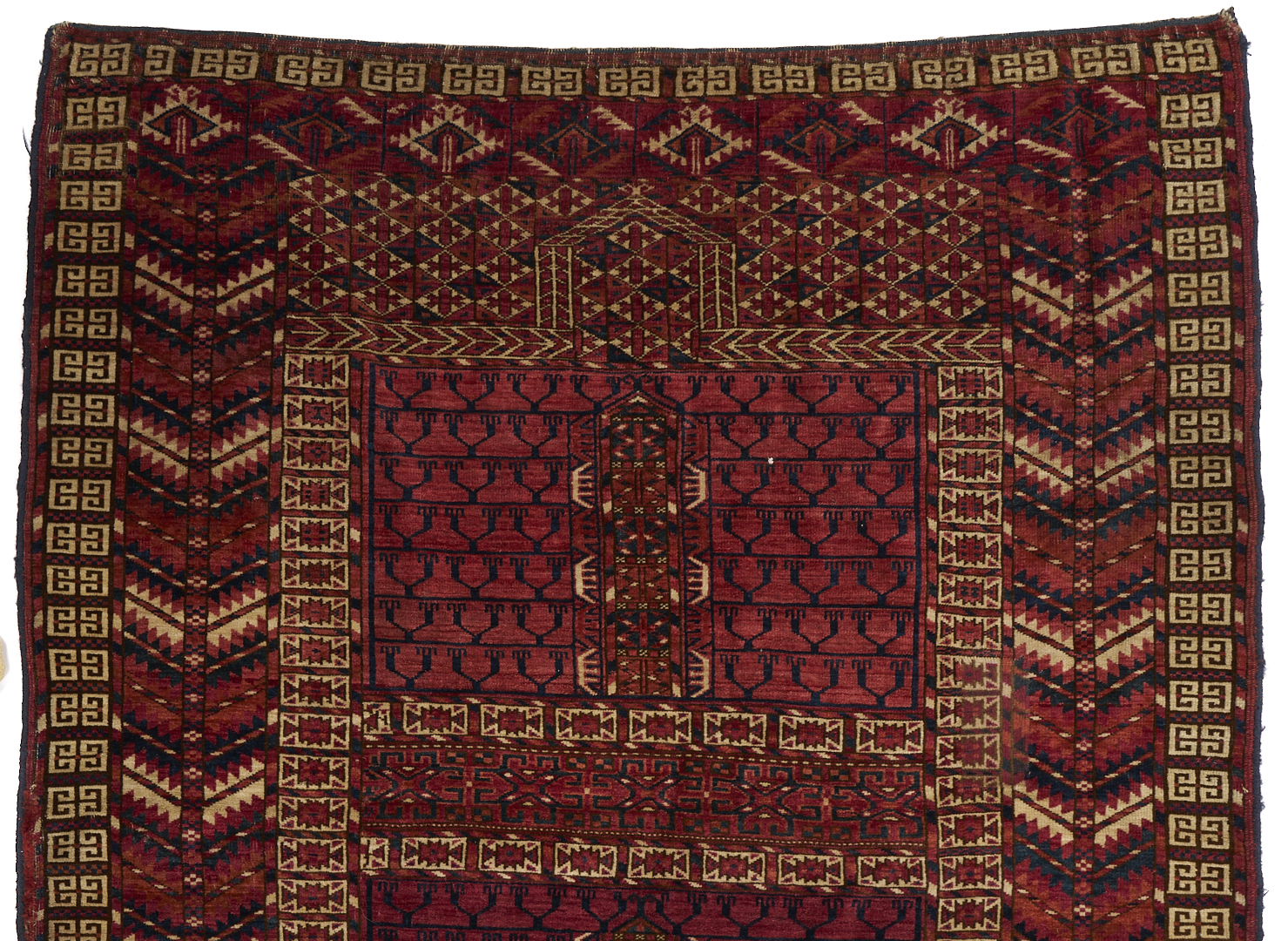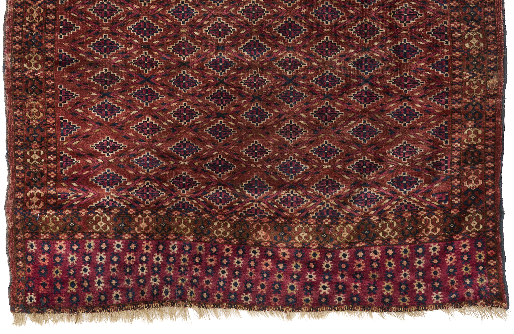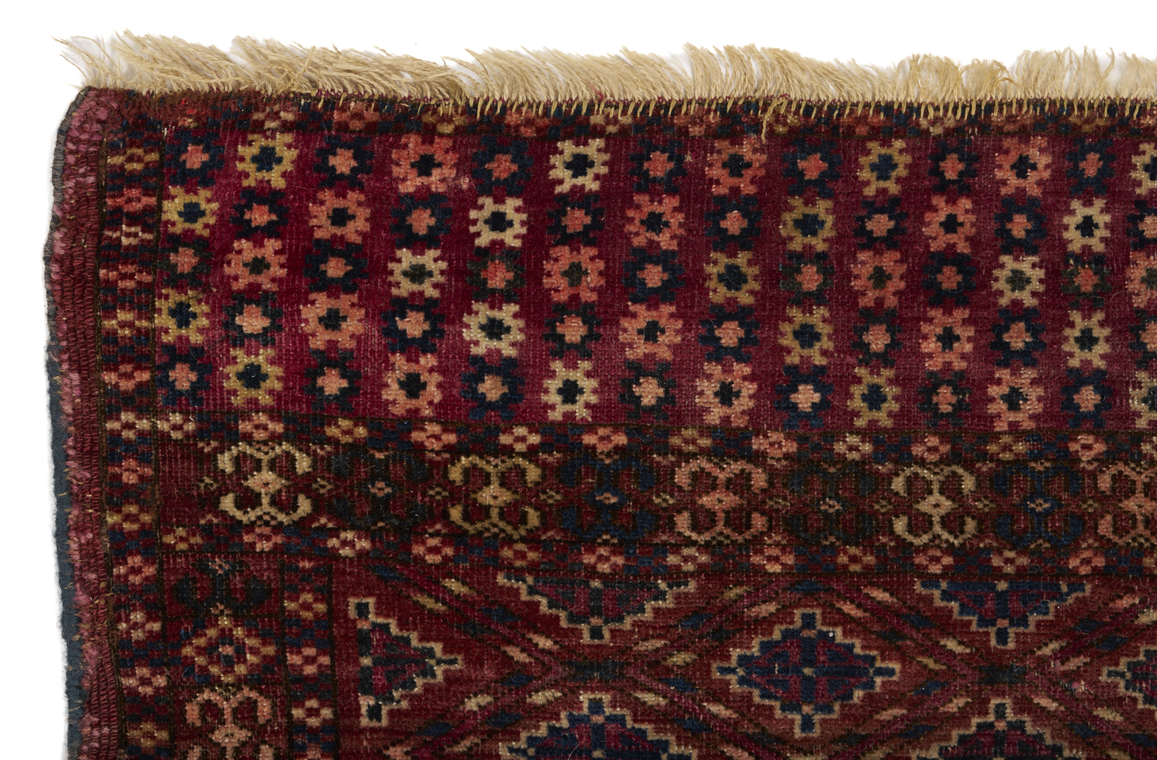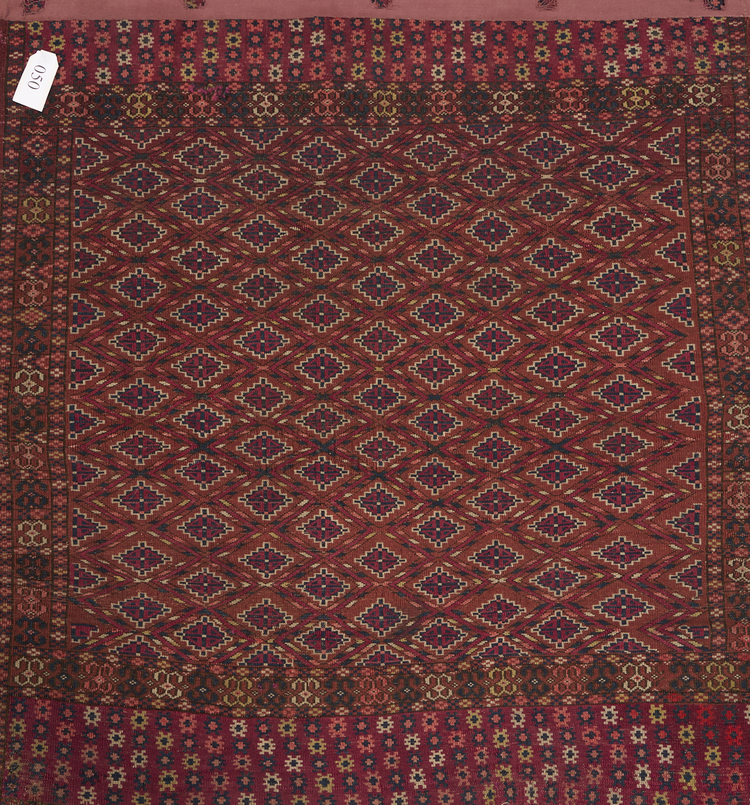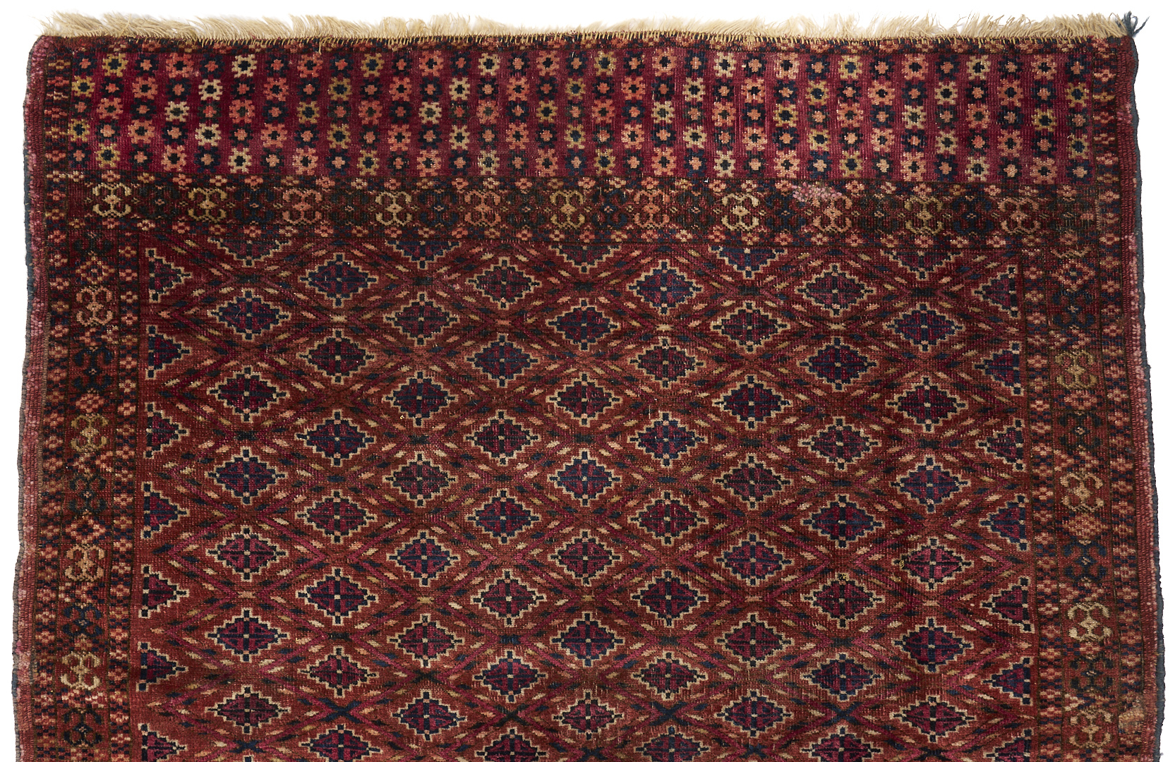 1st item: Antique Youmud or Yomut Turkmen rug, wool on wool, featuring an all-over stylized diamond design within a central red field, surrounded by three primary borders and floral element panels at each end. 3 ft.1 in. x 3 ft. 1 in. Circa 1900. 2nd item: Antique Yomud or Yomut Turkmen Ensi tribal rug, wool on wool, central cruciform design with four panels having geometric designs, within three primary borders, wide elem panels to one end with radiating diamond designs. Woven in red, blue, and cream colors. 4 ft. 9 in. x 4 ft. 1 in. Circa 1900.