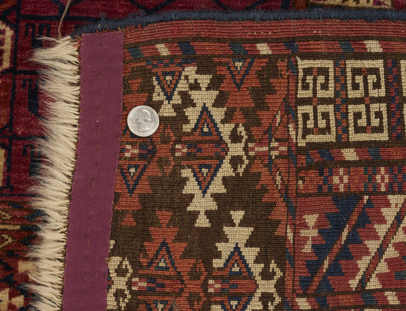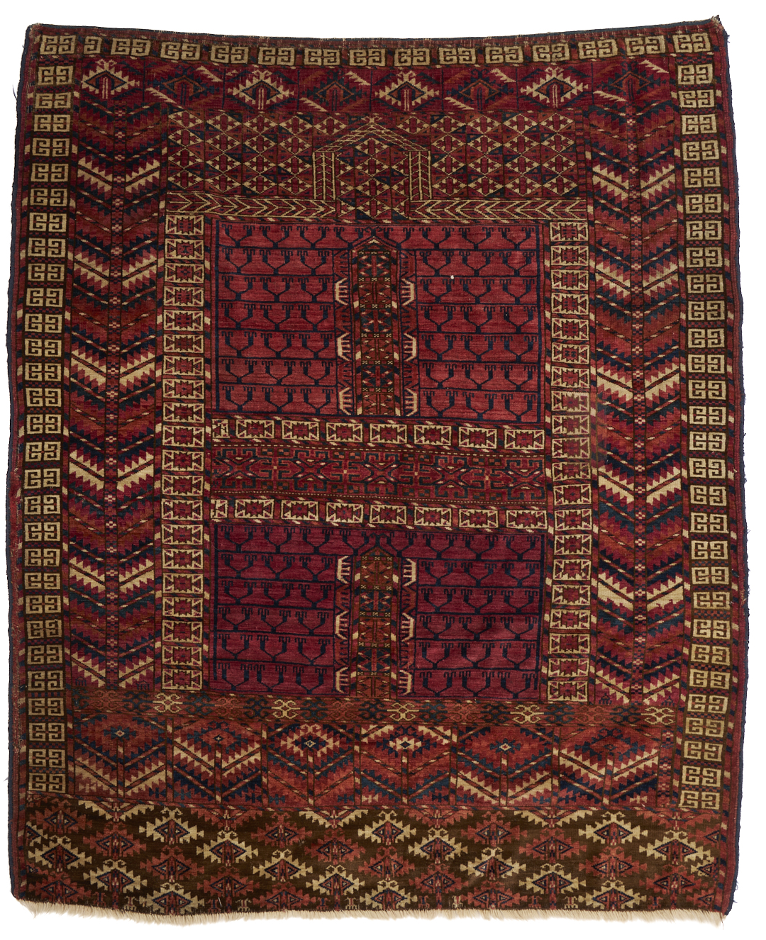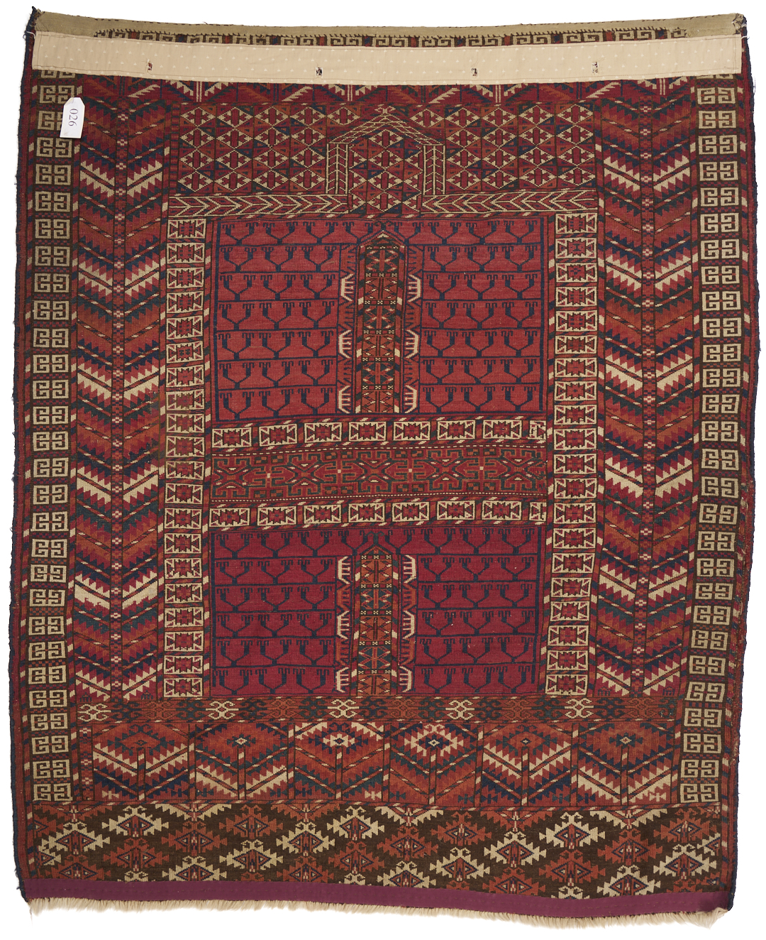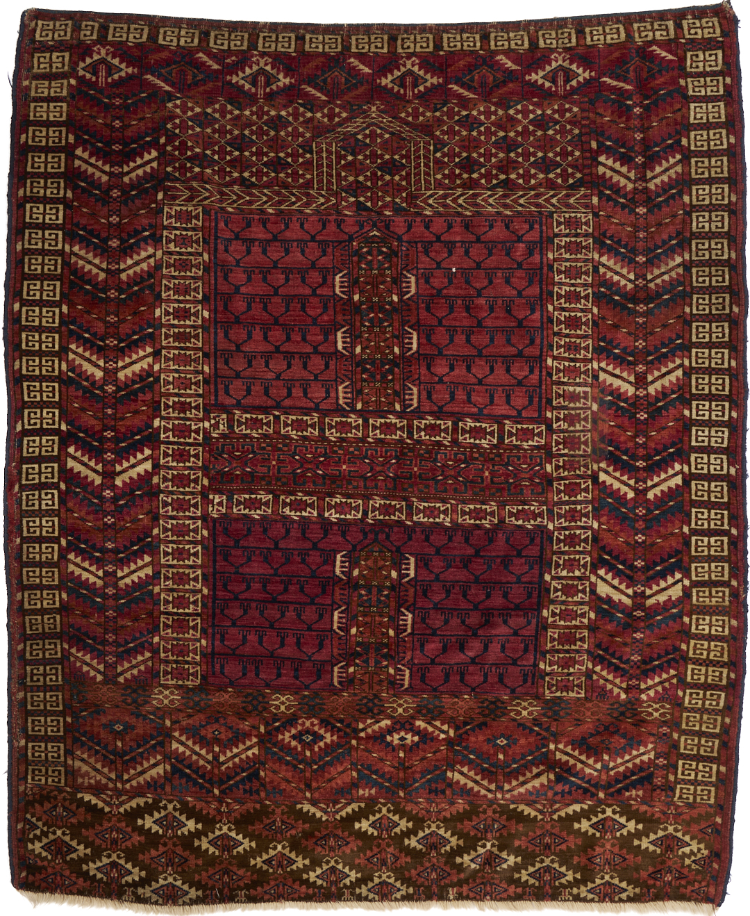 1st item: Antique Youmud or Yomut Turkmen rug, wool on wool, featuring an all-over stylized diamond design within a central red field, surrounded by three primary borders and floral element panels at each end. 3 ft.1 in. x 3 ft. 1 in. Circa 1900. 2nd item: Antique Yomud or Yomut Turkmen Ensi tribal rug, wool on wool, central cruciform design with four panels having geometric designs, within three primary borders, wide elem panels to one end with radiating diamond designs. Woven in red, blue, and cream colors. 4 ft. 9 in. x 4 ft. 1 in. Circa 1900.