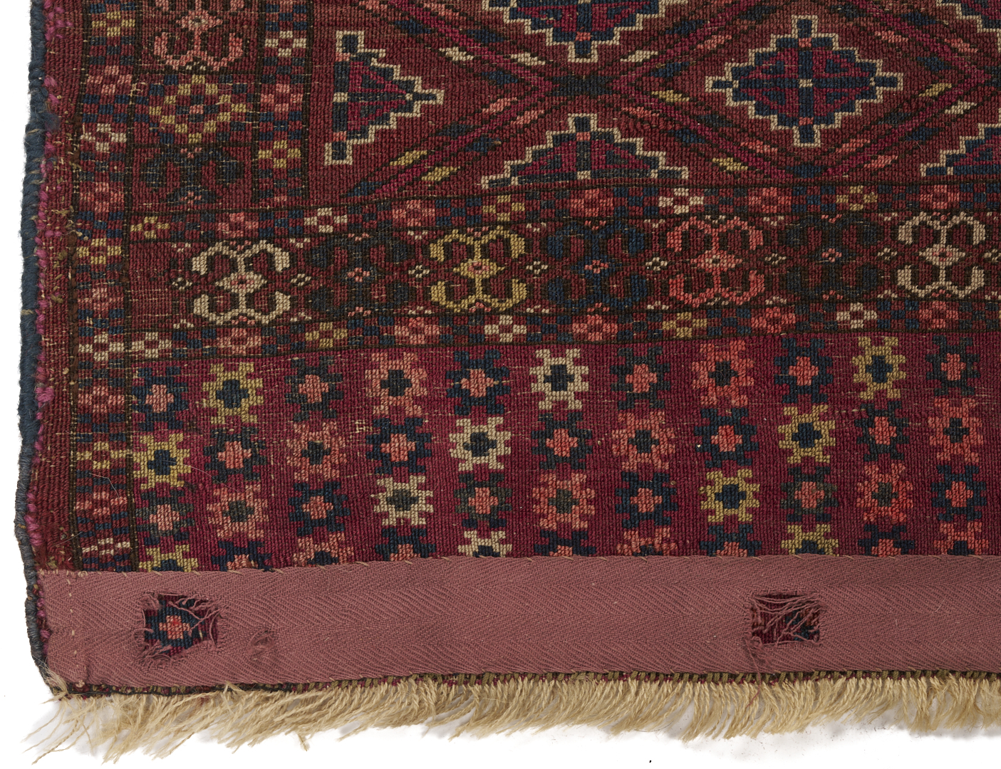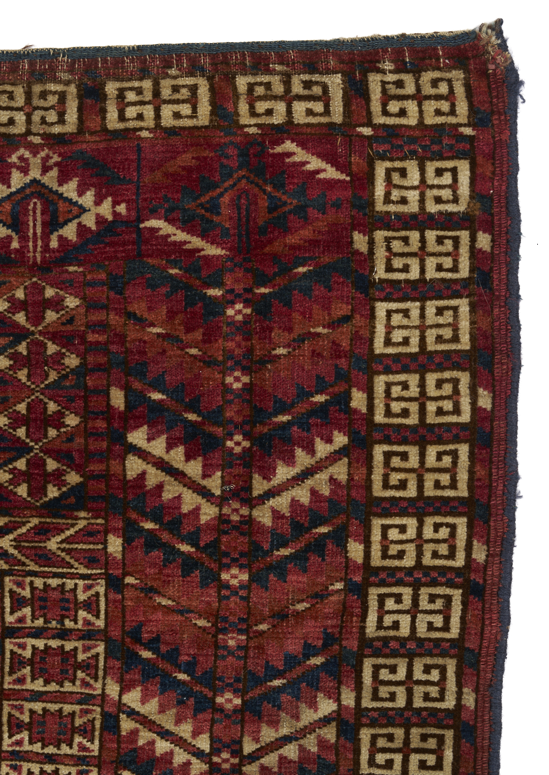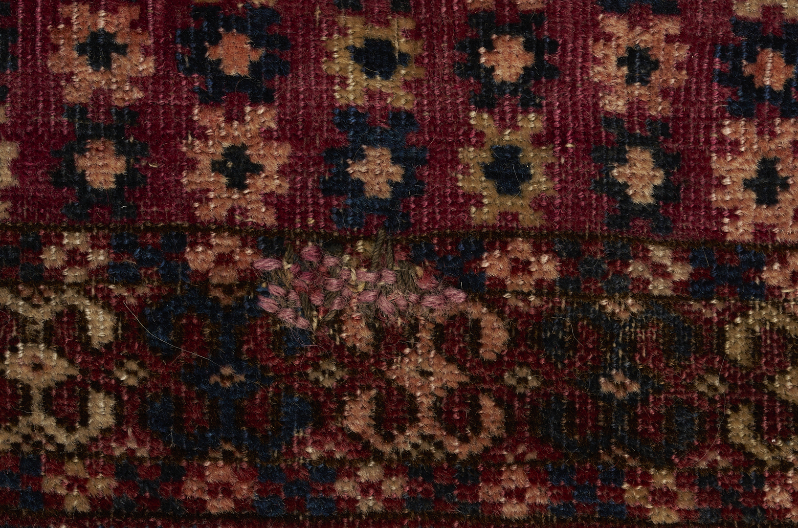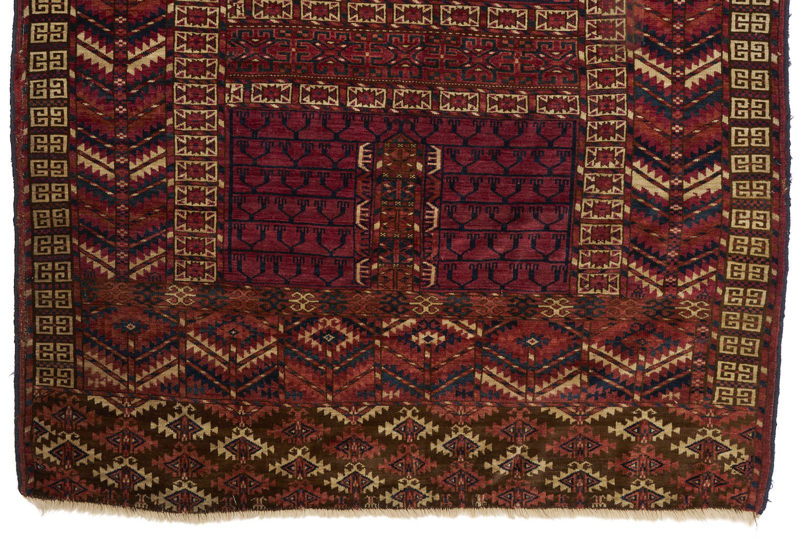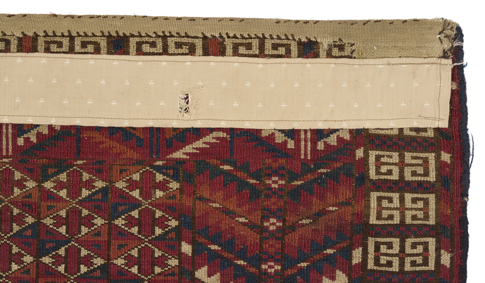 1st item: Antique Youmud or Yomut Turkmen rug, wool on wool, featuring an all-over stylized diamond design within a central red field, surrounded by three primary borders and floral element panels at each end. 3 ft.1 in. x 3 ft. 1 in. Circa 1900. 2nd item: Antique Yomud or Yomut Turkmen Ensi tribal rug, wool on wool, central cruciform design with four panels having geometric designs, within three primary borders, wide elem panels to one end with radiating diamond designs. Woven in red, blue, and cream colors. 4 ft. 9 in. x 4 ft. 1 in. Circa 1900.