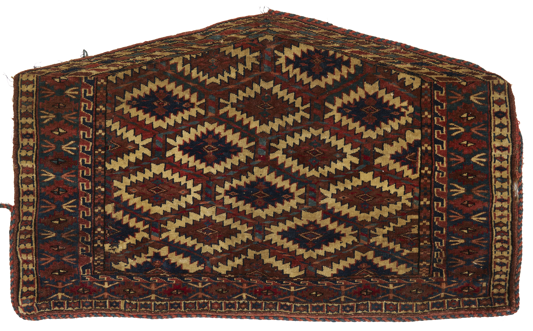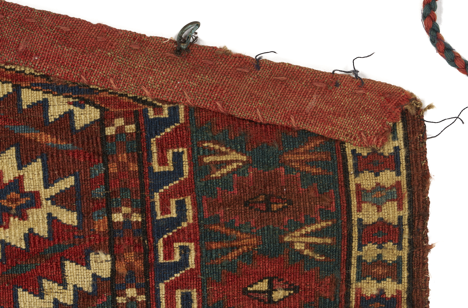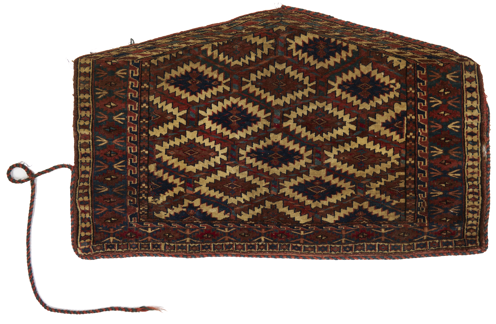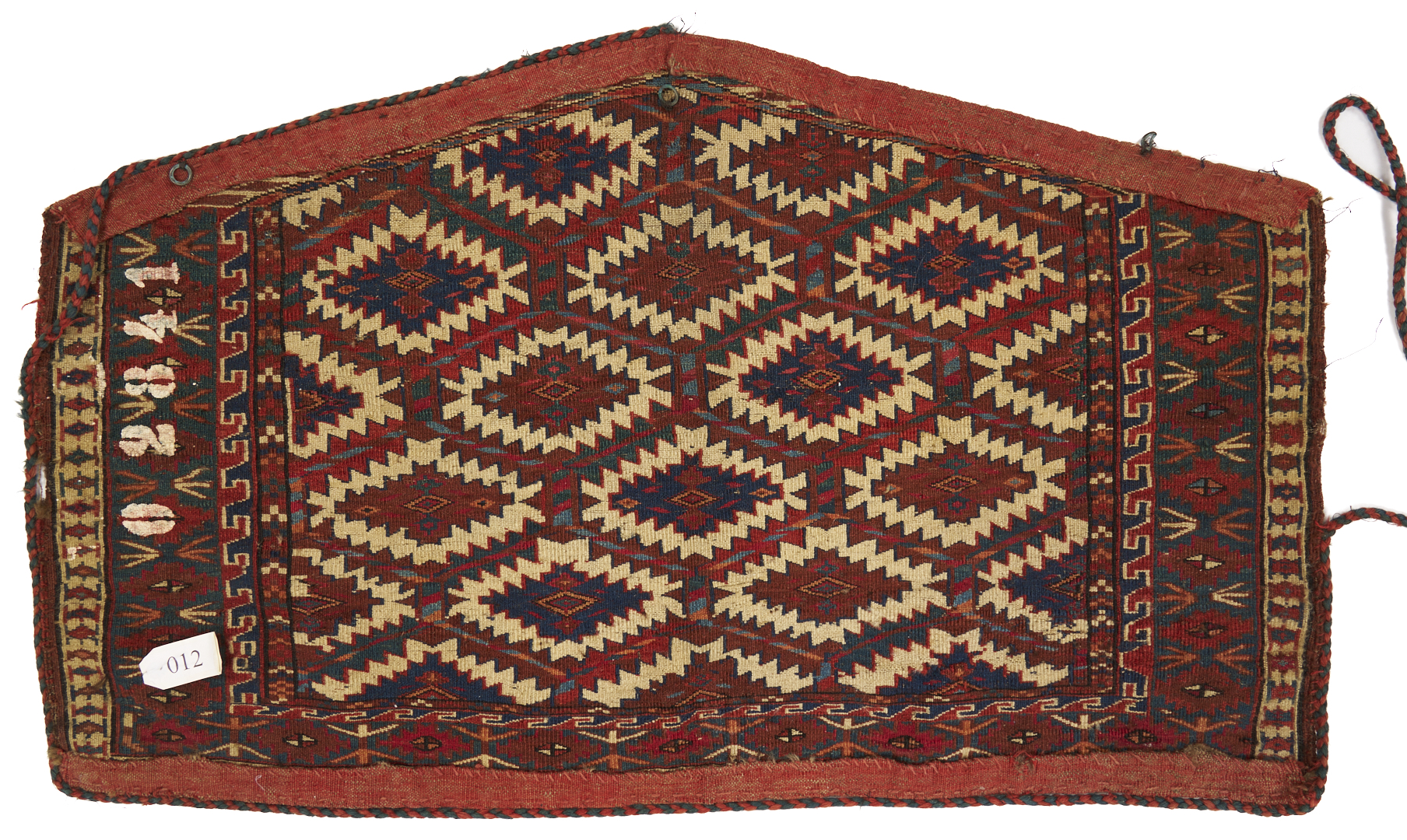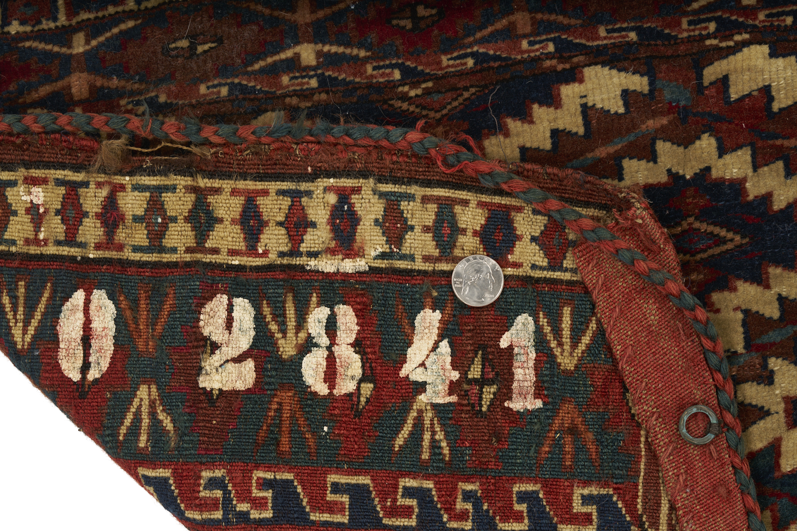 1st-2nd items: Two (2) antique Yomud or Yomut Turkmen Chuval rugs, wool on wool, both with gul designs on red fields within floral borders, woven in red, blue, and cream colors. 3 ft. 9 in. x 2 ft. 5 in. and 3 ft. 10 in. x 2 ft. 7 in. Both the last quarter 19th century. 3rd item: Antique Turkmen Yomud Asmalyk pentagonal weaving, wool on wool, with central diamond designs within four borders. 2 ft. 2 in. x 3 ft. 7 in. Last quarter 19th century.