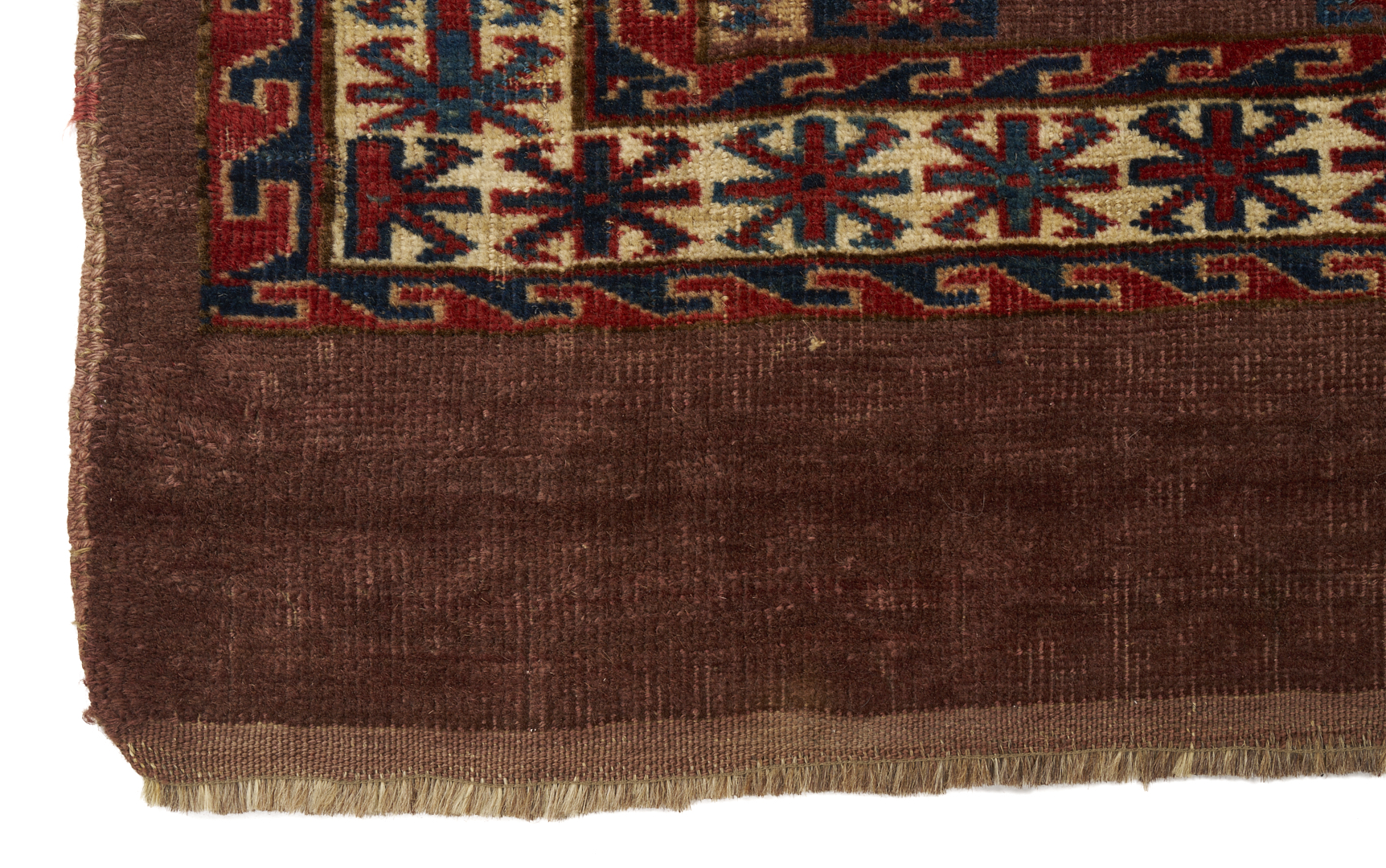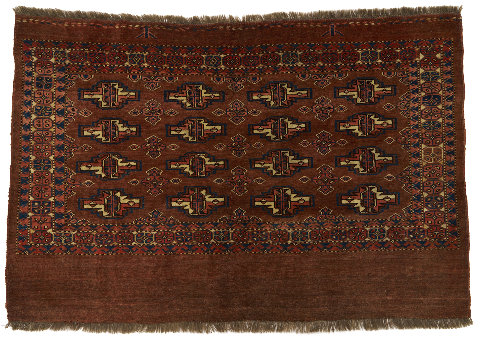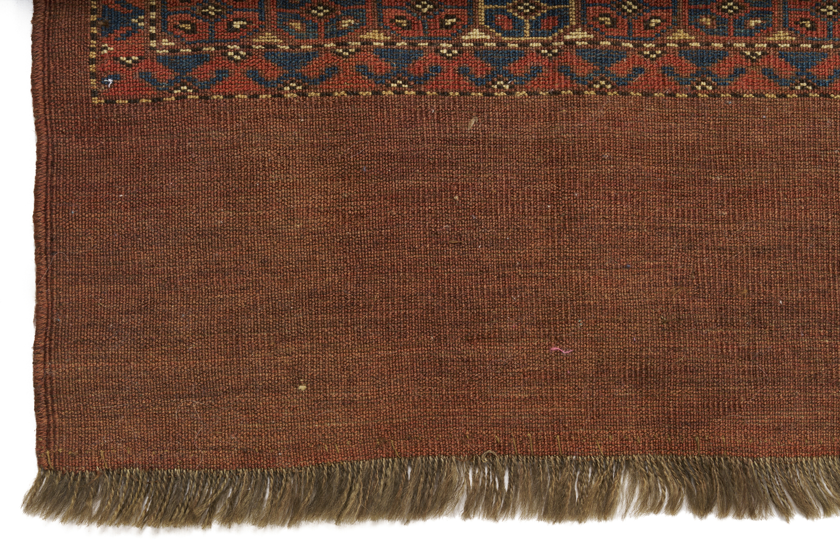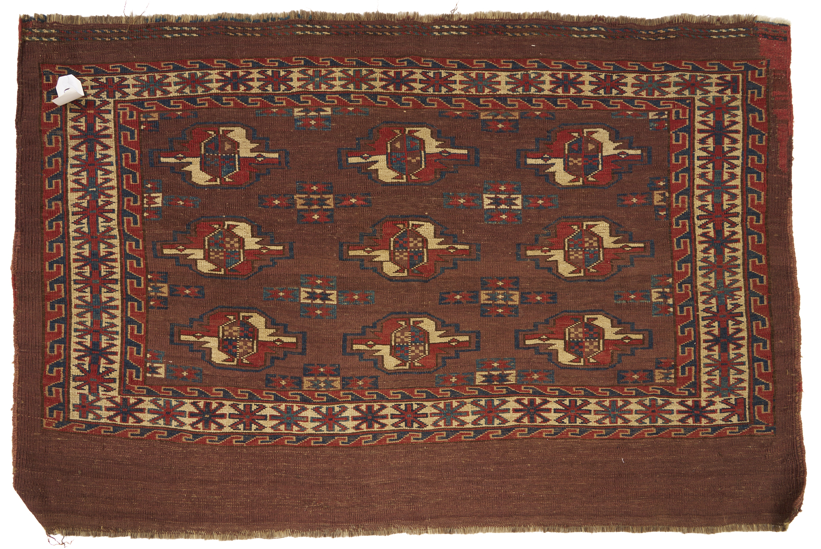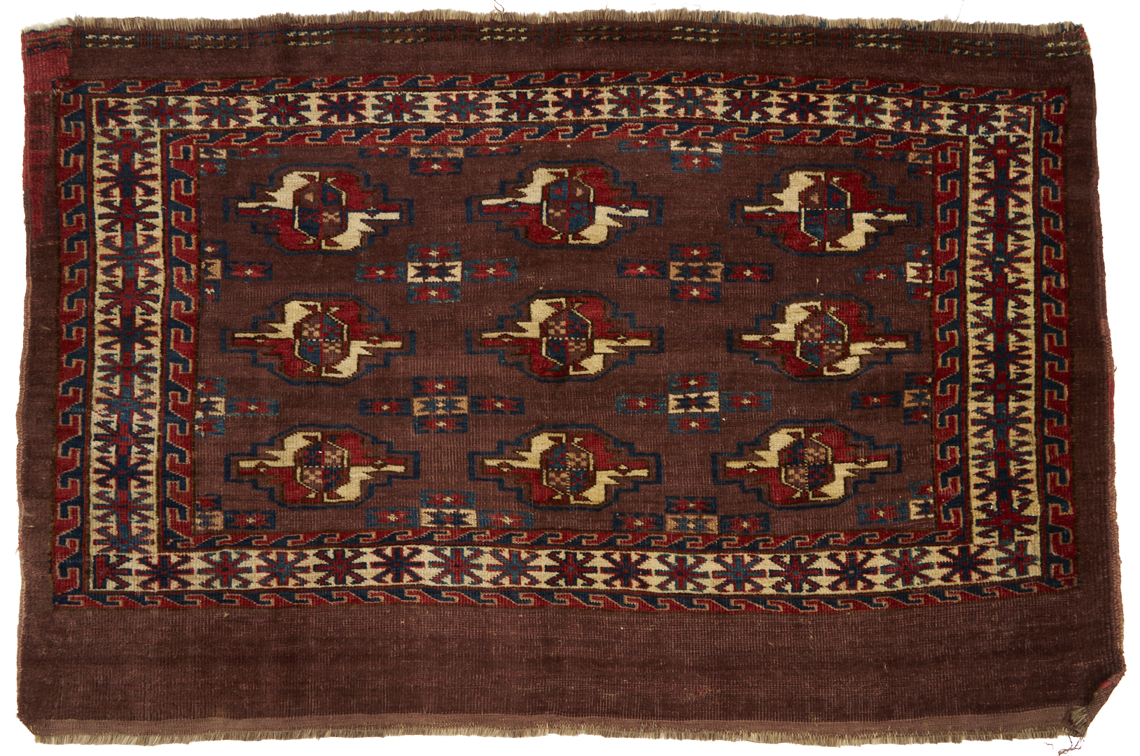 1st-2nd items: Two (2) antique Yomud or Yomut Turkmen Chuval rugs, wool on wool, both with gul designs on red fields within floral borders, woven in red, blue, and cream colors. 3 ft. 9 in. x 2 ft. 5 in. and 3 ft. 10 in. x 2 ft. 7 in. Both the last quarter 19th century. 3rd item: Antique Turkmen Yomud Asmalyk pentagonal weaving, wool on wool, with central diamond designs within four borders. 2 ft. 2 in. x 3 ft. 7 in. Last quarter 19th century.