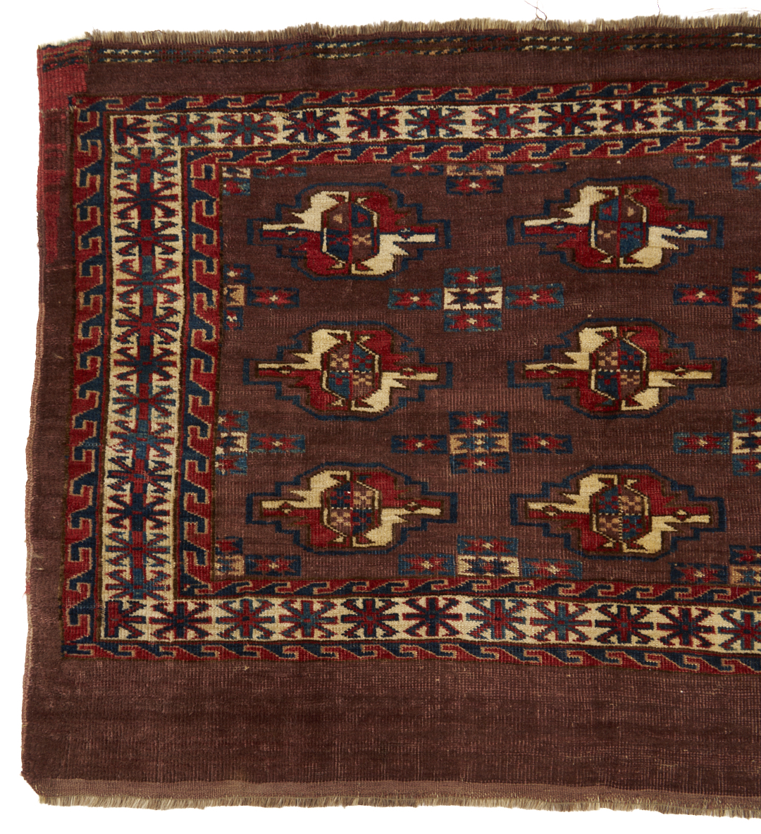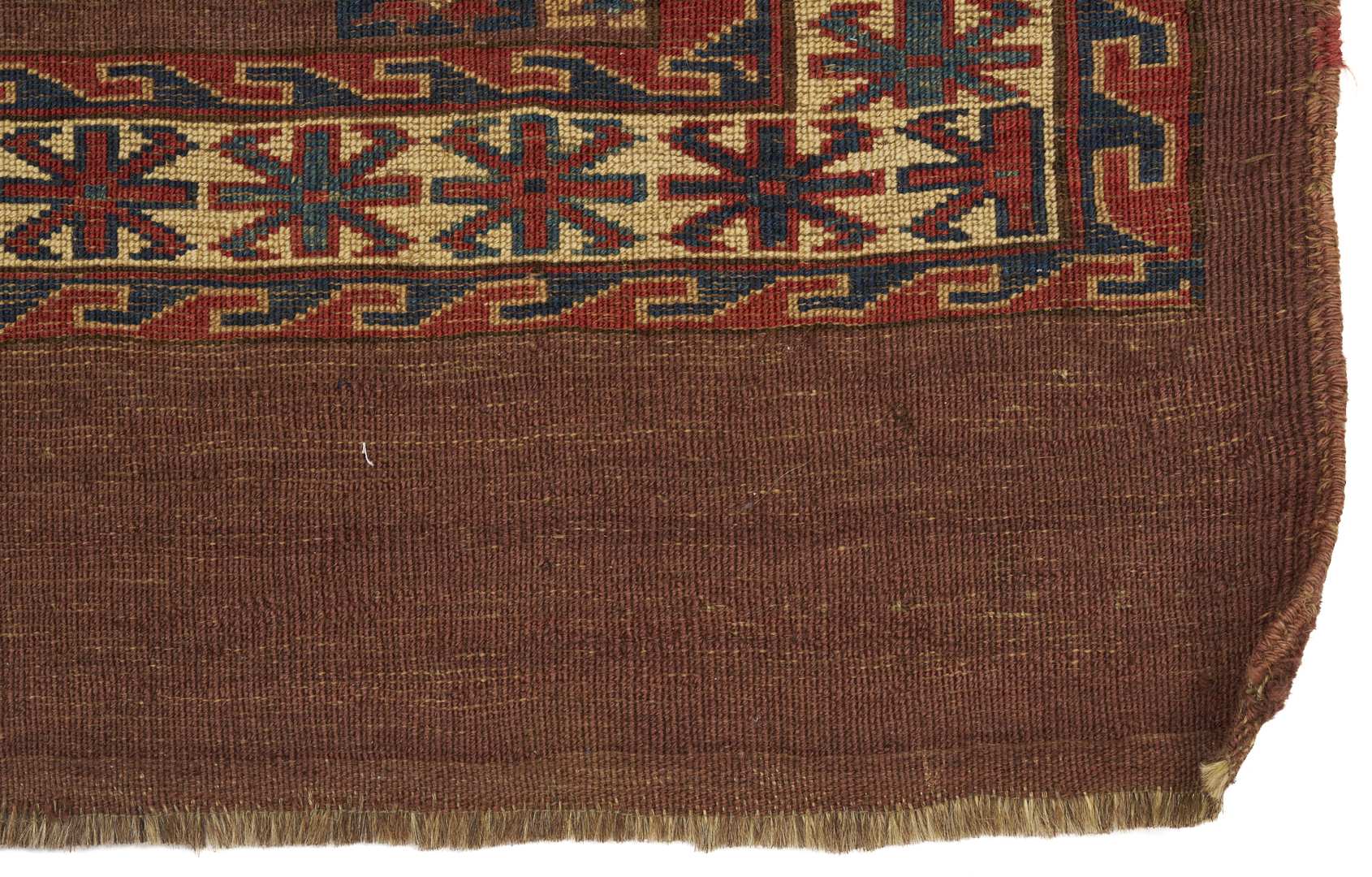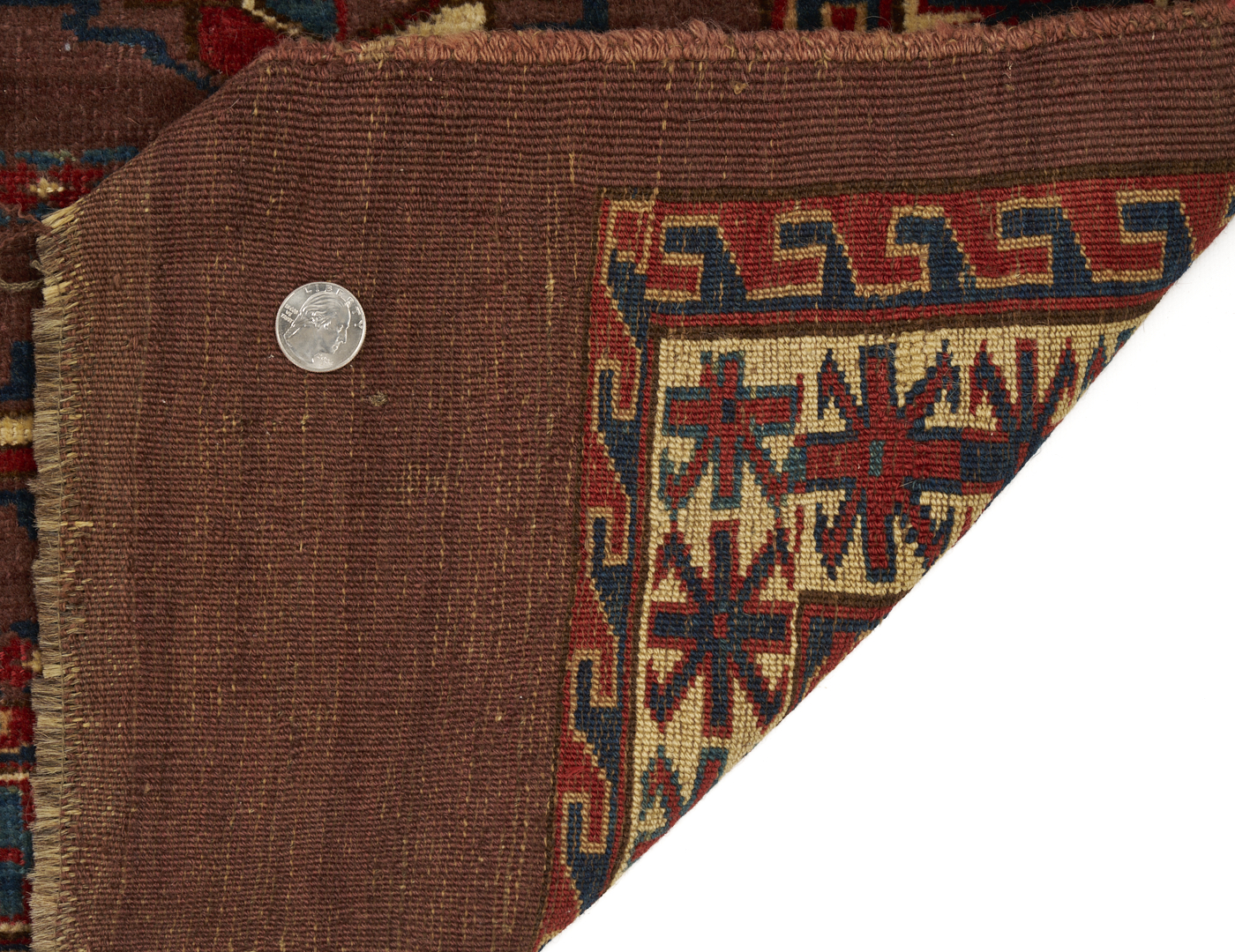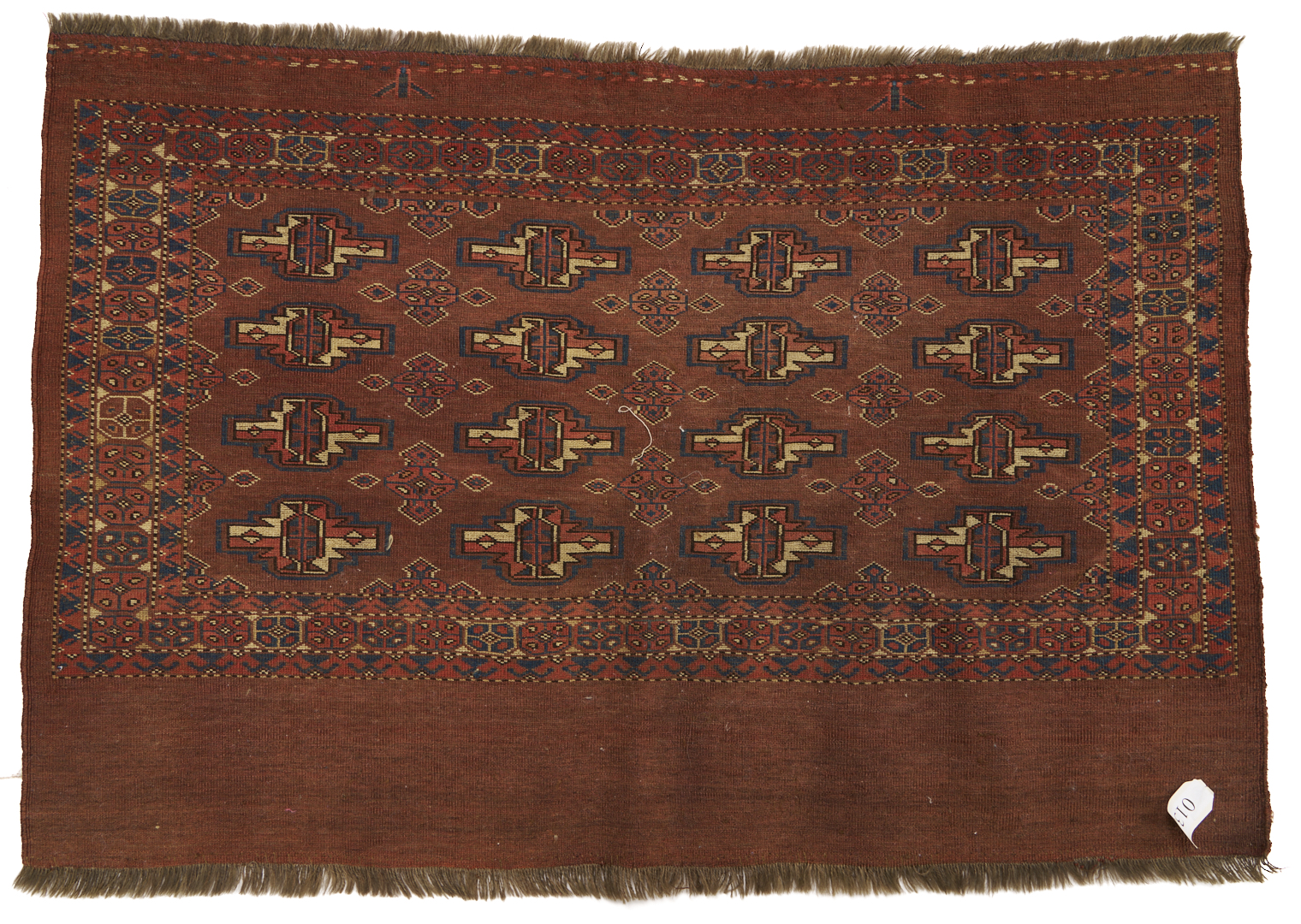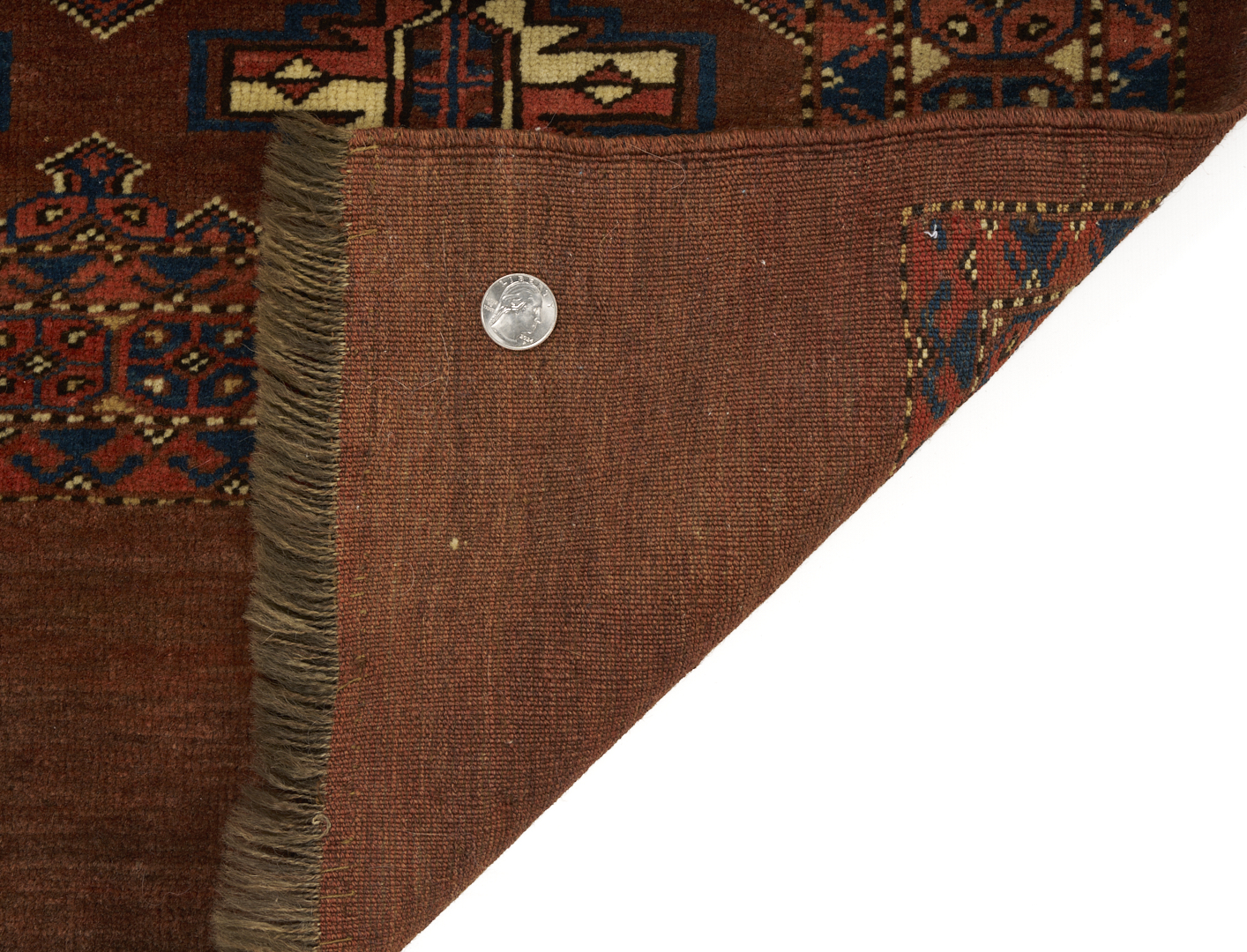 1st-2nd items: Two (2) antique Yomud or Yomut Turkmen Chuval rugs, wool on wool, both with gul designs on red fields within floral borders, woven in red, blue, and cream colors. 3 ft. 9 in. x 2 ft. 5 in. and 3 ft. 10 in. x 2 ft. 7 in. Both the last quarter 19th century. 3rd item: Antique Turkmen Yomud Asmalyk pentagonal weaving, wool on wool, with central diamond designs within four borders. 2 ft. 2 in. x 3 ft. 7 in. Last quarter 19th century.