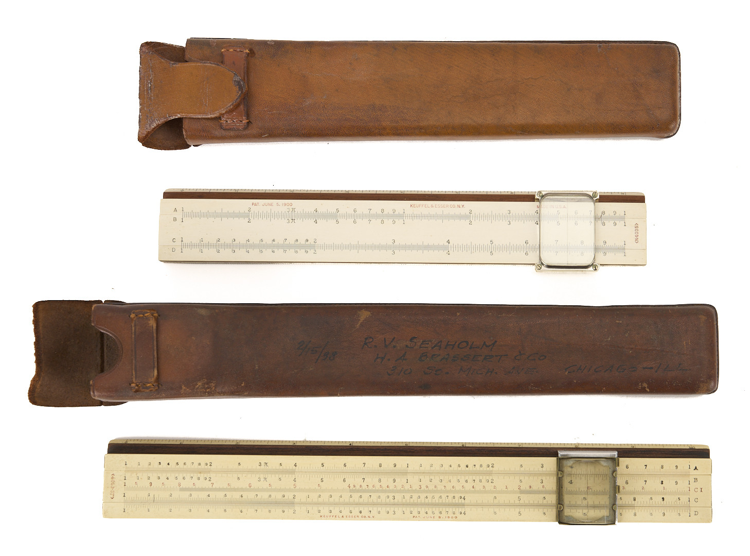 2nd item: K&E 4053-3F Duplex slide rule with magnifier and fitted case ca. 1909-1914. Mahogany frame with celluloid laminated surfaces. The “F” in the model number designates that this 10 inch rule is Finely Divided with the same markings as their 20-inch slide rules; the L scale is marked from 0 to 1000. Metal framed and lined cursor with magnifier attached, marked “Patented June 20, 1922”. Overall Length 10 5/8 in.